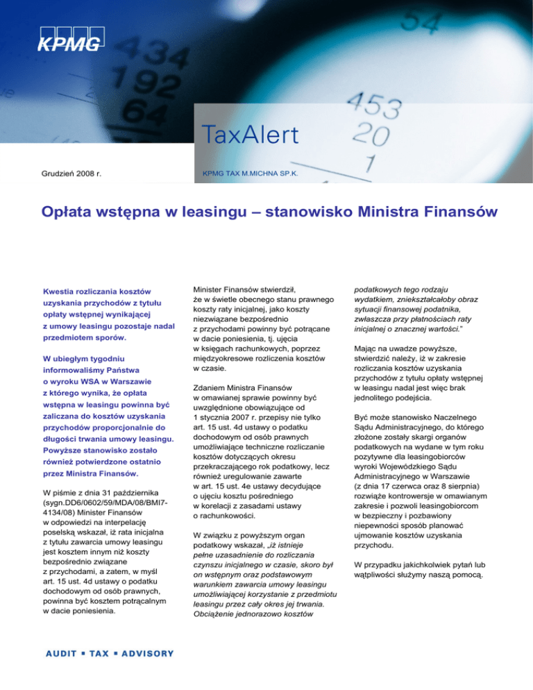 Grudzień 2008 r. KPMG TAX M.MICHNA SP.K. Opłata wstępna w leasingu – stanowisko Ministra Finansów Kwestia rozliczania kosztów uzyskania przychodów z tytułu opłaty wstępnej wynikającej z umowy leasingu pozostaje nadal przedmiotem sporów. W ubiegłym tygodniu informowaliśmy Państwa o wyroku WSA w Warszawie z którego wynika, że opłata wstępna w leasingu powinna być zaliczana do kosztów uzyskania przychodów proporcjonalnie do długości trwania umowy leasingu. Powyższe stanowisko zostało również potwierdzone ostatnio przez Ministra Finansów. W piśmie z dnia 31 października (sygn.DD6/0602/59/MDA/08/BMI74134/08) Minister Finansów w odpowiedzi na interpelację poselską wskazał, iż rata inicjalna z tytułu zawarcia umowy leasingu jest kosztem innym niż koszty bezpośrednio związane z przychodami, a zatem, w myśl art. 15 ust. 4d ustawy o podatku dochodowym od osób prawnych, powinna być kosztem potrącalnym w dacie poniesienia. Minister Finansów stwierdził, że w świetle obecnego stanu prawnego koszty raty inicjalnej, jako koszty niezwiązane bezpośrednio z przychodami powinny być potrącane w dacie poniesienia, tj. ujęcia w księgach rachunkowych, poprzez międzyokresowe rozliczenia kosztów w czasie. Zdaniem Ministra Finansów w omawianej sprawie powinny być uwzględnione obowiązujące od 1 stycznia 2007 r. przepisy nie tylko art. 15 ust. 4d ustawy o podatku dochodowym od osób prawnych umożliwiające techniczne rozliczanie kosztów dotyczących okresu przekraczającego rok podatkowy, lecz również uregulowanie zawarte w art. 15 ust. 4e ustawy decydujące o ujęciu kosztu pośredniego w korelacji z zasadami ustawy o rachunkowości. W związku z powyższym organ podatkowy wskazał, „iż istnieje pełne uzasadnienie do rozliczania czynszu inicjalnego w czasie, skoro był on wstępnym oraz podstawowym warunkiem zawarcia umowy leasingu umożliwiającej korzystanie z przedmiotu leasingu przez cały okres jej trwania. Obciążenie jednorazowo kosztów podatkowych tego rodzaju wydatkiem, zniekształcałoby obraz sytuacji finansowej podatnika, zwłaszcza przy płatnościach raty inicjalnej o znacznej wartości.” Mając na uwadze powyższe, stwierdzić należy, iż w zakresie rozliczania kosztów uzyskania przychodów z tytułu opłaty wstępnej w leasingu nadal jest więc brak jednolitego podejścia. Być może stanowisko Naczelnego Sądu Administracyjnego, do którego złożone zostały skargi organów podatkowych na wydane w tym roku pozytywne dla leasingobiorców wyroki Wojewódzkiego Sądu Administracyjnego w Warszawie (z dnia 17 czerwca oraz 8 sierpnia) rozwiąże kontrowersje w omawianym zakresie i pozwoli leasingobiorcom w bezpieczny i pozbawiony niepewności sposób planować ujmowanie kosztów uzyskania przychodu. W przypadku jakichkolwiek pytań lub wątpliwości służymy naszą pomocą. 2 kpmg.pl Kontakt Biura KPMG Grzegorz Jaszczuk Partner Tel.: + 48 (22) 528 11 83 Faks: + 48 (22) 528 11 59 [email protected] Biuro w Warszawie Biuro we Wrocławiu ul. Chłodna 51 00-867 Warszawa Tel.: +48 (22) 528 11 65-71 Faks: +48 (22) 528 11 59 [email protected] ul. Bema 2 50-265 Wrocław Tel.: +48 (71) 370 49 00 Faks: +48 (71) 370 49 01 [email protected] Biuro w Krakowie Biuro w Gdańsku al. Armii Krajowej 18 30-150 Kraków Tel.: +48 (12) 424 94 00 Faks: +48 (12) 424 94 01 [email protected] ul. Piwna 28-31 80-831 Gdańsk Tel.: +48 (58) 321 96 00 Faks: +48 (58) 321 96 01 [email protected] Biuro w Poznaniu Biuro w Katowicach ul. Roosevelta 18 60-829 Poznań Tel.: +48 (61) 845 46 00 Faks: +48 (61) 845 46 01 [email protected] ul. Powstańców 43 40-024 Katowice Tel.: +48 (32) 200 65 05 Faks: +48 (32) 200 65 10 [email protected] Joanna Krzemińska Senior Manager Tel.:+ 48 (22) 528 10 02 Faks: + 48 (22) 528 11 59 [email protected] Informacje zawarte w niniejszej publikacji mają charakter ogólny i nie dotyczą sytuacji konkretnej firmy. Ze względu na szybkość zmian zachodzących w polskim prawodawstwie prosimy o upewnienie się w dniu zapoznania się z niniejszą publikacją, czy informacje w niej zawarte są wciąż aktualne. Przed podjęciem konkretnych decyzji proponujemy skonsultowanie ich z naszymi doradcami. Nazwa i logo KPMG są zastrzeżonymi znakami towarowymi KPMG International, podmiotu prawa szwajcarskiego. © 2008 KPMG Tax M.Michna sp.k. jest polską spółką komandytową i członkiem sieci KPMG składającej się z niezależnych spółek członkowskich stowarzyszonych z KPMG International, podmiotem prawa szwajcarskiego. Wszelkie prawa zastrzeżone.