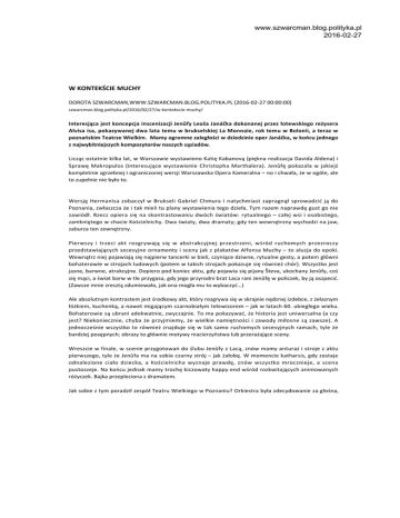www.szwarcman.blog.polityka.pl 2016-02-27 W KONTEKŚCIE MUCHY DOROTA SZWARCMAN,WWW.SZWARCMAN.BLOG.POLITYKA.PL (2016-02-27 00:00:00) szwarcman.blog.polityka.pl/2016/02/27/w-kontekscie-muchy/ Interesjąca jest koncepcja inscenizacji Jenůfy Leoša Janáčka dokonanej przez łotewskiego reżysera Alvisa isa, pokazywanej dwa lata temu w brukselskiej La Monnaie, rok temu w Bolonii, a teraz w poznańskim Teatrze Wielkim. Mamy ogromne zaległości w dziedzinie oper Janáčka, w końcu jednego z najwybitniejszych kompozytorów naszych sąsiadów. Licząc ostatnie kilka lat, w Warszawie wystawiono Katię Kabanovą (piękna realizacja Davida Aldena) i Sprawę Makropulos (interesujące wystawienie Christopha Marthalera). Jenůfę pokazała w jakiejś kompletnie zgrzebnej i ograniczonej wersji Warszawska Opera Kameralna – no i chwała, że w ogóle, ale to zupełnie nie było to. Wersję Hermanisa zobaczył w Brukseli Gabriel Chmura i natychmiast zapragnął sprowadzić ją do Poznania, zwłaszcza że i tak mieli tu plany wystawienia tego dzieła. Tym razem naprawdę gust go nie zawiódł. Rzecz opiera się na skontrastowaniu dwóch światów: rytualnego – całej wsi i osobistego, zamkniętego w chacie Kościelnichy. Dwa światy, dwa dramaty; gdy ten wewnętrzny wychodzi na jaw, zaburza ten zewnętrzny. Pierwszy i trzeci akt rozgrywają się w abstrakcyjnej przestrzeni, wśród ruchomych przezroczy przedstawiających secesyjne ornamenty i sceny jak z plakatów Alfonsa Muchy – to aluzja do epoki. Wewnątrz niej pojawiają się najpierw tancerki w bieli, czyniące dziwne, rytualne gesty, a potem główni bohaterowie w strojach ludowych (potem w takich strojach pokazuje się również chór). Wszystko jest jasne, barwne, atrakcyjne. Dopiero pod koniec aktu, gdy pojawia się pijany Števa, ukochany Jenůfy, coś się mąci, a świat barw w tle przygasa, gdy jego przyrodni brat Laca rani Jenůfę w policzek, by ją oszpecić. (Zawsze mnie zresztą zdumiewało, jak ona mogła mu to wybaczyć…) Ale absolutnym kontrastem jest środkowy akt, który rozgrywa się w skrajnie nędznej izdebce, z żelaznym łóżkiem, kuchenką, a nawet migającym czarnobiałym telewizorem – jak w latach 60. ubiegłego wieku. Bohaterowie są ubrani adekwatnie, zwyczajnie. To ma pokazywać, że historia jest uniwersalna (a czy jest? Niekoniecznie, chyba że przyjmiemy, że wielkie namiętności i zawody miłosne są zawsze). A jednocześnie wszystko to również znajduje się w tak samo ruchomych secesyjnych ramach, tyle że bardziej posępnych; obrazy to głównie motywy macierzyństwa lub przerażające sceny. Wreszcie w finale, w scenie przygotowań do ślubu Jenůfy z Lacą, znów mamy anturaż i stroje z aktu pierwszego, tyle że Jenůfa ma na sobie czarny strój – jak żałobę. W momencie katharsis, gdy zostaje odnalezione ciało dziecka, a Kościelnicha wyznaje prawdę, znów wszystko mrocznieje, a scena pustoszeje. Na końcu jednak mamy trochę kiczowaty happy end wśród rozkwitających animowanych różyczek. Bajka przepleciona z dramatem. Jak sobie z tym poradził zespół Teatru Wielkiego w Poznaniu? Orkiestra była zdecydowanie za głośna, www.szwarcman.blog.polityka.pl 2016-02-27 brakło niuansów w tej tak subtelnej, impresjonistycznej niemal muzyce. Co do solistów, mocnym punktem jest Monika Mych-Nowicka w roli tytułowej, dramatyczna i namiętna. Strasznie mi było smutno z powodu Barbary Kubiak, dla której jeszcze kilka lat temu rola Kościelnichy byłaby wymarzona. Teraz potrafiła oddać dramat aktorsko, ale niestety nie głosowo. Z panów Rafał Bartmiński jako Laca był tym razem mniej sztywny – i dobrze; Piotr Friebe chyba za bardzo wczuł się w pijaństwo Števy, był może trochę zbyt groteskowy. W sumie jednak warto spektakl zobaczyć – i w ogóle zawsze warto słuchać Janáčka – to kawał wspaniałej muzyki. Kategorie:
