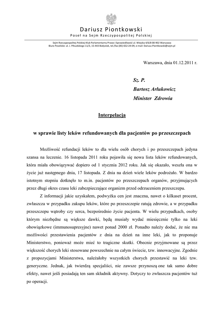 Dariusz Piontkowski Poseł na Sejm Rzeczypospolitej Polskiej Sejm Rzeczypospolitej Polskiej Klub Parlamentarny Prawo i Sprawiedliwość ul. Wiejska 4/6/8 00-902 Warszawa Biuro Poselskie: al. J. Piłsudskiego 11/3, 15-443 Białystok, tel./fax (85) 652-24-09, e-mail: [email protected] Warszawa, dnia 01.12.2011 r. Sz. P. Bartosz Arłukowicz Minister Zdrowia Interpelacja w sprawie listy leków refundowanych dla pacjentów po przeszczepach Możliwość refundacji leków to dla wielu osób chorych i po przeszczepach jedyna szansa na leczenie. 16 listopada 2011 roku pojawiła się nowa lista leków refundowanych, która miała obowiązywać dopiero od 1 stycznia 2012 roku. Jak się okazało, weszła ona w życie już następnego dnia, 17 listopada. Z dnia na dzień wiele leków podrożało. W bardzo istotnym stopniu dotknęło to m.in. pacjentów po przeszczepach organów, przyjmujących przez długi okres czasu leki zabezpieczające organizm przed odrzuceniem przeszczepu. Z informacji jakie uzyskałem, podwyżka cen jest znaczna, nawet o kilkaset procent, zwłaszcza w przypadku zakupu leków, które po przeszczepie ratują zdrowie, a w przypadku przeszczepu wątroby czy serca, bezpośrednio życie pacjenta. W wielu przypadkach, osoby którym niezbędne są większe dawki, będą musiały wydać miesięcznie tylko na leki obowiązkowe (immunosupresyjne) nawet ponad 2000 zł. Ponadto należy dodać, że nie ma możliwości przestawienia pacjentów z dnia na dzień na inne leki, jak to proponuje Ministerstwo, ponieważ może mieć to tragiczne skutki. Obecnie przyjmowane są przez większość chorych leki stosowane powszechnie na całym świecie, tzw. innowacyjne. Zgodnie z propozycjami Ministerstwa, należałoby wszystkich chorych przestawić na leki tzw. generyczne. Jednak, jak twierdzą specjaliści, nie zawsze przynoszą one tak samo dobre efekty, nawet jeśli posiadają ten sam składnik aktywny. Dotyczy to zwłaszcza pacjentów tuż po operacji. Dariusz Piontkowski Poseł na Sejm Rzeczypospolitej Polskiej Sejm Rzeczypospolitej Polskiej Klub Parlamentarny Prawo i Sprawiedliwość ul. Wiejska 4/6/8 00-902 Warszawa Biuro Poselskie: al. J. Piłsudskiego 11/3, 15-443 Białystok, tel./fax (85) 652-24-09, e-mail: [email protected] W tej sprawie interweniowały już liczne organizacje społeczne, reprezentujące osoby po transplantacji narządów, bardzo dobrze zorientowane w sytuacji pacjentów. W liście otwartym podpisanym przez sześć różnych podmiotów (Fundacja osób po przeszczepieniu wątroby TRANSPLANTACJA Stowarzyszenie osób z O.K.!, Fundacja przeszczepionym ,,Transplantacja narządem ,,Dar – życia’’, Dar Życia’’, Stowarzyszenie Przeszczepionych Serc, Stowarzyszenie Transplantacji Serca (Warszawa), Stowarzyszenie ,,Życie po przeszczepie’’) czytamy m. in.: „wprowadzenie w proponowany sposób (gwałtownie, a ponadto z możliwością zmian - gdy zmienią się ceny na rynku!) leków generycznych do leczenia osób po transplantacjach - może zaowocować pogorszeniem się stanu zdrowia, a nawet zagrożeniem życia wielu pacjentów JEDNOCZEŚNIE. Na to, ani przychodnie, ani szpitale nie są przygotowane. Leki oryginalne będą surrealistycznie drogie, a nie, jak do tej pory, w cenie ryczałtowej. Rozumiejąc zatem, że z powodów finansowych leki generyczne i tak będą wprowadzone – apelujemy o ich BEZPIECZNE (stopniowe i kontrolowane) wdrażanie. […] W trosce o bezpieczeństwo około 12 tysięcy ludzi żyjących w Polsce po rozmaitych transplantacjach - APELUJEMY o szybką zmianę rozporządzeń wykonawczych i szukanie rozwiązań zgodnych ze zdrowym rozsądkiem, a nie z niewykonalnymi (i nieczytelnymi!) procedurami”. W konkretnym przypadku, z którym zgłosiła się do mnie matka młodej dziewczyny po transplantacji, z dnia na dzień leki, które przyjmowała, zdrożały o kilkaset procent. I tak np. za jeden lek kosztujący dotąd 3 zł trzeba zapłacić ok. 230 zł, a drugi zdrożał z ok. 60 zł do ponad 200 zł. Miesięczna kuracja będzie teraz kosztować blisko 1000 zł miesięcznie. Nie można szukać oszczędności tam gdzie chodzi o ludzkie życie. Uważam, że tak wysoka podwyżka cen leków niezbędnych do ratowania zdrowia i życia osób zmuszonych do długotrwałego przyjmowania leków po transplantacjach jest niedopuszczalna. Dodatkowo nie rozumiem, dlaczego zmianę listy leków refundowanych przeprowadzono tak nagle, utrudniając tysiącom pacjentów dostosowanie się do nowej sytuacji. W związku z powyższym uprzejmie proszę o wyjaśnienia i odpowiedź na pytania: Dariusz Piontkowski Poseł na Sejm Rzeczypospolitej Polskiej Sejm Rzeczypospolitej Polskiej Klub Parlamentarny Prawo i Sprawiedliwość ul. Wiejska 4/6/8 00-902 Warszawa Biuro Poselskie: al. J. Piłsudskiego 11/3, 15-443 Białystok, tel./fax (85) 652-24-09, e-mail: [email protected] 1. Dlaczego nastąpiło gwałtowne przyspieszenie wprowadzenia nowej tabeli leków refundowanych? 2. Czy Ministerstwo Zdrowia, ze względu na zagrożenie życia i zdrowia ludzi, nie zamierza ponownie wprowadzić refundacji leków innowacyjnych po transplantacji narządów, a nie tylko generycznych i czy nie przewiduje się możliwości pozostawienia indywidualnych decyzji w sprawie wyboru typu leku lekarzom, w zależności od stanu zdrowia pacjentów? Z uwagi na powagę sprawy, proszę o jak najszybsze zareagowanie na sygnalizowane przeze mnie problemy. Z poważaniem Dariusz Piontkowski Poseł na Sejm RP