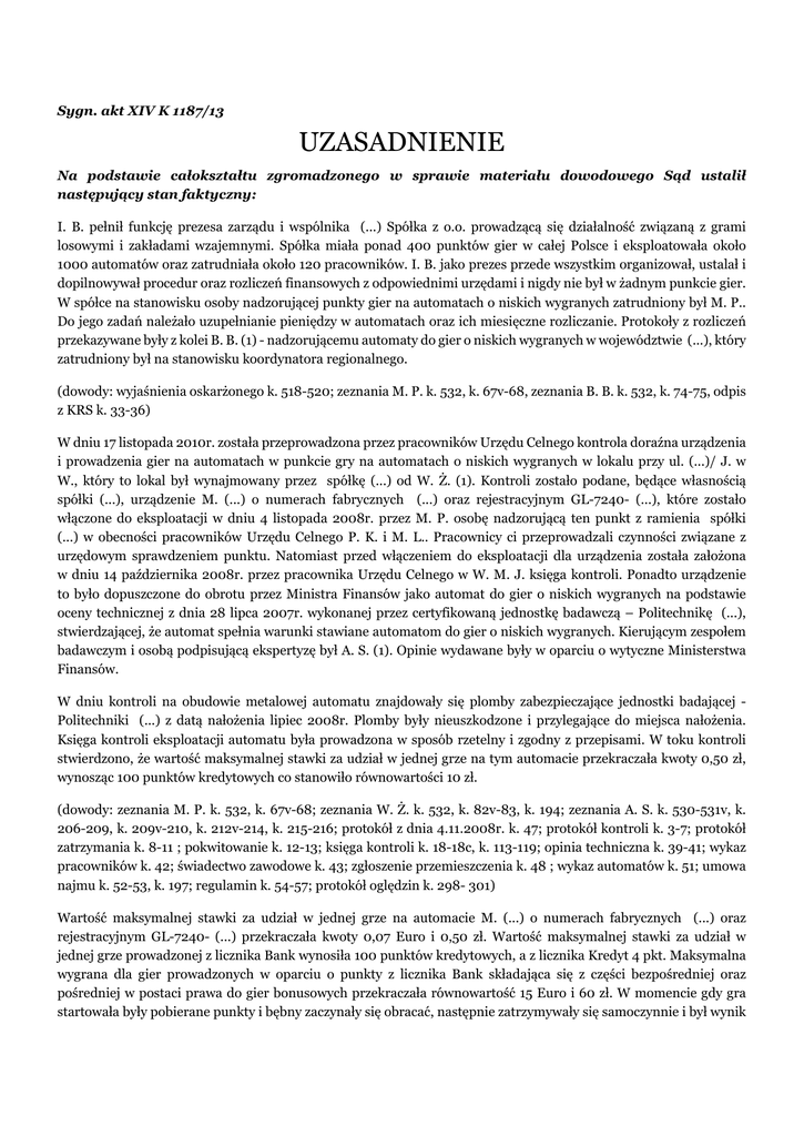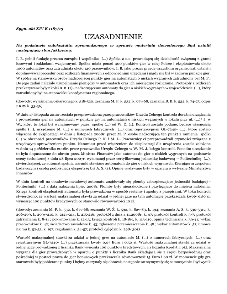 Sygn. akt XIV K 1187/13 UZASADNIENIE Na podstawie całokształtu zgromadzonego w sprawie materiału dowodowego Sąd ustalił następujący stan faktyczny: I. B. pełnił funkcję prezesa zarządu i wspólnika (...) Spółka z o.o. prowadzącą się działalność związaną z grami losowymi i zakładami wzajemnymi. Spółka miała ponad 400 punktów gier w całej Polsce i eksploatowała około 1000 automatów oraz zatrudniała około 120 pracowników. I. B. jako prezes przede wszystkim organizował, ustalał i dopilnowywał procedur oraz rozliczeń finansowych z odpowiednimi urzędami i nigdy nie był w żadnym punkcie gier. W spółce na stanowisku osoby nadzorującej punkty gier na automatach o niskich wygranych zatrudniony był M. P.. Do jego zadań należało uzupełnianie pieniędzy w automatach oraz ich miesięczne rozliczanie. Protokoły z rozliczeń przekazywane były z kolei B. B. (1) - nadzorującemu automaty do gier o niskich wygranych w województwie (...), który zatrudniony był na stanowisku koordynatora regionalnego. (dowody: wyjaśnienia oskarżonego k. 518-520; zeznania M. P. k. 532, k. 67v-68, zeznania B. B. k. 532, k. 74-75, odpis z KRS k. 33-36) W dniu 17 listopada 2010r. została przeprowadzona przez pracowników Urzędu Celnego kontrola doraźna urządzenia i prowadzenia gier na automatach w punkcie gry na automatach o niskich wygranych w lokalu przy ul. (...)/ J. w W., który to lokal był wynajmowany przez spółkę (...) od W. Ż. (1). Kontroli zostało podane, będące własnością spółki (...), urządzenie M. (...) o numerach fabrycznych (...) oraz rejestracyjnym GL-7240- (...), które zostało włączone do eksploatacji w dniu 4 listopada 2008r. przez M. P. osobę nadzorującą ten punkt z ramienia spółki (...) w obecności pracowników Urzędu Celnego P. K. i M. L.. Pracownicy ci przeprowadzali czynności związane z urzędowym sprawdzeniem punktu. Natomiast przed włączeniem do eksploatacji dla urządzenia została założona w dniu 14 października 2008r. przez pracownika Urzędu Celnego w W. M. J. księga kontroli. Ponadto urządzenie to było dopuszczone do obrotu przez Ministra Finansów jako automat do gier o niskich wygranych na podstawie oceny technicznej z dnia 28 lipca 2007r. wykonanej przez certyfikowaną jednostkę badawczą – Politechnikę (...), stwierdzającej, że automat spełnia warunki stawiane automatom do gier o niskich wygranych. Kierującym zespołem badawczym i osobą podpisującą ekspertyzę był A. S. (1). Opinie wydawane były w oparciu o wytyczne Ministerstwa Finansów. W dniu kontroli na obudowie metalowej automatu znajdowały się plomby zabezpieczające jednostki badającej Politechniki (...) z datą nałożenia lipiec 2008r. Plomby były nieuszkodzone i przylegające do miejsca nałożenia. Księga kontroli eksploatacji automatu była prowadzona w sposób rzetelny i zgodny z przepisami. W toku kontroli stwierdzono, że wartość maksymalnej stawki za udział w jednej grze na tym automacie przekraczała kwoty 0,50 zł, wynosząc 100 punktów kredytowych co stanowiło równowartości 10 zł. (dowody: zeznania M. P. k. 532, k. 67v-68; zeznania W. Ż. k. 532, k. 82v-83, k. 194; zeznania A. S. k. 530-531v, k. 206-209, k. 209v-210, k. 212v-214, k. 215-216; protokół z dnia 4.11.2008r. k. 47; protokół kontroli k. 3-7; protokół zatrzymania k. 8-11 ; pokwitowanie k. 12-13; księga kontroli k. 18-18c, k. 113-119; opinia techniczna k. 39-41; wykaz pracowników k. 42; świadectwo zawodowe k. 43; zgłoszenie przemieszczenia k. 48 ; wykaz automatów k. 51; umowa najmu k. 52-53, k. 197; regulamin k. 54-57; protokół oględzin k. 298- 301) Wartość maksymalnej stawki za udział w jednej grze na automacie M. (...) o numerach fabrycznych (...) oraz rejestracyjnym GL-7240- (...) przekraczała kwoty 0,07 Euro i 0,50 zł. Wartość maksymalnej stawki za udział w jednej grze prowadzonej z licznika Bank wynosiła 100 punktów kredytowych, a z licznika Kredyt 4 pkt. Maksymalna wygrana dla gier prowadzonych w oparciu o punkty z licznika Bank składająca się z części bezpośredniej oraz pośredniej w postaci prawa do gier bonusowych przekraczała równowartość 15 Euro i 60 zł. W momencie gdy gra startowała były pobierane punkty i bębny zaczynały się obracać, następnie zatrzymywały się samoczynnie i był wynik - układ wygrywający bądź przegrywający. Gdy wynik był wygrywający, to gracz dostawał kolejne punkty, a jak był przegrywający, to gracz nie dostawał nic. Punkty kumulowały się na liczniku Bank. Dla programu na którym opierało się działanie automatu nie miało znaczenia, czy punkty były pobierane z licznika Bank, czy Kredyt. (dowody: pisemna opinia biegłego wraz z dokumentacją zdjęciową k. 134-174, ustna opinia uzupełniająca k. 569-569v) I. B. ma 54 lata, wykształcenie średnie. Oskarżony jest rozwiedziony, ma trójkę dzieci pozostających na jego utrzymaniu. Pracuje w spółce (...) z wynagrodzeniem 12 000 zł. Nie był leczony odwykowo ani psychiatrycznie. Nie był również dotychczas karany. (dane osobopoznawcze k. 518, karta karna k. 514) Oskarżony I. B. w toku postępowania przygotowawczego nie przyznał się do zarzucanego mu czynu i odmówił złożenia wyjaśnień (k. 281) W toku przesłuchania przed Sądem oskarżony nie przyznał się do popełnienia zarzucanego mu czynu i złożył wyjaśnienia. Podał, że spółka (...) została założona w 2002 r. w celu eksploatowania automatów o niskich wygranych. W spółce pełnił funkcję prezesa zarządu. Podkreślił, że działalność prowadzona była zgodnie z ustawą i wypełniane były wszystkie przepisy wynikające z ustawy czyli uzyskiwane były koncesji na eksploatacje automatów w danym województwie, automaty były badane przez jednostkę badawczą, uzyskiwane były dowody rejestracji wydawane przez Ministerstwo Finansów i dopiero po zgromadzeniu wszystkich tych dokumentów i po uzyskaniu zgody przedstawicieli Urzędu Ce