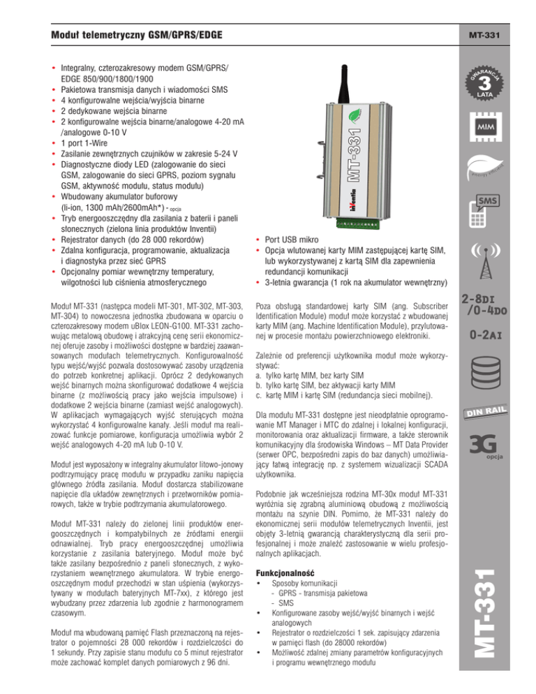 Moduł telemetryczny GSM/GPRS/EDGE Moduł jest wyposażony w integralny akumulator litowo-jonowy podtrzymujący pracę modułu w przypadku zaniku napięcia głównego źródła zasilania. Moduł dostarcza stabilizowane napięcie dla układów zewnętrznych i przetworników pomiarowych, także w trybie podtrzymania akumulatorowego. Moduł MT-331 należy do zielonej linii produktów energooszczędnych i kompatybilnych ze źródłami energii odnawialnej. Tryb pracy energooszczędnej umożliwia korzystanie z zasilania bateryjnego. Moduł może być także zasilany bezpośrednio z paneli słonecznych, z wykorzystaniem wewnętrznego akumulatora. W trybie energooszczędnym moduł przechodzi w stan uśpienia (wykorzystywany w modułach bateryjnych MT-7xx), z którego jest wybudzany przez zdarzenia lub zgodnie z harmonogramem czasowym. Moduł ma wbudowaną pamięć Flash przeznaczoną na rejestrator o pojemności 28 000 rekordów i rozdzielczości do 1 sekundy. Przy zapisie stanu modułu co 5 minut rejestrator może zachować komplet danych pomiarowych z 96 dni. G LATA MIM e-mail IP67 IP68 • Port USB mikro • Opcja wlutowanej karty MIM zastępującej kartę SIM, GPRS lub wykorzystywanej z kartą SIM dla zapewnienia MODEM redundancji komunikacji • 3-letnia gwarancja (1 rok na akumulator wewnętrzny) Poza obsługą standardowej karty SIM (ang. Subscriber Identification Module) moduł może korzystać z wbudowanej karty MIM (ang. Machine Identification Module), przylutowanej w procesie montażu powierzchniowego elektroniki. Zależnie od preferencji użytkownika moduł może wykorzystywać: a. tylko kartę MIM, bez karty SIM b. tylko kartę SIM, bez aktywacji karty MIM c. kartę MIM i kartę SIM (redundancja sieci mobilnej). Dla modułu MT-331 dostępne jest nieodpłatnie oprogramowanie MT Manager i MTC do zdalnej i lokalnej konfiguracji, monitorowania oraz aktualizacji firmware, a także sterownik komunikacyjny dla środowiska Windows – MT Data Provider (serwer OPC, bezpośredni zapis do baz danych) umożliwiający łatwą integrację np. z systemem wizualizacji SCADA użytkownika. Podobnie jak wcześniejsza rodzina MT-30x moduł MT-331 wyróżnia się zgrabną aluminiową obudową z możliwością montażu na szynie DIN. Pomimo, że MT-331 należy do ekonomicznej serii modułów telemetrycznych Inventii, jest objęty 3-letnią gwarancją charakterystyczną dla serii profesjonalnej i może znaleźć zastosowanie w wielu profesjonalnych aplikacjach. Funkcjonalność • Sposoby komunikacji -- GPRS - transmisja pakietowa -- SMS • Konfigurowane zasoby wejść/wyjść binarnych i wejść analogowych • Rejestrator o rozdzielczości 1 sek. zapisujący zdarzenia w pamięci flash (do 28000 rekordów) • Możliwość zdalnej zmiany parametrów konfiguracyjnych i programu wewnętrznego modułu 2-8di /0-4do 0-2ai IP67 e-mail IL DIN RA opcja GPRS MODEM MT-331 Moduł MT-331 (następca modeli MT-301, MT-302, MT-303, MT-304) to nowoczesna jednostka zbudowana w oparciu o czterozakresowy modem uBlox LEON-G100. MT-331 zachowując metalową obudowę i atrakcyjną cenę serii ekonomicznej oferuje zasoby i możliwości dostępne w bardziej zaawansowanych modułach telemetrycznych. Konfigurowalność typu wejść/wyjść pozwala dostosowywać zasoby urządzenia do potrzeb konkretnej aplikacji. Oprócz 2 dedykowanych wejść binarnych można skonfigurować dodatkowe 4 wejścia binarne (z możliwością pracy jako wejścia impulsowe) i dodatkowe 2 wejścia binarne (zamiast wejść analogowych). W aplikacjach wymagających wyjść sterujących można wykorzystać 4 konfigurowalne kanały. Jeśli moduł ma realizować funkcje pomiarowe, konfiguracja umożliwia wybór 2 wejść analogowych 4-20 mA lub 0-10 V. ARANC W JA • Integralny, czterozakresowy modem GSM/GPRS/ EDGE 850/900/1800/1900 • Pakietowa transmisja danych i wiadomości SMS • 4 konfigurowalne wejścia/wyjścia binarne • 2 dedykowane wejścia binarne • 2 konfigurowalne wejścia binarne/analogowe 4-20 mA /analogowe 0-10 V • 1 port 1-Wire • Zasilanie zewnętrznych czujników w zakresie 5-24 V • Diagnostyczne diody LED (zalogowanie do sieci GSM, zalogowanie do sieci GPRS, poziom sygnału GSM, aktywność modułu, status modułu) • Wbudowany akumulator buforowy (li-ion, 1300 mAh/2600mAh*) * opcja • Tryb energooszczędny dla zasilania z baterii i paneli słonecznych (zielona linia produktów Inventii) • Rejestrator danych (do 28 000 rekordów) • Zdalna konfiguracja, programowanie, aktualizacja i diagnostyka przez sieć GPRS • Opcjonalny pomiar wewnętrzny temperatury, wilgotności lub ciśnienia atmosferycznego MT-331 Dane Techniczne MT-331 • • • • • • • • Zabezpieczenie przed nieuprawnionym dostępem (lista uprawnionych numerów telefonów i adresów IP, opcjonalnie hasło) Praca licznikowa wejść binarnych (do 100 Hz, za wyjątkiem kanałów analogowych) SMSy o dynamicznie zmiennej treści Praca zdarzeniowa według konfigurowanych reguł i według harmonogramu Montaż na szynie DIN Zasilanie 12/24 VDC lub panel słoneczny Możliwość pracy w trybie energooszczędnym – modem jest uruchamiany wyłącznie na czas transmisji Przyjazne narzędzia konfiguracyjne Wejścia binarne I1....I8 Napięcie wejściowe 0 ... 30V Rezystancja wejściowa I1 ... I6 /Rezystancja wejściowa I7 ... I8 12,7 kW / 15,4 kW Wejściowe napięcie ON (1) > 9V Wejściowe napięcie OFF (0) < 3V Minimalna długość impulsu "1" 10 ms Wyjścia binarne Q1...Q4 Rodzaj wyjść tranzystorowe typu "otwarty dren" Zalecany średni dla pojedynczego wyjścia 100 mA Maksymalny prąd dla pojedynczego wyjścia 250 mA Rezystancja wyjścia w stanie włączenia 3 W max. Wyjście zasilania czujników VOUT Zakres regulacji napięcia wyjściowego Ogólne Wymiary (dł. x szer. x wys.) 124x63x30 mm Waga 100 g Sposób mocowania Maksymalny prąd wyjściowy szyna DIN 35 mm Temperatura pracy 0 ... +55°C dla baterii 0,8 Ah -20 ... +55°C dla baterii 2,6 Ah Klasa ochrony 