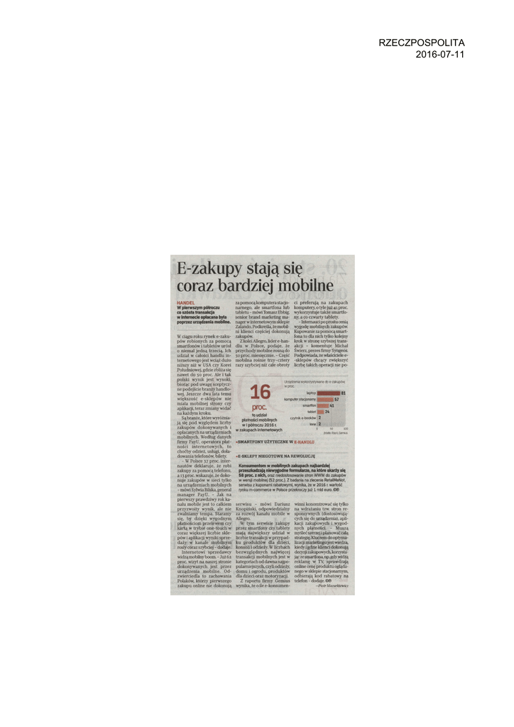 RZECZPOSPOLITA 2016-07-11 E-zakupy stają się coraz bardziej mobilne za pomocą komputera stacjo ci preferują na zakupach narnego, ale smartfona lub komputery, o tyle już 41 proc. tabletu - mówi Tomasz Ebbig; wykorzystuje także smartfosenior brand marketing ma ny, a co czwarty tablety. - Internauci po prostu cenią nager winternetowym sklepie Zalando. Podkreśla, że mobil wygodę mobilnych zakupów. ni klienci częściej dokonują Kupowanie za pomocą smart fona to dla nich tylko kolejny W ciągu roku rynek e-zaku zakupów. Z kolei Allegro, lider e-han krok w stronę szybszej trans pów robionych za pomocą smartfonów i tabletów urósł dlu w Polsce, podaje, że akcji - komentuje Michał o niemal jedną trzecią. Ich przychody mobilne rosną do Świerz, prezes firmy Syngeos. udział w całości handlu in 50 proc. miesięcznie. - Część Podpowiada, że właściciele eternetowego jest wciąż dużo mobilna rośnie trzy-cztery -sklepów chcący zwiększyć niższy niż w USA czy Korei razy szybciej niż całe obroty liczbę takich operacji nie poPołudniowej, gdzie zbliża się nawet do 50 proc. Ale i tak polski wynik jest wysoki, Urządzenia wykorzystywane do e-zakupów, biorąc pod uwagę sceptycz w proc. ne podejście branży handlo wej. Jeszcze dwa lata temu większość e-sklepów nie komputer stacjonarny| 57 miała mobilnej strony czy smartfon aplikacji, teraz zmiany widać tablet fil 24 na każdym kroku. to udział czytnik e-booków 2 Są branże, które wyróżnia płatności mobilnych ją się pod względem liczby inne 2 w I półroczu 2016 r. zakupów dokonywanych i o 50 100 w zakupach internetowych opłacanych na urządzeniach źródło: PayU, Gemius mobilnych. Według danych firmy PayU, operatora płat •SMARTFONY UŻYTECZNE W E-HANDLU ności internetowych, to choćby odzież, usługi, doła •E-SKLEPY NIEGOTOWE NA REWOLUCJĘ dowania telefonów, bilety. - W Polsce 37 proc. inter Konsumentom w mobilnych zakupach najbardziej nautów deklaruje, że robi przeszkadzają niewygodne formularze, na które skarży się zakupy za pomocą telefonu, 58 proc z nich, oraz niedostosowanie stron WWW do zakupów a 13 proc. wskazuje, że doko w wersji mobilnej (52 proc.). Z badania na zlecenie RetailMeNot, nuje zakupów w sieci tylko serwisu z kuponami rabatowymi, wynika, że w 2016 r. wartość na urządzeniach mobilnych rynku m-commerce w Polsce przekroczy już 1 mld euro. ©® - mówi Sylwia Bilska,general manager PayU. - Jak na pierwszy prawdziwy rok ka nału mobile jest to całkiem serwisu - mówi Dariusz winni koncentrować się tylko przyzwoity wynik, ale nie Knopiński, odpowiedzialny na wdrażaniu tzw. stron rezwalniamy tempa. Staramy za rozwój kanału mobile w sponsywnych (dostosowują cych się do urządzenia), apli się, by dzięki wygodnym Allegro. W tym serwisie zakupy kacji zakupowych i wygod płatnościom przelewem czy kartą w trybie one-touch w przez smartfony czy tablety nych płatności. - Muszą coraz większej liczbie skle mają największy udział w myśleć szerzej i planować całą pów i aplikacji wyniki sprze liczbie transakcji w przypad strategię. Kluczem do optyma daży w kanale mobilnym ku produktów dla dzieci, lizacji marketingu jest wiedza, rosły corazszybciej - dodaje. konsoli i odzieży. W liczbach kiedy i gdzie klienci dokonują Internetowi sprzedawcy bezwzględnych najwięcej decyzji zakupowych korzysta widzą mobilny boom. - Już 62 transakcji mobilnych jest w jąc ze smartfona, np. gdy widzą proc. wizyt na naszej stronie kategoriach od dawna najpo reklamę w TV, sprawdzają dokonywanych jest przez pularniejszych, czyli odzieży, online cenę produktu ogląda urządzenia mobilne. Od domu i ogrodu, produktów nego w sklepie stacjonarnym, zwierciedla to zachowania dla dzieci oraz motoryzacji. odbierają kod rabatowy na Z raportu firmy Gemius telefon - dodaje. ©© Polaków, którzy pierwszego —Piotr Mazurkiewicz zakupu online nie dokonują wynika, że o ile e-konsumen- HANDEL W pierwszym półroczu co szósta transakcja w Internecie opłacana była poprzez urządzenia mobilne. 16 proc, mmmm si