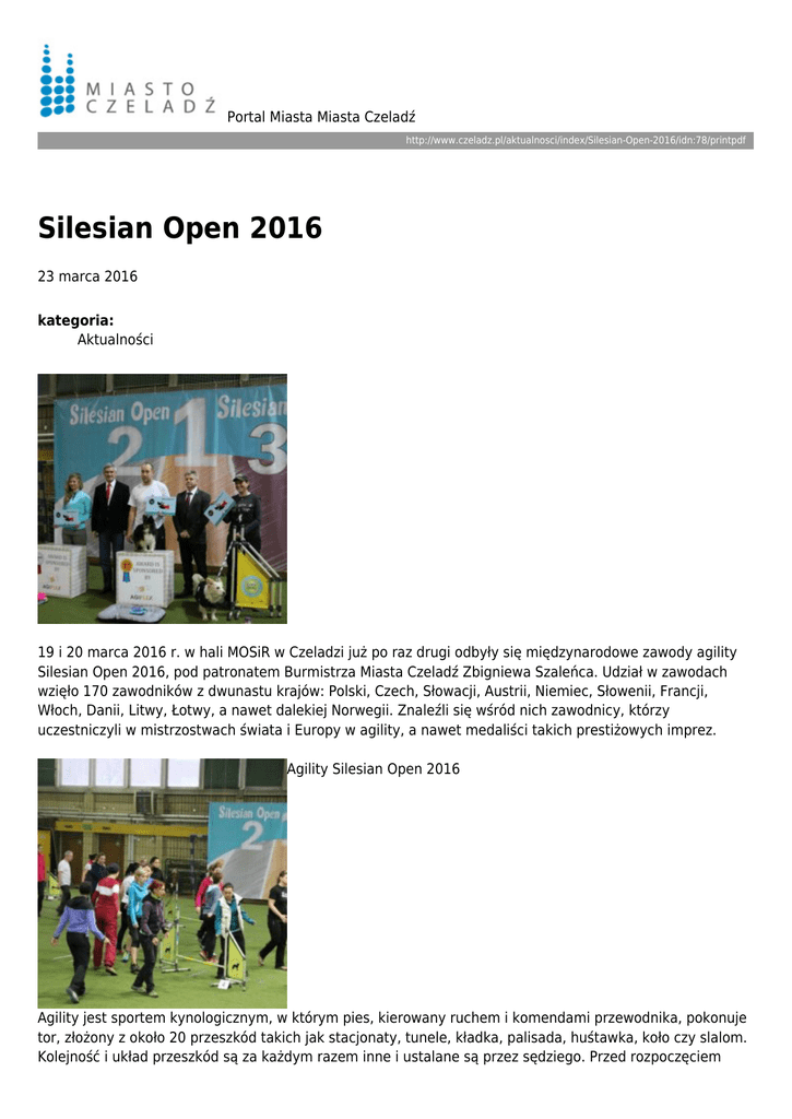 Portal Miasta Miasta Czeladź http://www.czeladz.pl/aktualnosci/index/Silesian-Open-2016/idn:78/printpdf Silesian Open 2016 23 marca 2016 kategoria: Aktualności 19 i 20 marca 2016 r. w hali MOSiR w Czeladzi już po raz drugi odbyły się międzynarodowe zawody agility Silesian Open 2016, pod patronatem Burmistrza Miasta Czeladź Zbigniewa Szaleńca. Udział w zawodach wzięło 170 zawodników z dwunastu krajów: Polski, Czech, Słowacji, Austrii, Niemiec, Słowenii, Francji, Włoch, Danii, Litwy, Łotwy, a nawet dalekiej Norwegii. Znaleźli się wśród nich zawodnicy, którzy uczestniczyli w mistrzostwach świata i Europy w agility, a nawet medaliści takich prestiżowych imprez. Agility Silesian Open 2016 Agility jest sportem kynologicznym, w którym pies, kierowany ruchem i komendami przewodnika, pokonuje tor, złożony z około 20 przeszkód takich jak stacjonaty, tunele, kładka, palisada, huśtawka, koło czy slalom. Kolejność i układ przeszkód są za każdym razem inne i ustalane są przez sędziego. Przed rozpoczęciem przebiegu przewodnicy bez psów mają kilka minut na zapoznanie się z torem i ustalenie strategii prowadzenia psa. Warto wspomnieć, że szkolenie agility opiera się na wykorzystaniu naturalnych popędów psa, jego chęci współpracy z przewodnikiem oraz nagradzaniu właściwych zachowań. Dzięki temu agility jest wspaniałą zabawą dla aktywnych czworonogów i stanowi doskonałe odbicie więzi, jaką przewodnicy tworzą ze swoimi pupilami w codziennym życiu. W tym roku do sędziowania zaproszono aż trzech sędziów - Annę Sajkowską (Polska), Petra Dostala (Czechy) i Stefanie Semkat (Niemcy). Wszyscy sędziowie stanęli na wysokości zadania, układając trudne technicznie lecz płynne tory. Podczas zawodów rozegrano zarówno konkurencje drużynowe, jak i indywidualne w trzech kategoriach wzrostowych: small (dla psów do 35 cm w kłębie), medium (do 43 cm w kłębie) oraz large (powyżej 43 cm w kłębie). Agility Silesian Open 2016 Zwycięzcą w kategorii small została drużyna Women in Black z Czech, w kategorii medium polska drużyna Pyrfection Medium, a w kategorii large czesko-austriacka drużyna Say and Potatoes. W rozgrywkach indywidualnych po najwyższe trofea sięgnęli Słoweniec Sandi Okanovic z sheltie Miyą w kategorii small, w medium polska zawodniczka Agata Pruska z Rossą rasy Nova Scotia Duck Tolling Retriever, a w large również Polka Olga Kwiecień z owczarkiem pirenejskim Brego. Na zwycięzców poszczególnych konkurencji czekały ufundowane przez sponsorów nagrody takie jak tunele do agility, posłania i smakołyki dla psów i inne akcesoria, takie jak zabawki czy ręcznie szyte obroże. Nagrody i dyplomy dla zwycięzców wręczyli Burmistrz Miasta Czeladź Zbigniew Szaleniec oraz Dyrektor Miejskiego Ośrodka Sportu i Rekreacji w Czeladzi Henryk Michalski. Ponieważ agility powinno być przede wszystkim wspaniałą zabawą, organizatorzy przygotowali też nagrody specjalne za konkurencje dodatkowe, takie jak najlepszy baner wspierający ulubioną drużynę, czy najzabawniejsze zdjęcie ze swoim pupilem. Agility Silesian Open 2016 Zawodnicy bardzo chwalili atmosferę zawodów, wysoki poziom sportowych zmagań, a także ciepłą, doskonale położoną w pobliżu parku halę MOSiR Czeladź ze wszelkimi udogodnieniami. Na wszystkich zawodników i licznie zgromadzonych widzów, którzy zdecydowali się przyjść obejrzeć zawody, czekała darmowa świeża kawa i herbata. Można powiedzieć, że druga edycja zawodów Silesian Open 2016 odniosła równie wielki, a nawet większy niż poprzednia edycja sukces. Miejmy nadzieję, że agility nie po raz ostatni zagościło w Czeladzi.