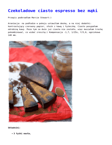 Czekoladowe ciasto espresso bez mąki Przepis podkradłam Marcie Stewart:) Aranżacja: na podłodze w pokoju ustawiłam deskę, a na niej dodatki: kontrastujący czerwony papier, słoik z kawą i łyżeczkę. Ciasto posypałam odrobiną kawy. Poza tym za dużo już ciasta nie zostało, więc musiałam trochę pokombinować, co widać zresztą:) Kompensacja -1,7, 1/25s, f/5,6, ogniskowa 140 mm. Składniki: 3 łyżki masła, 200 g gorzkiej czekolady pokrojonej na drobne kawałeczki, 6 jaj, 1 szklanka cukru lub jego zamiennika, 3 łyżki kawy espresso, 1/4 łyżeczki soli, 3 łyżeczki ekstraktu waniliowego Przygotowanie: 1. W kąpieli wodnej rozpuść czekoladę z masłem. Odstaw do przestygnięcia. 2. Przez około 3 minuty ubijaj żółtka z połową cukru, a potem dodaj resztę składników (bez białek i reszty cukru) i wymieszaj do połączenia się składników w gładką masę. 3. W oddzielnej miseczce ubij białka na sztywną pianę. Dodaj resztę cukru i ubijaj przez 2-3 minuty. 4. Silikonową łyżką wmieszaj białko do reszty ciasta czekoladowego. 5. Piecz w okrągłej formie spsikanej sprayem do pieczenia przez około 45 minut w temperaturze 175 stopni. Wystudź na kratce. 6. Smacznego!