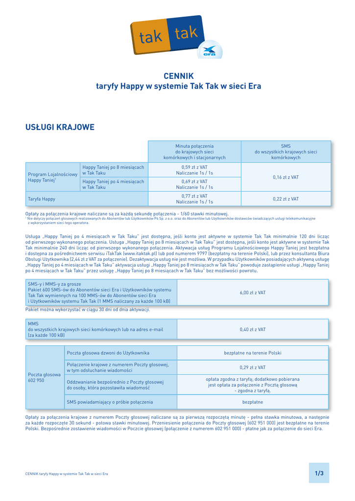 CENNIK taryfy Happy w systemie Tak Tak w sieci Era USŁUGI KRAJOWE Minuta połączenia do krajowych sieci komórkowych i stacjonarnych Program Lojalnościowy Happy Taniej1 Happy Taniej po 8 miesiącach w Tak Taku 0,59 zł z VAT Naliczanie 1s / 1s Happy Taniej po 4 miesiącach w Tak Taku 0,69 zł z VAT Naliczanie 1s / 1s SMS do wszystkich krajowych sieci komórkowych 0,16 zł z VAT 0,77 zł z VAT Naliczanie 1s / 1s Taryfa Happy 0,22 zł z VAT Opłaty za połączenia krajowe naliczane są za każdą sekundę połączenia - 1/60 stawki minutowej. 1 Nie dotyczy połączeń głosowych realizowanych do Abonentów lub Użytkowników P4 Sp. z o.o. oraz do Abonentów lub Użytkowników dostawców świadczących usługi telekomunikacyjne z wykorzystaniem sieci tego operatora. Usługa „Happy Taniej po 4 miesiącach w Tak Taku” jest dostępna, jeśli konto jest aktywne w systemie Tak Tak minimalnie 120 dni licząc od pierwszego wykonanego połączenia. Usługa „Happy Taniej po 8 miesiącach w Tak Taku” jest dostępna, jeśli konto jest aktywne w systemie Tak Tak minimalnie 240 dni licząc od pierwszego wykonanego połączenia. Aktywacja usług Programu Lojalnościowego Happy Taniej jest bezpłatna i dostępna za pośrednictwem serwisu iTakTak (www.itaktak.pl) lub pod numerem 9797 (bezpłatny na terenie Polski), lub przez konsultanta Biura Obsługi Użytkownika (2,44 zł z VAT za połączenie). Dezaktywacja usług nie jest możliwa. W przypadku Użytkowników posiadających aktywną usługę „Happy Taniej po 4 miesiącach w Tak Taku” aktywacja usługi „Happy Taniej po 8 miesiącach w Tak Taku” powoduje zastąpienie usługi „Happy Taniej po 4 miesiącach w Tak Taku” przez usługę „Happy Taniej po 8 miesiącach w Tak Taku” bez możliwości powrotu. SMS-y i MMS-y za grosze Pakiet 600 SMS-ów do Abonentów sieci Era i Użytkowników systemu Tak Tak wymiennych na 100 MMS-ów do Abonentów sieci Era i Użytkowników systemu Tak Tak (1 MMS naliczany za każde 100 kB) 6,00 zł z VAT Pakiet można wykorzystać w ciągu 30 dni od dnia aktywacji. MMS do wszystkich krajowych sieci komórkowych lub na adres e-mail (za każde 100 kB) Poczta głosowa dzwoni do Użytkownika Poczta głosowa 602 950 Połączenie krajowe z numerem Poczty głosowej, w tym odsłuchanie wiadomości Oddzwanianie bezpośrednio z Poczty głosowej do osoby, która pozostawiła wiadomość SMS powiadamiający o próbie połączenia 0,40 zł z VAT bezpłatne na terenie Polski 0,29 zł z VAT opłata zgodna z taryfą; dodatkowo pobierana jest opłata za połączenie z Pocztą głosową - zgodna z taryfą. bezpłatne Opłaty za połączenia krajowe z numerem Poczty głosowej naliczane są za pierwszą rozpoczętą minutę - pełna stawka minutowa, a następnie za każde rozpoczęte 30 sekund - połowa stawki minutowej. Przeniesienie połączenia do Poczty głosowej (602 951 000) jest bezpłatne na terenie Polski. Bezpośrednie zostawienie wiadomości w Poczcie głosowej (połączenie z numerem 602 951 000) - płatne jak za połączenie do sieci Era. CENNIK taryfy Happy w systemie Tak Tak w sieci Era 1/3 Pakietowa transmisja danych na terenie Polski WAP Tak Tak (APN: erawaptt) Internet Tak Tak (APN: erainternettt) Aktywacja bezpłatna Opłata za 500 kB 0,72 zł z VAT Opłata naliczana jest za każde rozpoczęte 500 kB, oddzielnie za dane wysłane i odebrane na poziomie protokołu internetowego (IP); 1kB = 1024B. Po zakończeniu połączenia lub o godz. 24.00 dane są zaokrąglane w górę, do pełnej jednostki taryfikacyjnej - 500 kB. Biuro Obsługi Użytkownika 9602 2,44 zł z VAT za połączenie Połączenie z Biurem Obsługi Użytkownika (9602) jest dostępne tylko z telefonu w systemie Tak Tak na terenie kraju. wysłanie Ekspresowego kodu *111*14-cyfrowy kod uzupełniający# Uzupełnienie konta lub Elektroniczne uzupełnienie konta na terenie Polski bezpłatne lub połączenie z numerem 9898 na terenie Polski Sprawdzenie SMS-y i MMS-y za grosze stanu kwoty na koncie wysłanie Ekspresowego kodu *101# stanu Erajednostek wysłanie Ekspresowego kodu *102# stanu kwoty i Erajednostek na koncie połączenie z numerem 9898 aktywacja pakietu wysłanie Ekspresowego kodu *123*1*1# sprawdzenie stanu pakietu wysłanie Ekspresowego kodu *103*1# bezpłatne bezpłatne Pozostałe opłaty i zasady świadczenia usług - zgodnie z Cennikiem usług dodatkowych dla taryfy Happy w systemie Tak Tak. CENNIK taryfy Happy w systemie Tak Tak w sieci Era 2/3 OBJAŚNIENIA Cennik ważny od dnia 17.12.2007 r. Do cen netto doliczany jest podatek VAT w wysokości 22%, naliczany zgodnie z art. 19 ust. 18 ustawy z dnia 11 marca 2004 r. o podatku od towarów i usług, w chwili dokonania sprzedaży kuponu lub innej formy doładowania konta Użytkownika systemu Tak Tak. Stan konta oraz kwota za połączenia, SMS-y i usługi są rozliczane według cen netto. Przy informowaniu Klienta o stanie konta podawana jest kwota w wartości brutto (z VAT), zaokrąglonej do pełnego grosza. Ze względu na uwarunkowania techniczne opłaty za wykonane usługi mogą być naliczane z opóźnieniem. W takiej sytuacji, w przypadku skorzystania przez Użytkownika z usług za kwotę przewyższającą stan środków zgromadzonych na koncie, opłata za te usługi zostanie pokryta ze środków pochodzących z uzupełnienia konta dokonanego przez Użytkownika w terminie późniejszym. Minimalna wartość doładowania przedłużającego ważność konta: 20 zł z VAT. Jeśli w dniu uzupełnienia konto jest ważne na połączenia wychodzące, to nowa data jego ważności liczona jest od dnia aktualnej daty ważności konta na połączenia wychodzące. Jeśli w dniu uzupełnienia konto nie jest ważne na połączenia wychodzące, to nowa data jego ważności liczona jest od dnia doładowania. Przedłużenia ważności konta na połączenia wychodzące można dokonać maksymalnie na okres 12 miesięcy. Warunkiem koniecznym do korzystania z danej usługi jest posiadanie konta ważnego na