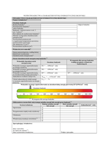 WZÓR ŚWIADECTWA CHARAKTERYSTYKI ENERGETYCZNEJ BUDYNKU ŚWIADECTWO CHARAKTERYSTYKI ENERGETYCZNEJ BUDYNKU Numer świadectwa1) Oceniany budynek Rodzaj budynku2) Przeznaczenie budynku3) Adres budynku Budynek, o którym mowa w art. 3 ust. 2 ustawy4) Rok oddania do użytkowania budynku5) Metoda wyznaczania charakterystyki energetycznej6) Powierzchnia pomieszczeń o regulowanej temperaturze powietrza (powierzchnia ogrzewana lub chłodzona) Af [m2]7) Powierzchnia użytkowa [m2] Zdjęcie budynku Ważne do (rrrr-mm-dd)8) Stacja meteorologiczna, według której danych jest wyznaczana charakterystyka energetyczna9) Ocena charakterystyki energetycznej budynku10) Wskaźniki charakterystyki energetycznej Wskaźnik rocznego zapotrzebowania na energię użytkową Wskaźnik rocznego zapotrzebowania na energię końcową11) Wskaźnik rocznego zapotrzebowania na nieodnawialną energię pierwotną11) Jednostkowa wielkość emisji CO2 Oceniany budynek EU = … kWh/(m2 · rok) Wymagania dla nowego budynku według przepisów techniczno-budowlanych EK = … kWh/(m2 · rok) EP = … kWh/(m2 · rok) EP = … kWh/(m2 · rok) E CO2 = … t CO2/(m2 · rok) Udział odnawialnych źródeł energii Uoze = … % w rocznym zapotrzebowaniu na energię końcową Wskaźnik rocznego zapotrzebowania na nieodnawialną energię pierwotną EP [kWh/(m2 · rok)] Oceniany budynek ↑ Wymagania dla nowego budynku Obliczeniowa roczna ilość zużywanego nośnika energii lub energii przez budynek12) Rodzaj nośnika energii Ilość nośnika energii System techniczny lub energii lub energii Ogrzewania 1) n) Przygotowania ciepłej wody użytkowej 1) n) Chłodzenia 1) n) Wbudowanej instalacji oświetlenia11) 1) n) Sporządzający świadectwo: Imię i nazwisko: Nr wpisu do wykazu13): Data wystawienia świadectwa: Podpis i pieczątka Jednostka/(m2 · rok) ŚWIADECTWO CHARAKTERYSTYKI ENERGETYCZNEJ BUDYNKU Numer świadectwa1) Podstawowe parametry techniczno-użytkowe budynku Liczba kondygnacji budynku Kubatura budynku [m3] Kubatura budynku o regulowanej temperaturze powietrza [m3] Podział powierzchni użytkowej budynku14) Temperatury wewnętrzne w budynku w zależności od stref ogrzewanych Rodzaj konstrukcji budynku Przegrody budynku Nazwa przegrody System ogrzewania16) System przygotowania ciepłej wody użytkowej16) System chłodzenia16) Wentylacja System wbudowanej instalacji oświetlenia11), 16) Inne istotne dane dotyczące budynku Opis przegrody 1) 2) 3) 4) n) Elementy składowe systemu Wytwarzanie ciepła Przesył ciepła Akumulacja ciepła Regulacja i wykorzystanie ciepła Elementy składowe systemu Wytwarzanie ciepła Przesył ciepła Akumulacja ciepła Elementy składowe systemu Wytwarzanie chłodu Przesył chłodu Akumulacja chłodu Regulacja i wykorzystanie chłodu Współczynnik przenikania ciepła przegrody U [W/(m2 · K)] uzyskany wymagany15) Opis Średnia sezonowa sprawność Opis Średnia roczna sprawność Opis Średnia sezonowa sprawność ŚWIADECTWO CHARAKTERYSTYKI ENERGETYCZNEJ BUDYNKU Numer świadectwa1) Wskaźnik rocznego zapotrzebowania na energię użytkową EU [kWh/(m2 · rok)]17) Ogrzewanie Ciepła woda Chłodzenie Oświetlenie i wentylacja użytkowa wbudowane [kWh/(m2 · rok)] Udział [%] Wskaźnik rocznego zapotrzebowania na energię użytkową EU: … kWh/(m2 · rok) Wskaźnik rocznego zapotrzebowania na energię końcową EK [kWh/(m2 · rok)]17) Rodzaj nośnika energii Ogrzewanie Ciepła woda Chłodzenie Oświetlenie lub energii i wentylacja użytkowa wbudowane11) 1) 2) n) Suma Suma Suma [kWh/(m2 · rok)] Udział [%] Wskaźnik rocznego zapotrzebowania na energię końcową EK: … kWh/(m2 · rok) Wskaźnik rocznego zapotrzebowania na nieodnawialną energię pierwotną EP [kWh/(m2 · rok)]17) Rodzaj nośnika energii Ogrzewanie Ciepła woda Chłodzenie Oświetlenie Suma lub energii i wentylacja użytkowa wbudowane11) 1) 2) n) Suma [kWh/(m2 · rok)] Udział [%] Wskaźnik rocznego zapotrzebowania na nieodnawialną energię pierwotną EP: … kWh/(m2 · rok) Zalecenia dotyczące opłacalnej ekonomicznie i wykonalnej technicznie poprawy charakterystyki energetycznej budynku w zakresie18): 1) przegród budynku w przypadku planowania robót budowlanych polegających na ociepleniu budynku, obejmujących ponad 25% powierzchni przegród zewnętrznych tego budynku 2) systemów technicznych w budynku w przypadku planowania robót budowlanych polegających na ociepleniu budynku, obejmujących ponad 25% powierzchni przegród zewnętrznych tego budynku 3) przegród budynku niezależnie od planowanych robót budowlanych, o których mowa w pkt 1 4) systemów technicznych w budynku lub części budynku niezależnie od planowanych robót budowlanych, o których mowa w pkt 2 5) innych uwag dotyczących poprawy charakterystyki energetycznej budynku (w tym wskazanie, gdzie można uzyskać szczegółowe informacje dotyczące opłacalności ekonomicznej zaleceń zawartych w świadectwie oraz informację dotyczącą działań, jakie należy podjąć w celu wypełnienia zaleceń) ŚWIADECTWO CHARAKTERYSTYKI ENERGETYCZNEJ BUDYNKU Numer świadectwa1) Objaśnienia 1) 2) 3) 4) 5) 6) 7) 8) 9) 10) 11) 12) 13) 14) 15) 16) 17) 18) Nr świadectwa w wykazie świadectw charakterystyki energetycznej, nadany w systemie teleinformatycznym, w którym jest prowadzony centralny rejestr charakterystyki energetycznej budynków, o którym mowa w art. 31 ust. 1 pkt 3 ustawy z dnia 29 sierpnia 2014 r. o charakterystyce energetycznej budynków (Dz. U. poz. 1200 oraz z 2015 r. poz. 151). Rodzaj budynku: mieszkalny, zamieszkania zbiorowego, użyteczności publicznej, rekreacji indywidualnej, gospodarczy, produkcyjny, magazynowy. Należy określić zgodnie z przepisami wydanymi na podstawie art. 7 ust. 2 pkt 1 ustawy z dnia 7 lipca 1994 r. − Prawo budowlane (Dz. U. z 2013 r. poz. 1409, z 2014 r. poz. 40, 768, 822, 1133 i 1200 oraz z 2015 r. poz. 151 i 200), zwanymi dalej „przepisami techniczno-budowlanymi”, np. budynek przeznaczony na potrzeby opieki zdrow