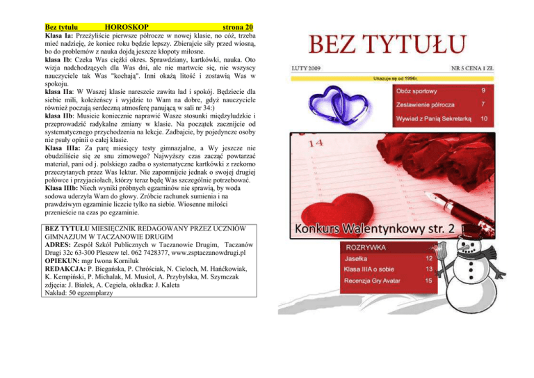 Bez tytułu HOROSKOP strona 20 Klasa Ia: PrzeŜyliście pierwsze półrocze w nowej klasie, no cóŜ, trzeba mieć nadzieję, Ŝe koniec roku będzie lepszy. Zbierajcie siły przed wiosną, bo do problemów z nauka dojdą jeszcze kłopoty miłosne. klasa Ib: Czeka Was cięŜki okres. Sprawdziany, kartkówki, nauka. Oto wizja nadchodzących dla Was dni, ale nie martwcie się, nie wszyscy nauczyciele tak Was "kochają". Inni okaŜą litość i zostawią Was w spokoju. klasa IIa: W Waszej klasie nareszcie zawita ład i spokój. Będziecie dla siebie mili, koleŜeńscy i wyjdzie to Wam na dobre, gdyŜ nauczyciele równieŜ poczują serdeczną atmosferę panującą w sali nr 34:) klasa IIb: Musicie koniecznie naprawić Wasze stosunki międzyludzkie i przeprowadzić radykalne zmiany w klasie. Na początek zacznijcie od systematycznego przychodzenia na lekcje. Zadbajcie, by pojedyncze osoby nie psuły opinii o całej klasie. Klasa IIIa: Za parę miesięcy testy gimnazjalne, a Wy jeszcze nie obudziliście się ze snu zimowego? NajwyŜszy czas zacząć powtarzać materiał, pani od j. polskiego zadba o systematyczne kartkówki z rzekomo przeczytanych przez Was lektur. Nie zapomnijcie jednak o swojej drugiej połówce i przyjaciołach, którzy teraz będę Was szczególnie potrzebować. Klasa IIIb: Niech wyniki próbnych egzaminów nie sprawią, by woda sodowa uderzyła Wam do głowy. Zróbcie rachunek sumienia i na prawdziwym egzaminie liczcie tylko na siebie. Wiosenne miłości przenieście na czas po egzaminie. BEZ TYTUŁU MIESIĘCZNIK REDAGOWANY PRZEZ UCZNIÓW GIMNAZJUM W TACZANOWIE DRUGIM ADRES: Zespół Szkół Publicznych w Taczanowie Drugim, Taczanów Drugi 32c 63-300 Pleszew tel. 062 7428377, www.zsptaczanowdrugi.pl OPIEKUN: mgr Iwona Korniluk REDAKCJA: P. Biegańska, P. Chróściak, N. Cieloch, M. Hańćkowiak, K. Kempiński, P. Michalak, M. Musioł, A. Przybylska, M. Szymczak zdjęcia: J. Białek, A. Cegieła, okładka: J. Kaleta Nakład: 50 egzemplarzy Bez tytułu WALENTYNKOWY KONKURS strona 2 Bez tytułu KRZYśÓWKA strona 19 KONKURS WALENTYNKOWY Drodzy Czytelnicy, zapewne zauwaŜyliście, Ŝe dzisiejsze wydanie gazetki jest wyjątkowe. Na tytułowej stronie jest przylepione serduszko z numerem. Waszym zadaniem jest znaleźć swoją połówkę, czyli osobę, która ma gazetkę, a na niej serduszko z tym samym numerem. Pierwsze dwie mieszane pary, które zgłoszą się do p. Iwony Korniluk otrzymają WALENTYNKOWĄ NIESPODZIANKĘ. Nie musisz nic robić, tylko znaleźć swoje przeznaczenie. Powodzenia w poszukiwaniach. Czekamy z niecierpliwością na WALENTYNKOWĄ PARĘ 1. 2. 3. 4. 5. 6. 7. 8. 9. 10. 11. Skóra zwierzęca pokryta sierścią; np. z norek Święto … Króli (6 grudnia) Jeździsz w nich na stoku Niezbędne w kuligu Są z lodu, ostre, zwisają z dachu Zimowa stolica Polski Pada raczej zimą jest biały, puszysty i zimny Maluje wzory na szybach, np. -20°C Damskie buty zimowe Oblegane zimą, Ŝeby na nie wejść musisz mieć łyŜwy, jest pokryte lodem Pierwszy miesiąc roku W zaznaczonych polach powstanie hasło, które naleŜy wpisać na kuponie konkursowym. Prawidłowe odpowiedzi na zamieszczonym poniŜej kuponie prosimy przynieść do Patrycji Biegańskiej z klasy IIa do 26.02.2010r. WŚRÓD UCZESTNIKÓW ZOSTANIE ROZLOSOWANA CENNA RZECZOWA NAGRODA!!! KUPON KONKURSOWY nr 5/2010 IMIĘ............................................ NAZWISKO................................ KLASA.......................................... HASŁO........................................ Bez tytułu SKĄD SIĘ WZIĘŁY WALENTYNKI strona 4 Dlaczego walentynki nazywają się walentynki, tego do końca nikt nie wie. Zwyczaj obchodzenia dnia zakochanych wywodzi się ze średniowiecznej Francji i był pierwotnie związany z początkiem ptasich godów. Legenda głosi, Ŝe walentynkowe kartki wysyła się na pamiątkę jednego z pierwszych chrześcijan, który przed męczeńską śmiercią napisał do swojej ukochanej krótki liścik kończący się słowami: „Od Twojego Walentego”. Przypuszcza się, Ŝe Dzień św. Walentego został ustanowiony ku czci dwóch świętych o tym imieniu. Pierwszym był rzymski kapłan, który za czasów cesarza Klaudiusza potajemnie udzielał ślubu zakochanym. Był za to prześladowany i został spalony na stosie. Albo uwaŜa się, Ŝe nazwa walentynek pochodzi od imienia włoskiego biskupa, patrona epileptyków, świętego Walentego. Święty Walenty od około 205 roku pełnił funkcję duszpasterza, był biskupem we włoskim mieście Terni. Posiadał niezwykłą łaskę uzdrawiania. Kiedy przeniósł się do Rzymu, w krótkim czasie stał się niebezpieczny dla interesów państwa, poniewaŜ pod jego wpływem nawróciło się wielu wybitnych obywateli Wiecznego Miasta, zafascynowanych jego darem. Dlatego teŜ, wtrącono świętego Walentego do więzienia. To właśnie tam, według tradycji, miał on przywrócić wzrok córce swego straŜnika, aby mogła wyjść za mąŜ. Właśnie dlatego, święty Walenty stał się opiekunem zakochanych, a jego święto, obchodzone 14 lutego, jest dniem, w którym przez ofiarowanie drobnego upominku okazujemy miłość bliskiej nam osobie. Dzień świętego Walentego to święto zakochanych. W Anglii widnieje w oficjalnym rejestrze juŜ od czasów Henryka VIII. Od kilku lat przyjęło się i u nas. Pierwszy raz w Polsce obchodzono je w 1922 r. Stanowi okazję, by zapewnić bliską sercu osobę o naszym uczuciu. Zwyczaj nakazuje, Ŝeby wysłać kartkę z Ŝyczeniami, ale nie podpisaną. Adresat sam powinien domyślić się, kto jest nadawcą. Miłym obyczajem jest teŜ wręczenie upominków, np. słodyczy, maskotek lub kwiatków. Na przesyłce lub upominku wręczanym osobiście koniecznie powinno być czerwone serduszko (moŜna je namalować lub nakleić gotowe). Tradycja podaje, Ŝe osoba, której tego dnia damy prezent, będzie z nami przez cały rok. Dziś walentynki to nie tylko święto zakochanych, ale takŜe okazja do zarobien