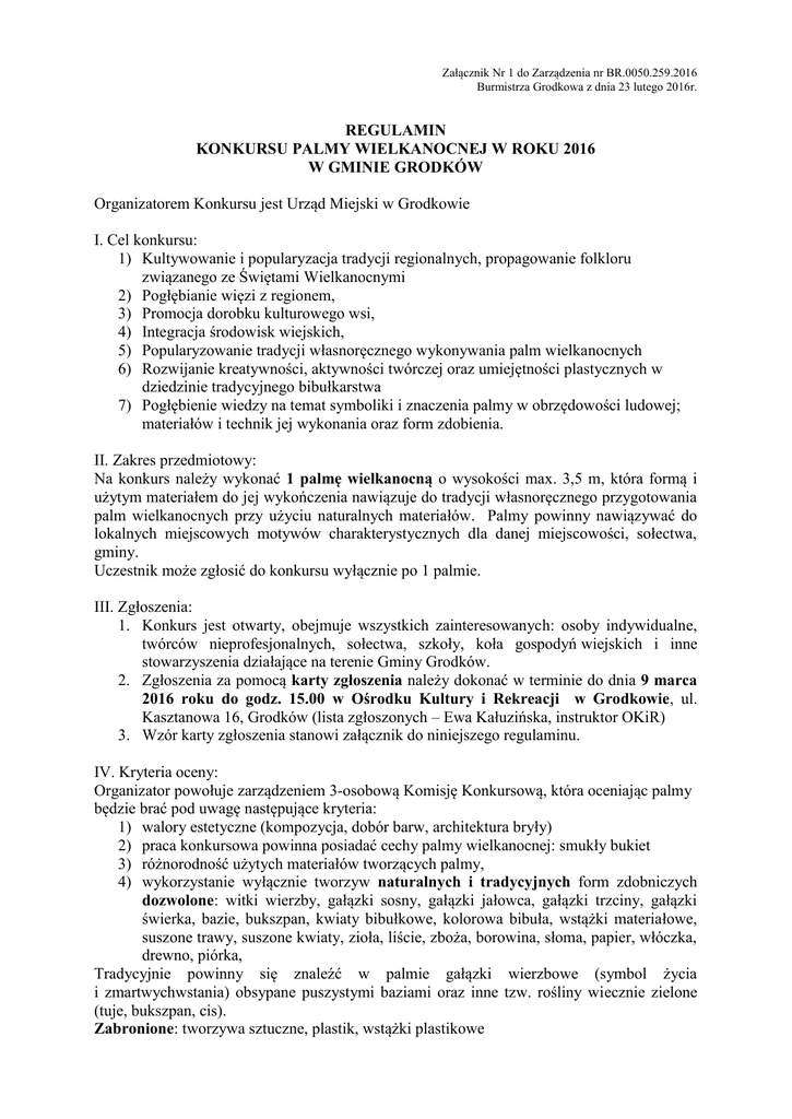 Załącznik Nr 1 do Zarządzenia nr BR.0050.259.2016 Burmistrza Grodkowa z dnia 23 lutego 2016r. REGULAMIN KONKURSU PALMY WIELKANOCNEJ W ROKU 2016 W GMINIE GRODKÓW Organizatorem Konkursu jest Urząd Miejski w Grodkowie I. Cel konkursu: 1) Kultywowanie i popularyzacja tradycji regionalnych, propagowanie folkloru związanego ze Świętami Wielkanocnymi 2) Pogłębianie więzi z regionem, 3) Promocja dorobku kulturowego wsi, 4) Integracja środowisk wiejskich, 5) Popularyzowanie tradycji własnoręcznego wykonywania palm wielkanocnych 6) Rozwijanie kreatywności, aktywności twórczej oraz umiejętności plastycznych w dziedzinie tradycyjnego bibułkarstwa 7) Pogłębienie wiedzy na temat symboliki i znaczenia palmy w obrzędowości ludowej; materiałów i technik jej wykonania oraz form zdobienia. II. Zakres przedmiotowy: Na konkurs należy wykonać 1 palmę wielkanocną o wysokości max. 3,5 m, która formą i użytym materiałem do jej wykończenia nawiązuje do tradycji własnoręcznego przygotowania palm wielkanocnych przy użyciu naturalnych materiałów. Palmy powinny nawiązywać do lokalnych miejscowych motywów charakterystycznych dla danej miejscowości, sołectwa, gminy. Uczestnik może zgłosić do konkursu wyłącznie po 1 palmie. III. Zgłoszenia: 1. Konkurs jest otwarty, obejmuje wszystkich zainteresowanych: osoby indywidualne, twórców nieprofesjonalnych, sołectwa, szkoły, koła gospodyń wiejskich i inne stowarzyszenia działające na terenie Gminy Grodków. 2. Zgłoszenia za pomocą karty zgłoszenia należy dokonać w terminie do dnia 9 marca 2016 roku do godz. 15.00 w Ośrodku Kultury i Rekreacji w Grodkowie, ul. Kasztanowa 16, Grodków (lista zgłoszonych – Ewa Kałuzińska, instruktor OKiR) 3. Wzór karty zgłoszenia stanowi załącznik do niniejszego regulaminu. IV. Kryteria oceny: Organizator powołuje zarządzeniem 3-osobową Komisję Konkursową, która oceniając palmy będzie brać pod uwagę następujące kryteria: 1) walory estetyczne (kompozycja, dobór barw, architektura bryły) 2) praca konkursowa powinna posiadać cechy palmy wielkanocnej: smukły bukiet 3) różnorodność użytych materiałów tworzących palmy, 4) wykorzystanie wyłącznie tworzyw naturalnych i tradycyjnych form zdobniczych dozwolone: witki wierzby, gałązki sosny, gałązki jałowca, gałązki trzciny, gałązki świerka, bazie, bukszpan, kwiaty bibułkowe, kolorowa bibuła, wstążki materiałowe, suszone trawy, suszone kwiaty, zioła, liście, zboża, borowina, słoma, papier, włóczka, drewno, piórka, Tradycyjnie powinny się znaleźć w palmie gałązki wierzbowe (symbol życia i zmartwychwstania) obsypane puszystymi baziami oraz inne tzw. rośliny wiecznie zielone (tuje, bukszpan, cis). Zabronione: tworzywa sztuczne, plastik, wstążki plastikowe 5) tradycyjne techniki tworzenia motywów tworzących palmy. V. Przebieg konkursu: 1. Palmy należy dostarczyć w dniu Jarmarku Wielkanocnego 20 marca na rynek w Grodkowie przed jego rozpoczęciem (rozpoczęcie godzina 10.00), gdzie zostaną ustawione i poddane ocenie jury. 2. Palmom zostaje nadany numer, a następnie jury ocenia palmy 3. Wręczanie nagród odbędzie się podczas Jarmarku Wielkanocnego 4. Palma pozostaje własnością grupy wykonawców, a po wręczeniu nagród i zakończeniu Jarmarku Wielkanocnego może zostać zabrana przez zgłaszającego. VI. Nagrody: Dla 3 najwyżej ocenionych palm organizator przewiduje nagrody. Organizator zastrzega sobie prawo do innego podziału nagród. . VII. Postanowienia końcowe: 1. Komisja konkursu jest niezawisła w swojej ocenie. Jej werdykt jest niepodważalny i ostateczny. Przebieg prac komisji jest udokumentowany w protokole. 2. Udział w konkursie jest jednoznaczny z wyrażeniem zgody przez każdego uczestnika na wykorzystanie i przetwarzanie swoich danych osobowych przez Organizatora w celu wyłonienia zwycięzcy i przyznania nagrody; umieszczenia danych w materiałach publikowanych przez Organizatora i na stronie internetowej Organizatora; promocji konkursu lub idei konkursu. W sprawach organizacyjnych proszę kontaktować się z organizatorami konkursu: Urząd Miejski w Grodkowie Dorota Zawadzka, tel. 77 40 40 345