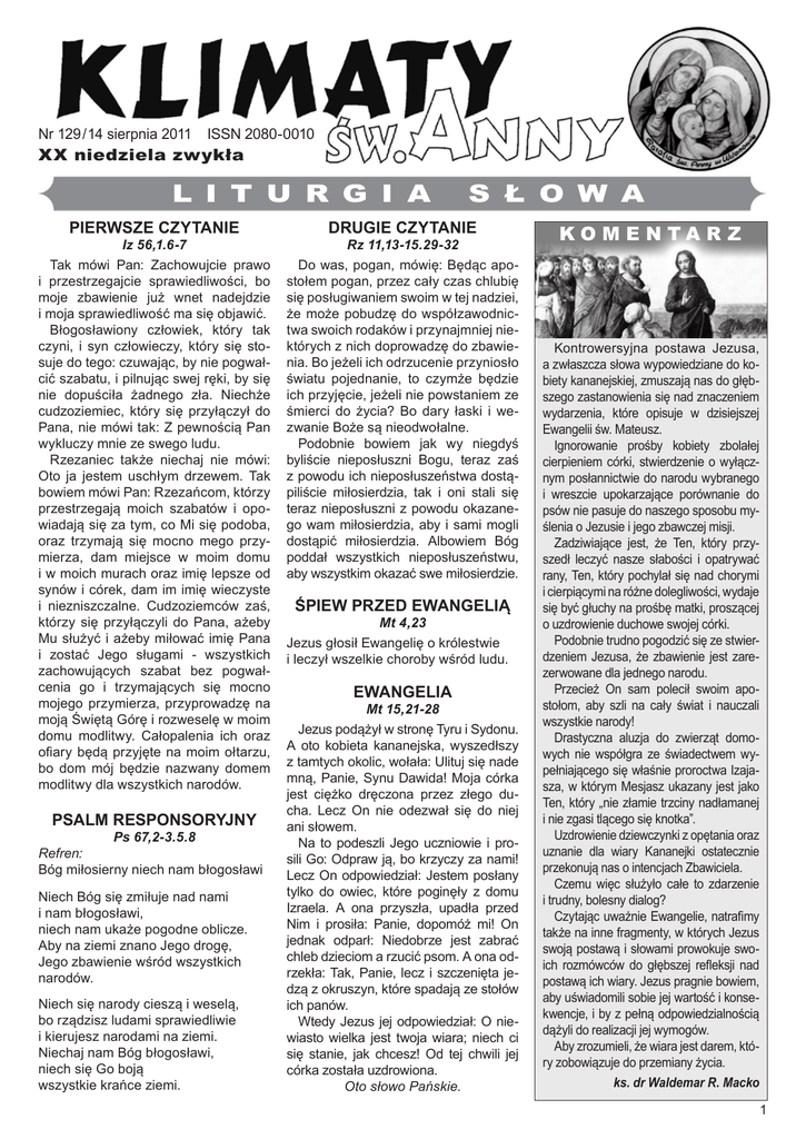 Nr 129 /14 sierpnia 2011 ISSN 2080-0010 XX niedziela zwykła L I T U R G I A PIERWSZE CZYTANIE Iz 56,1.6-7 Tak mówi Pan: Zachowujcie prawo i przestrzegajcie sprawiedliwości, bo moje zbawienie już wnet nadejdzie i moja sprawiedliwość ma się objawić. Błogosławiony człowiek, który tak czyni, i syn człowieczy, który się stosuje do tego: czuwając, by nie pogwałcić szabatu, i pilnując swej ręki, by się nie dopuściła żadnego zła. Niechże cudzoziemiec, który się przyłączył do Pana, nie mówi tak: Z pewnością Pan wykluczy mnie ze swego ludu. Rzezaniec także niechaj nie mówi: Oto ja jestem uschłym drzewem. Tak bowiem mówi Pan: Rzezańcom, którzy przestrzegają moich szabatów i opowiadają się za tym, co Mi się podoba, oraz trzymają się mocno mego przymierza, dam miejsce w moim domu i w moich murach oraz imię lepsze od synów i córek, dam im imię wieczyste i niezniszczalne. Cudzoziemców zaś, którzy się przyłączyli do Pana, ażeby Mu służyć i ażeby miłować imię Pana i zostać Jego sługami - wszystkich zachowujących szabat bez pogwałcenia go i trzymających się mocno mojego przymierza, przyprowadzę na moją Świętą Górę i rozweselę w moim domu modlitwy. Całopalenia ich oraz ofiary będą przyjęte na moim ołtarzu, bo dom mój będzie nazwany domem modlitwy dla wszystkich narodów. PSALM RESPONSORYJNY Ps 67,2-3.5.8 Refren: Bóg miłosierny niech nam błogosławi Niech Bóg się zmiłuje nad nami i nam błogosławi, niech nam ukaże pogodne oblicze. Aby na ziemi znano Jego drogę, Jego zbawienie wśród wszystkich narodów. Niech się narody cieszą i weselą, bo rządzisz ludami sprawiedliwie i kierujesz narodami na ziemi. Niechaj nam Bóg błogosławi, niech się Go boją wszystkie krańce ziemi. S Ł O W A DRUGIE CZYTANIE Rz 11,13-15.29-32 Do was, pogan, mówię: Będąc apostołem pogan, przez cały czas chlubię się posługiwaniem swoim w tej nadziei, że może pobudzę do współzawodnictwa swoich rodaków i przynajmniej niektórych z nich doprowadzę do zbawienia. Bo jeżeli ich odrzucenie przyniosło światu pojednanie, to czymże będzie ich przyjęcie, jeżeli nie powstaniem ze śmierci do życia? Bo dary łaski i wezwanie Boże są nieodwołalne. Podobnie bowiem jak wy niegdyś byliście nieposłuszni Bogu, teraz zaś z powodu ich nieposłuszeństwa dostąpiliście miłosierdzia, tak i oni stali się teraz nieposłuszni z powodu okazanego wam miłosierdzia, aby i sami mogli dostąpić miłosierdzia. Albowiem Bóg poddał wszystkich nieposłuszeństwu, aby wszystkim okazać swe miłosierdzie. ŚPIEW PRZED EWANGELIĄ Mt 4,23 Jezus głosił Ewangelię o królestwie i leczył wszelkie choroby wśród ludu. EWANGELIA Mt 15,21-28 Jezus podążył w stronę Tyru i Sydonu. A oto kobieta kananejska, wyszedłszy z tamtych okolic, wołała: Ulituj się nade mną, Panie, Synu Dawida! Moja córka jest ciężko dręczona przez złego ducha. Lecz On nie odezwał się do niej ani słowem. Na to podeszli Jego uczniowie i prosili Go: Odpraw ją, bo krzyczy za nami! Lecz On odpowiedział: Jestem posłany tylko do owiec, które poginęły z domu Izraela. A ona przyszła, upadła przed Nim i prosiła: Panie, dopomóż mi! On jednak odparł: Niedobrze jest zabrać chleb dzieciom a rzucić psom. A ona odrzekła: Tak, Panie, lecz i szczenięta jedzą z okruszyn, które spadają ze stołów ich panów. Wtedy Jezus jej odpowiedział: O niewiasto wielka jest twoja wiara; niech ci się stanie, jak chcesz! Od tej chwili jej córka została uzdrowiona. Oto słowo Pańskie. KOM E NTA R Z Kontrowersyjna postawa Jezusa, a zwłaszcza słowa wypowiedziane do kobiety kananejskiej, zmuszają nas do głębszego zastanowienia się nad znaczeniem wydarzenia, które opisuje w dzisiejszej Ewangelii św. Mateusz. Ignorowanie prośby kobiety zbolałej cierpieniem córki, stwierdzenie o wyłącznym posłannictwie do narodu wybranego i wreszcie upokarzające porównanie do psów nie pasuje do naszego sposobu myślenia o Jezusie i jego zbawczej misji. Zadziwiające jest, że Ten, który przyszedł leczyć nasze słabości i opatrywać rany, Ten, który pochylał się nad chorymi i cierpiącymi na różne dolegliwości, wydaje się być głuchy na prośbę matki, proszącej o uzdrowienie duchowe swojej córki. Podobnie trudno pogodzić się ze stwierdzeniem Jezusa, że zbawienie jest zarezerwowane dla jednego narodu. Przecież On sam polecił swoim apostołom, aby szli na cały świat i nauczali wszystkie narody! Drastyczna aluzja do zwierząt domowych nie współgra ze świadectwem wypełniającego się właśnie proroctwa Izajasza, w którym Mesjasz ukazany jest jako Ten, który „nie złamie trzciny nadłamanej i nie zgasi tlącego się knotka”. Uzdrowienie dziewczynki z opętania oraz uznanie dla wiary Kananejki ostatecznie przekonują nas o intencjach Zbawiciela. Czemu więc służyło całe to zdarzenie i trudny, bolesny dialog? Czytając uważnie Ewangelie, natrafimy także na inne fragmenty, w których Jezus swoją postawą i słowami prowokuje swoich rozmówców do głębszej refleksji nad postawą ich wiary. Jezus pragnie bowiem, aby uświadomili sobie jej wartość i konsekwencje, i by z pełną odpowiedzialnością dążyli do realizacji jej wymogów. Aby zrozumieli, że wiara jest darem, który zobowiązuje do przemiany życia. ks. dr Waldemar R. Macko 1 Święci naszych czasów PODSTAWY TEOLOGII MAŁŻEŃSTWA W PRZEMÓWIENIACH JANA PAWŁA II Kryterium pełnej oceny aktu wewnętrznego Docieramy w naszej analizie do trzeciego członu Chrystusowej wypowiedzi z Kazania na Górze (Mt 5,27-28): „Słyszeliście, że powiedziano: Nie cudzołóż [człon pierwszy]. A Ja powiadam wam: Każdy, kto pożądliwie patrzy na kobietę [człon drugi, gramatycznie zespolony z trzecim], już się z nią cudzołóstwa dopuścił w swoim sercu”. Zastosowana tutaj metoda podzielenia czy też „rozbicia” tej wypowiedzi na trzy kolejne człony może się wydać sztuczn