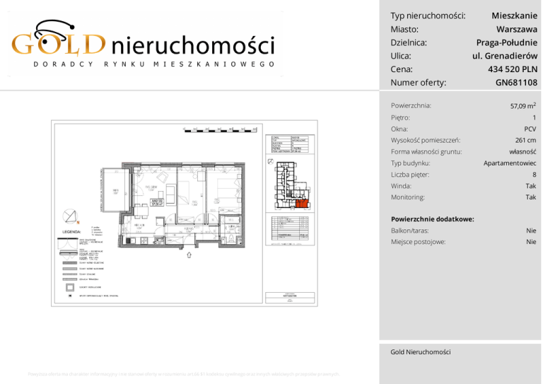 Typ nieruchomości: Mieszkanie Miasto: Warszawa Dzielnica: Praga-Południe Ulica: ul. Grenadierów Cena: 434 520 PLN Numer oferty: Powierzchnia: Piętro: Okna: GN681108 57,09 m2 1 PCV Wysokość pomieszczeń: 261 cm Forma własności gruntu: własność Typ budynku: Apartamentowiec Liczba pięter: 8 Winda: Tak Monitoring: Tak Powierzchnie dodatkowe: Balkon/taras: Nie Miejsce postojowe: Nie Gold Nieruchomości Powyższa oferta ma charakter informacyjny i nie stanowi oferty w rozumieniu art.66 $1 kodeksu cywilnego oraz innych właściwych przepsiów prawnych. Typ nieruchomości: Mieszkanie Miasto: Warszawa Dzielnica: Praga-Południe Ulica: ul. Grenadierów Cena: 434 520 PLN Numer oferty: Powierzchnia: Piętro: Okna: GN681108 57,09 m2 1 PCV Wysokość pomieszczeń: 261 cm Forma własności gruntu: własność Typ budynku: Apartamentowiec Liczba pięter: 8 Winda: Tak Monitoring: Tak Powierzchnie dodatkowe: Balkon/taras: Nie Miejsce postojowe: Nie Gold Nieruchomości Powyższa oferta ma charakter informacyjny i nie stanowi oferty w rozumieniu art.66 $1 kodeksu cywilnego oraz innych właściwych przepsiów prawnych. Typ nieruchomości: Mieszkanie Miasto: Warszawa Dzielnica: Praga-Południe Ulica: ul. Grenadierów Cena: 434 520 PLN Numer oferty: Opis Powierzchnia: Piętro: GN681108 57,09 m2 1 Wyjątkowe mieszkania na Pradze to nietuzinkowa inwestycja położona na Grochowie - w części warszawskiej Pragi. Nowoczesny projekt został zlokalizowany w jednym z najlepszych komunikacyjnie punktów dzielnicy. To tutaj najciekawsze atrybuty miejskiego życia harmonijnie przeplatają się z terenami zielonymi i mnóstwem praskich atrakcji. Okna: Kameralna i estetyczna zabudowa - zaledwie 84 mieszkania. 8 dopracowanych w każdym detalu pięter. Przestronne 1-, 2-, 3- i 4-pokojowe mieszkania już od 31 m2, a na ostatniej kondygnacji także dwupoziomowe apartamenty z dużymi tarasami o oryginalnych pergolach i metrażu 97 m2. Elegancki hol wejściowy utrzymany w minimalistycznych szarościach i beżach. Możliwość skorzystania z Inteligentnego Systemu Mieszkaniowego. Typ budynku: Apartamentowiec Liczba pięter: 8 Oferta z rynku pierwotnego, klient nie ponosi dodatkowych kosztów związanych z wynagrodzeniem pośrednika oraz PCC. Wysokość pomieszczeń: 261 cm Forma własności gruntu: własność Winda: Tak Monitoring: Tak Powierzchnie dodatkowe: Balkon/taras: Nie Miejsce postojowe: Nie Gold Nieruchomości Powyższa oferta ma charakter informacyjny i nie stanowi oferty w rozumieniu art.66 $1 kodeksu cywilnego oraz innych właściwych przepsiów prawnych. PCV