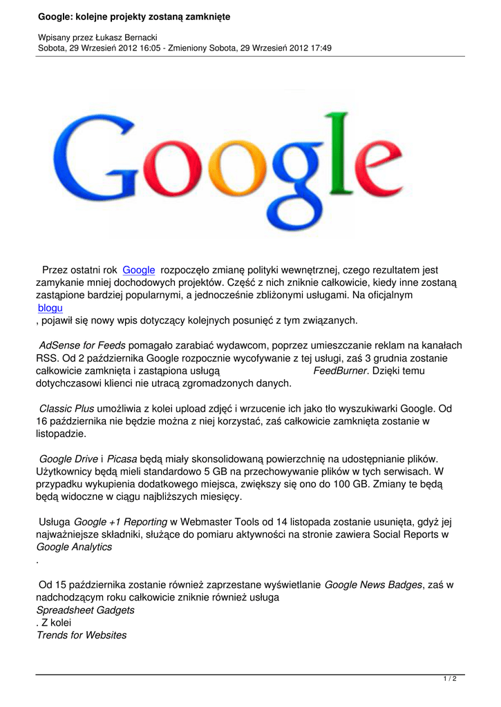 Google: kolejne projekty zostaną zamknięte Wpisany przez Łukasz Bernacki Sobota, 29 Wrzesień 2012 16:05 - Zmieniony Sobota, 29 Wrzesień 2012 17:49 Przez ostatni rok Google rozpoczęło zmianę polityki wewnętrznej, czego rezultatem jest zamykanie mniej dochodowych projektów. Część z nich zniknie całkowicie, kiedy inne zostaną zastąpione bardziej popularnymi, a jednocześnie zbliżonymi usługami. Na oficjalnym blogu , pojawił się nowy wpis dotyczący kolejnych posunięć z tym związanych. AdSense for Feeds pomagało zarabiać wydawcom, poprzez umieszczanie reklam na kanałach RSS. Od 2 października Google rozpocznie wycofywanie z tej usługi, zaś 3 grudnia zostanie całkowicie zamknięta i zastąpiona usługą FeedBurner. Dzięki temu dotychczasowi klienci nie utracą zgromadzonych danych. Classic Plus umożliwia z kolei upload zdjęć i wrzucenie ich jako tło wyszukiwarki Google. Od 16 października nie będzie można z niej korzystać, zaś całkowicie zamknięta zostanie w listopadzie. Google Drive i Picasa będą miały skonsolidowaną powierzchnię na udostępnianie plików. Użytkownicy będą mieli standardowo 5 GB na przechowywanie plików w tych serwisach. W przypadku wykupienia dodatkowego miejsca, zwiększy się ono do 100 GB. Zmiany te będą będą widoczne w ciągu najbliższych miesięcy. Usługa Google +1 Reporting w Webmaster Tools od 14 listopada zostanie usunięta, gdyż jej najważniejsze składniki, służące do pomiaru aktywności na stronie zawiera Social Reports w Google Analytics . Od 15 października zostanie również zaprzestane wyświetlanie Google News Badges, zaś w nadchodzącym roku całkowicie zniknie również usługa Spreadsheet Gadgets . Z kolei Trends for Websites 1/2 Google: kolejne projekty zostaną zamknięte Wpisany przez Łukasz Bernacki Sobota, 29 Wrzesień 2012 16:05 - Zmieniony Sobota, 29 Wrzesień 2012 17:49 będzie zastąpione usługą Google Trends . Na chwilę obecną to tyle nowości, choć Google w dalszym ciągu planuje kolejne zmiany. Te powinny zostać ogłoszone niebawem, o czym z pewnością poinformujemy. Źródło: Google Blog 2/2