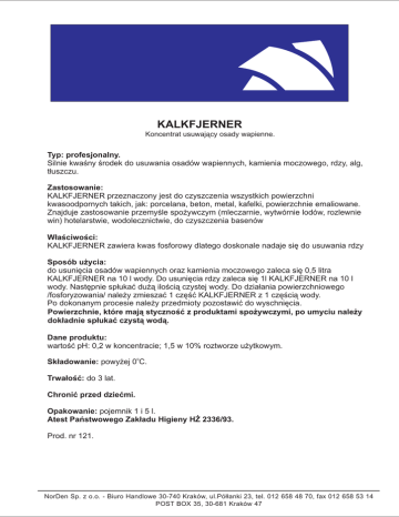 KALKFJERNER Koncentrat usuwaj¹cy osady wapienne. Typ: profesjonalny. Silnie kwaœny œrodek do usuwania osadów wapiennych, kamienia moczowego, rdzy, alg, t³uszczu. Zastosowanie: KALKFJERNER przeznaczony jest do czyszczenia wszystkich powierzchni kwasoodpornych takich, jak: porcelana, beton, metal, kafelki, powierzchnie emaliowane. Znajduje zastosowanie przemyœle spo¿ywczym (mleczarnie, wytwórnie lodów, rozlewnie win) hotelarstwie, wodolecznictwie, do czyszczenia basenów W³aœciwoœci: KALKFJERNER zawiera kwas fosforowy dlatego doskonale nadaje siê do usuwania rdzy Sposób u¿ycia: do usuniêcia osadów wapiennych oraz kamienia moczowego zaleca siê 0,5 litra KALKFJERNER na 10 l wody. Do usuniêcia rdzy zaleca siê 1l KALKFJERNER na 10 l wody. Nastêpnie sp³ukaæ du¿¹ iloœci¹ czystej wody. Do dzia³ania powierzchniowego /fosforyzowania/ nale¿y zmieszaæ 1 czêœæ KALKFJERNER z 1 czêœci¹ wody. Po dokonanym procesie nale¿y przedmioty pozostawiæ do wyschniêcia. Powierzchnie, które maj¹ stycznoœæ z produktami spo¿ywczymi, po umyciu nale¿y dok³adnie sp³ukaæ czyst¹ wod¹. Dane produktu: wartoœæ pH: 0,2 w koncentracie; 1,5 w 10% roztworze u¿ytkowym. o Sk³adowanie: powy¿ej 0 C. Trwa³oœæ: do 3 lat. Chroniæ przed dzieæmi. Opakowanie: pojemnik 1 i 5 l. Atest Pañstwowego Zak³adu Higieny H¯ 2336/93. Prod. nr 121. NorDen Sp. z o.o. - Biuro Handlowe 30-740 Kraków, ul.Pó³³anki 23, tel. 012 658 48 70, fax 012 658 53 14 POST BOX 35, 30-681 Kraków 47