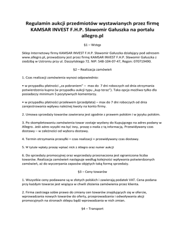 Regulamin aukcji przedmiotów wystawianych przez firmę KAMSAR INVEST F.H.P. Sławomir Gałuszka na portalu allegro.pl §1 – Wstęp Sklep Internetowy firmy KAMSAR INVEST F.H.P. Sławomir Gałuszka działający pod adresem www.allegro.pl, prowadzony jest przez firmę KAMSAR INVEST F.H.P. Sławomir Gałuszka z siedzibą w Ustroniu przy ul. Daszyńskiego 72. NIP: 548-104-07-47, Regon: 070719490. §2 – Realizacja zamówień 1. Czas realizacji zamówienia wynosi odpowiednio: • w przypadku płatności „za pobraniem” – max do 7 dni roboczych od dnia otrzymania potwierdzenia kupna (w przypadku aukcji typu „kup teraz”). Taka opcja możliwa tylko dla posiadaczy minimum 5 pozytywnych komentarzy. • w przypadku płatności przelewem (przedpłata) – max do 7 dni roboczych od dnia zarejestrowania wpływu należnej kwoty na konto firmy. 2. Umowa sprzedaży towarów zawierana jest zgodnie z prawem polskim i w języku polskim. 3. Po skompletowaniu zamówienia towar zostaje wysłany do Kupującego na adres podany w Allegro. Jeśli adres wysyłki ma być inny, proszę o maila z tą informacją. Przewidywany czas dostawy – w zależności od wyboru dostawy. 4. Termin otrzymania przesyłki = czas realizacji + przewidywany czas dostawy. 5. W tytule wpłaty proszę wpisać nick z Allegro oraz numer aukcji 6. Do sprzedaży promocyjnej oraz wyprzedaży przeznaczona jest ograniczona liczba towarów. Realizacja zamówień następuje według kolejności wpływania potwierdzonych zamówień, aż do wyczerpania zapasów objętych taką formą sprzedaży. §3 – Ceny towarów 1. Wszystkie ceny podawane są w złotych polskich i zawierają podatek VAT. Cena podana przy każdym towarze jest wiążąca w chwili złożenia zamówienia przez klienta. 2. Firma zastrzega sobie prawo do zmiany cen towarów znajdujących się w ofercie, wprowadzania nowych towarów do oferty, przeprowadzania i odwoływania akcji promocyjnych na stronach sklepu bądź wprowadzania w nich zmian. §4 – Transport 1. Za zamówione towary Kupujący może zapłacić wybierając jedną z poniższych form płatności: • za pobraniem przy odbiorze – należność pobiera kurier, • przelewem bankowym na konto FIRMY KAMSAR INVEST F.H.P. Sławomir Gałuszka • gotówką przy odbiorze osobistym towaru w siedzibie Firmy. Przed odbiorem osobistym prosimy o kontakt z Firmą pod numerem telefonu: 33/4865953 lub 502 045 738 2. Zamówiony towar wysyłany jest na terenie Polski za pośrednictwem firmy kurierskiej lub Poczty Polskiej. Cena wysyłki zawarta jest w opisie każdego wystawionego artykułu. 3. W tytule wpłaty proszę wpisać nick z Allegro oraz numer aukcji §5 – Zwrot towaru 1. Zgodnie z Ustawą z 2 marca 2000 roku „o ochronie niektórych praw konsumentów oraz o odpowiedzialności za szkodę wyrządzoną przez produkt niebezpieczny”, klient może zrezygnować z towaru kupionego w naszym sklepie bez podania przyczyny w ciągu 10 dni od dnia odebrania przesyłki. 2. Link do wzoru oświadczenia o odstąpieniu znajduje się poniżej niniejszego regulaminu. Jest to możliwe tylko wówczas, gdy towar nie nosi śladów użytkowania, jest kompletny i nie został w żaden sposób zniszczony. Zwracany towar należy odesłać razem z otrzymanym wraz z nim potwierdzeniem zapłaty. 3. Sklep gwarantuje zwrot kwoty równej cenie towaru. Pieniądze zostaną zwrócone w ciągu 5 dni roboczych przelewem bankowym na konto wskazane przez klienta. Koszt odesłania towaru nie podlega zwrotowi, pokrywa go Kupujący. 4. W przypadku zwrotu towaru z zamówienia, do którego dołączony był gratis promocyjny, Klient zobowiązany jest zwrócić także przedmiotowy gratis. W przypadku odmowy zwrotu gratisu, Sklep zwróci Klientowi cenę zwróconych pomniejszoną o wartość gratisu- zgodnie z ceną gratisu. §6 – Reklamacje i zwroty 1. Jeżeli po otrzymaniu towaru klient znajdzie w nim wady fizyczne powinien odesłać go na adres FIRMY: KAMSAR INVEST F.H.P. Sławomir Gałuszka, ul. Daszyńskiego 72, 43-450 Ustroń. 2. Sklep Firmy nie przyjmuje żadnych przesyłek odsyłanych za pobraniem. 3. Koszty związane z odesłaniem towaru reklamowanego sklep zwraca niezwłocznie po otrzymaniu przesyłki i rozpatrzeniu reklamacji. 4. Do odsyłanego towaru należy dołączyć dowód zakupu oraz opis przyczyny reklamacji. 5. Wszelkie reklamacje rozpatrywane są w ciągu 5 dni roboczych od dnia ich wpłynięcia. Towar uszkodzony zostanie wymieniony na nowy pełnowartościowy, a jeśli będzie to już niemożliwe (na przykład z powodu wyczerpania zapasów), sklep zwróci nabywcy równowartość ceny towaru lub zaoferuje mu do wyboru inne dostępne w sklepie towary. §7 – Postanowienia końcowe Sądem właściwym dla rozpatrywania sporów wynikających z umowy sprzedaży jest sąd właściwy dla siedziby pozwanego. WZÓR OŚWIADCZENIE O ODSTĄPIENIU OD UMOWY http://www.federacja-konsumentow.org.pl/n,45,865,12,1,wzor-oswiadczenia-oodstapieniu-od-umowy-zawartej-na-odleglosc.html