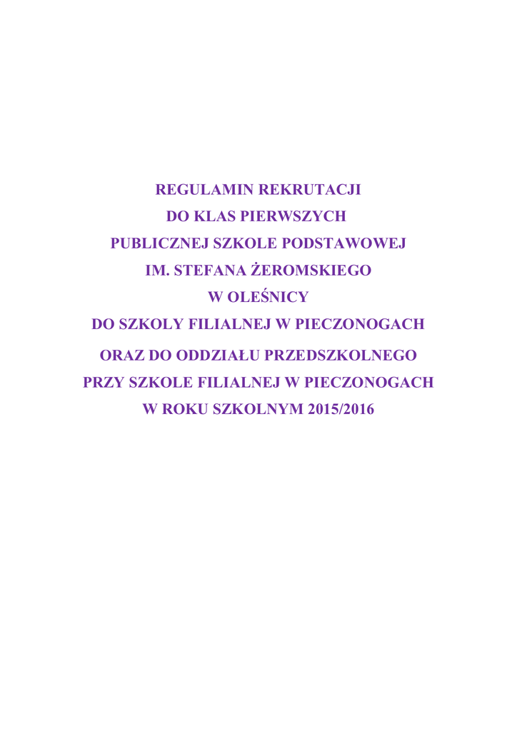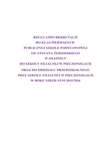 REGULAMIN REKRUTACJI DO KLAS PIERWSZYCH PUBLICZNEJ SZKOLE PODSTAWOWEJ IM. STEFANA ŻEROMSKIEGO W OLEŚNICY DO SZKOLY FILIALNEJ W PIECZONOGACH ORAZ DO ODDZIAŁU PRZEDSZKOLNEGO PRZY SZKOLE FILIALNEJ W PIECZONOGACH W ROKU SZKOLNYM 2015/2016 Na podstawie ustawy z dnia 6 grudnia 2013 r. o zmianie ustawy o systemie oświaty oraz niektórych innych ustaw (Dz. U. z 2014 r., poz. 7) oraz w oparciu o Statut szkoły ustala się , co następuje: §1 1. O przyjęciu do Publicznej Szkoły Podstawowej w Oleśnicy oraz Szkoły Filialnej w Pieczonogach decyduje dyrektor szkoły. 2. Uczniowie zamieszkujący obwód szkoły są przyjmowani z urzędu. 3. W celu przeprowadzenia rekrutacji do klas pierwszych dyrektor szkoły powołuje Komisję Rekrutacyjną. 4. Zadania Komisji Rekrutacyjnej określa niniejszy Regulamin. §2 1. Rekrutacją do klas I w szkole podstawowej i szkole filialnej objęte są dzieci, które w roku 2015 ukończą: 1) 6 lat, urodzone w 2009 roku ( wszystkie sześciolatki), 2) 7 lat, urodzone w 2008 roku ( siedmiolatki ), które nie podjęły nauki w pierwszej klasie w roku szkolnym 201/2015 2. Dzieci sześcioletnie są przyjmowane do szkoły pod warunkiem spełnienia rocznego obowiązku przedszkolnego, w roku poprzedzającym rok szkolnym, w którym dziecko ma rozpocząć naukę w szkole podstawowej. 3. Obowiązek wychowania przedszkolnego nie dotyczy dzieci posiadających pozytywną opinię poradni psychologiczno-pedagogicznej o możliwości rozpoczęcia spełniania obowiązku szkolnego. 4. Karta zapisu ucznia do szkoły podstawowej lub szkoły filialnej stanowi załącznik nr 1 . 5. Karta zapisu ucznia do oddziału przedszkolnego przy szkole filialnej stanowi załącznik nr 2 . §3 1. Do klasy pierwszej przyjmuje się na wniosek rodziców (prawnych opiekunów) również dzieci zamieszkałe poza obwodem szkoły, pod warunkiem, że szkoła posiada wolne miejsca. 2. Wniosek przyjęcia dziecka spoza obwodu stanowi załącznik nr 3. §4 1. Rodzice (prawni opiekunowie) dzieci ubiegających się o przyjęcie do klasy pierwszej składają w sekretariacie szkoły lub u kierownika szkoły filialnej następujące dokumenty: 1) wniosek o przyjęcie ucznia do szkoły podstawowej, 2) jedno zdjęcie (podpisane), 3) odpis/ kopia aktu urodzenia, 4) do wglądu - dowód osobisty rodziców (prawnych opiekunów), 5) zaświadczenie dyrektora przedszkola o spełnieniu obowiązku rocznego przygotowania przedszkolnego, 6) orzeczenie o potrzebie kształcenia specjalnego, wydane ze względu na niepełnosprawność lub o stanie niepełnosprawności. §5 1. Terminy składania dokumentów do szkoły podstawowej, szkoły filialnej i oddziału przedszkolnego: 1) podanie o przyjęcie– od 1 marca do 15 kwietnia, 2) ogłoszenie listy uczniów przyjętych do szkoły podstawowej, szkoły filialnej i oddziału przedszkolnego – do 30 czerwca, §6 1. Dyrektor powołuje komisję rekrutacyjną ds. rekrutacji. Komisja składają się z : 1) dyrektora szkoły podstawowej 2) wychowawców klas 3) pedagoga szkolnego 4) kierownika szkoły filialnej 2. Do zadań komisji rekrutacyjnej należy: 1) ogłoszenie zasad rekrutacji w przedszkolu lub oddziale przedszkolnym 2) ustalenie wyników postępowania rekrutacyjnego i podanie do publicznej wiadomości listy kandydatów zakwalifikowanych i przyjętych oraz niezakwalifikowanych i nieprzyjętych do szkoły podstawowej, szkoły filialnej lub oddziału przedszkolnego; 2) zebranie wniosków o przyjęcie do szkoły/oddziału przedszkolnego; 3) ustalenie składu osobowego oddziałów ; 4) liczba uczniów w klasach I nie może przekraczać 25 uczniów. Ostateczną decyzję podejmuje dyrektor szkoły w porozumieniu z organem prowadzącym. 5) W postępowaniu rekrutacyjnym obywatele polscy, którzy pobierali naukę w szkołach funkcjonujących w systemach oświaty innych państw, są przyjmowani do szkoły podstawowej na podstawie świadectwa, zaświadczenia lub innego dokumentu stwierdzającego ukończenie danej szkoły lub klasy oraz sumy lat nauki szkolnej ucznia. 6) Komisja rekrutacyjna sporządza protokół postępowania rekrutacyjnego 7) Od decyzji Komisji Rekrutacyjnej o nieprzyjęciu dziecka rodzice (prawni opiekunowie) mogą odwołać się do Komisji w terminie 7 dni od dnia ogłoszenia listy przyjętych uczniów . 8) Komisja Rekrutacyjna przygotowuje i wydaje uzasadnienie odmowy przyjęcia ucznia do szkoły w terminie 5 dni od dnia złożenia wniosku odwołania od decyzji Komisji. 9) Rodzice/Prawni opiekunowie mogą złożyć odwołanie od uzasadnienia Komisji dot. odmowy przyjęcia ucznia do szkoły do dyrektora w terminie do 7 dni od dnia otrzymania uzasadnienia Komisji. 10) Dyrektor szkoły w terminie 7 dni od dnia złożenia przez Rodziców/ Prawnych opiekunów odwołania od rozstrzygnięć Komisji Rekrutacyjnej pisemnie uzasadnia podjętą decyzję o przyjęciu lub nieprzyjęciu ucznia do szkoły. 11) Decyzja Dyrektora Szkoły jest ostateczna. §7 1. W przypadku większej liczby kandydatów spoza obwodu szkoły podstawowej tworzona jest lista rezerwowa, a uczniowie starający się o przyjęcie do szkoły muszą spełnić następujące kryteria szczegółowe: 1) Przynajmniej jeden z rodziców pracuje na terenie, w którym znajduje się szkoła – pkt. 1 2) Rodzeństwo dziecka uczęszcza do Publicznej Szkoły Podstawowej w Oleśnicy - 3pkt. 3) Rodzice lub jeden z rodziców są pracownikami Szkoły – 3pkt. 4) W obwodzie szkoły zamieszkują krewni dziecka, wspierający rodziców w opiece nad dzieckiem- 1pkt. 5) Dziecko uczęszczało do Przedszkola, znajdującego się w obwodzie Szkoły – 2 pkt. §8 Postanowienia końcowe: 1. O liczbie oddziałów i liczbie uczniów decyduje organ prowadzący w porozumieniu z dyrektorem szkoły; 2. Listy klas pierwszych szkoły podstawowej, szkoły filialnej i oddziału przedszkolnego z nazwiskami uczniów podaje się do wiadomości poprzez ogłoszenie w/w list podczas spotkania z rodzicami dzieci najpóźniej do 20 sierpnia. 3. Wszelkie kwestie 