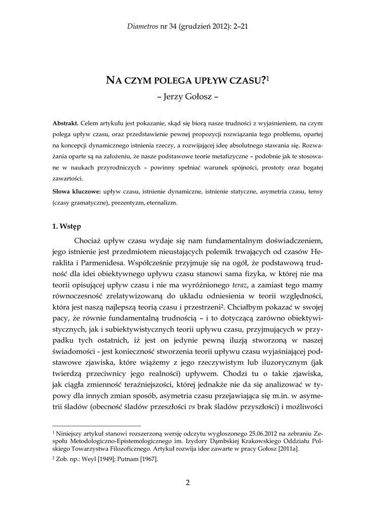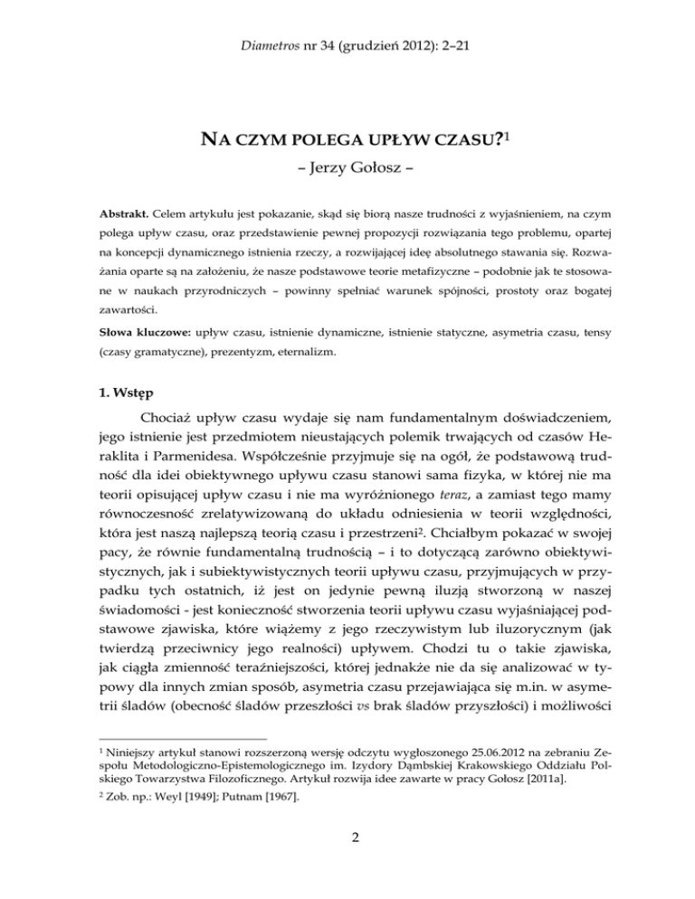 Diametros nr 34 (grudzień 2012): 2–21 NA CZYM POLEGA UPŁYW CZASU?1 – Jerzy Gołosz – Abstrakt. Celem artykułu jest pokazanie, skąd się biorą nasze trudności z wyjaśnieniem, na czym polega upływ czasu, oraz przedstawienie pewnej propozycji rozwiązania tego problemu, opartej na koncepcji dynamicznego istnienia rzeczy, a rozwijającej ideę absolutnego stawania się. Rozważania oparte są na założeniu, że nasze podstawowe teorie metafizyczne – podobnie jak te stosowane w naukach przyrodniczych – powinny spełniać warunek spójności, prostoty oraz bogatej zawartości. Słowa kluczowe: upływ czasu, istnienie dynamiczne, istnienie statyczne, asymetria czasu, tensy (czasy gramatyczne), prezentyzm, eternalizm. 1. Wstęp Chociaż upływ czasu wydaje się nam fundamentalnym doświadczeniem, jego istnienie jest przedmiotem nieustających polemik trwających od czasów Heraklita i Parmenidesa. Współcześnie przyjmuje się na ogół, że podstawową trudność dla idei obiektywnego upływu czasu stanowi sama fizyka, w której nie ma teorii opisującej upływ czasu i nie ma wyróżnionego teraz, a zamiast tego mamy równoczesność zrelatywizowaną do układu odniesienia w teorii względności, która jest naszą najlepszą teorią czasu i przestrzeni2. Chciałbym pokazać w swojej pacy, że równie fundamentalną trudnością – i to dotyczącą zarówno obiektywistycznych, jak i subiektywistycznych teorii upływu czasu, przyjmujących w przypadku tych ostatnich, iż jest on jedynie pewną iluzją stworzoną w naszej świadomości - jest konieczność stworzenia teorii upływu czasu wyjaśniającej podstawowe zjawiska, które wiążemy z jego rzeczywistym lub iluzorycznym (jak twierdzą przeciwnicy jego realności) upływem. Chodzi tu o takie zjawiska, jak ciągła zmienność teraźniejszości, której jednakże nie da się analizować w typowy dla innych zmian sposób, asymetria czasu przejawiająca się m.in. w asymetrii śladów (obecność śladów przeszłości vs brak śladów przyszłości) i możliwości Niniejszy artykuł stanowi rozszerzoną wersję odczytu wygłoszonego 25.06.2012 na zebraniu Zespołu Metodologiczno-Epistemologicznego im. Izydory Dąmbskiej Krakowskiego Oddziału Polskiego Towarzystwa Filozoficznego. Artykuł rozwija idee zawarte w pracy Gołosz [2011a]. 1 2 Zob. np.: Weyl [1949]; Putnam [1967]. 2 Jerzy Gołosz ◦ Na czym polega upływ czasu? wpływania tylko na przyszłe zdarzenia, oraz trwanie w czasie połączone, jak sądzimy, z zachowaniem tożsamości. Konieczność zastanowienia się nad tym, w jaki sposób można rozwiązać te problemy i na czym polega upływ czasu – co jest głównym celem tego artykułu – wynika z faktu, iż zagadnienie to jest logicznie pierwotne w stosunku do zagadnienia, czy to zjawisko istnieje (lub w jaki sposób istnieje); możemy przecież jakiejś rzeczy lub jakiegoś zjawiska szukać dopiero wtedy, gdy wiemy, czego mamy szukać. W następnej części mojej pracy chciałbym dokładniej omówić problemy, jakie muszą rozwiązać teorie upływu czasu, i przedstawić pewne warunki formalne, jakie powinny spełniać proponowane rozwiązania, zaś w kolejnej pokazać na kilku wybranych przykładach subiektywistycznych oraz obiektywistycznych koncepcji upływu czasu, na jakie trudności napotykają próby rozwiązania wspomnianych problemów. Nie jest to z założenia pełny przegląd różnych istniejących koncepcji upływu czasu3. Moim celem jest raczej pokazanie, jakie problemy muszą wyjaśnić różne teorie upływu czasu i przedstawienie pewnej logicznej drogi, która prowadzi do zaproponowanej w ostatnim rozdziale koncepcji opartej na idei dynamicznego istnienia rzeczy4. Artykuł zamyka krótka analiza zalet oraz wad przedstawionej propozycji. 2. Skąd się biorą trudności z odpowiedzią na pytanie, na czym polega upływ czasu? Z upływem czasu wiążemy cały szereg zjawisk, które każda teoria upływu czasu – fizyczna, metafizyczna, czy też psychologiczna (w przypadku negowania obiektywności upływu czasu) powinna wyjaśnić. Alternatywnie, jeżeli ktoś nie chce tych zjawisk wiązać z (obiektywnym) upływem czasu, powinien zaproponować niezależne ich wyjaśnienie. Wspomniane problemy mają następującą postać: 1. Na czym polega i skąd się bierze odczuwana przez nas nieustanna zmienność teraźniejszości? Jeżeli upływ czasu jest realny, to jaki jest ontologiczny status przedmiotów przeszłych i czym różnią się one od przedmiotów fikcyjnych? 3 Pełniejszy przegląd różnych teorii upływu czasu zawiera praca Gołosz [2011a]. Jakkolwiek będę pisał na ogół o dynamicznym istnieniu rzeczy, koncepcję tę można łatwo uogólnić tak, aby nie pociągała za sobą zobowiązania do uznawania istnienia tylko i wyłączne rzeczy; zamiast o dynamicznym istnieniu rzeczy można mówić o dynamicznym istnieniu wszystkich obiektów (włączając w to np. przestrzeń), z których składa się nasz świat. 4 3 Jerzy Gołosz ◦ Na czym polega upływ czasu? 2. Jaka jest geneza struktury tensowej naszego języka, związanej z kategoriami gramatycznymi czasów: przeszłego, teraźniejszego i przyszłego5? 3. Skąd się bierze asymetria czasu, czyli: a. asymetria śladów, i w szczególności naszej wiedzy dotyczącej przeszłości i przyszłości: przeszłość pozostawia ślady, przyszłość możemy jedynie przewidywać. Co więcej, ślady przeszłości w sposób ciągły i systematyczny narastają, b. asymetria ustalona przeszłość – otwarta przyszłość, c. asymetria przyczynowości: przeszłość wpływa kauzalnie na przyszłość, odwrotnych związków przyczynowych nie znajdujemy. 4. Problem trwania w czasie: trwamy w czasie zachowując – jak sądzimy – swoją ścisłą (numeryczną) identyczność i będąc w całości obecni w każdej chwili czasu (czyli endurujemy). Jeżeli ktoś uznaje alternatywnie perdurowanie, czyli trwania w czasie przez czasowe części, które 
