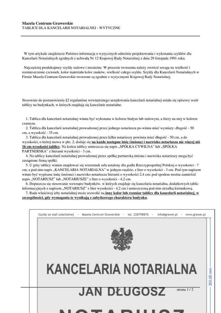 Mazela Centrum Grawerskie TABLICE DLA KANCELARII NOTARIALNEJ - WYTYCZNE W tym artykule znajdziecie Państwo informację o wytycznych odnośnie projektowania i wykonania szyldów dla Kancelarii Notarialnych zgodnych z uchwałą Nr 12 Krajowej Rady Notarialnej z dnia 29 listopada 1991 roku. Najczęściej produkujmey szyldy stalowe i mosieżne. W procesie tworzenia należy zwrócić uwagę na wielkość i rozmieszczenie czcionek, kolor materiału kolor znaków, wielkość całego szyldu. Szyldy dla Kancelarii Notarialnych w Firmie Mazela Centrum Grawerskie tworzone są zgodnie z wytycznymi Krajowej Rady Notarialnej. Stosownie do postanowienia §2 regulaminu wewnętrznego urzędowania kancelarii notarialnej ustala się opisowy wzór tablicy na budynkach, w których znajdują się kancelarie notarialne. 1. Tablica dla kancelarii notarialnej winna być wykonana w kolorze białym lub stalowym, a litery na niej w kolorze czarnym. 2. Tablica dla kancelarii notarialnej prowadzonej przez jednego notariusza po-winna mieć wymiary: długość - 50 cm, a wysokość - 35 cm. 3. Tablica dla kancelarii notarialnej prowadzonej przez kilku notariuszy powinna mieć długość - 50 cm, a do wysokości, o której mowa w pkt. 2, dodaje się na każde następne imię (imiona) i nazwisko notariusza nie więcej niż 16 cm wysokości tablicy. Na końcu tablicy umieszcza się napis „SPÓŁKA CYWILNA” lub „SPÓŁKA PARTNERSKA” z literami wysokości - 3 cm. 4. Na tablicy kancelarii notarialnej prowadzonej przez spółkę partnerską imiona i nazwiska notariuszy mogą być zastąpione firmą spółki. 5. U góry tablicy winien znajdować się wizerunek orła ustalony dla godła Rzeczypospolitej Polskiej o wysokości - 7 cm, a pod nim napis „KANCELARIA NOTARIALNA” w jednym rzędzie, z liter o wysokości - 3 cm. Pod tym napisem winno być wypisane imię (imiona) i nazwisko notariusza literami o wysokości 2,4 cm; pod spodem można zamieścić napis „NOTARIUSZ” lub „NOTARIUSZE” z liter o wysokości - 4,2 cm. 6. Dopuszcza się stosowanie wewnątrz budynków, w których znajduje się kancelaria notarialna, dodatkowych tablic informacyjnych z napisem „NOTARIUSZ” z liter wysokości - 4,2 cm i umieszczoną pod nim strzałką kierunkową. 7. Rada właściwej izby notarialnej może zezwolić na inny kolor lub rozmiar tablicy dla kancelarii notarialnej, w szczególności, gdy wymagania te wynikają z zabytkowego charakteru budynku. strona 1 / 2 Mazela Centrum Grawerskie TABLICE DLA KANCELARII NOTARIALNEJ - WYTYCZNE strona 2 / 2