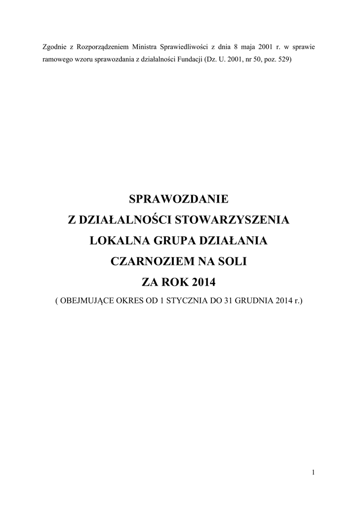 Zgodnie z Rozporządzeniem Ministra Sprawiedliwości z dnia 8 maja 2001 r. w sprawie ramowego wzoru sprawozdania z działalności Fundacji (Dz. U. 2001, nr 50, poz. 529) SPRAWOZDANIE Z DZIAŁALNOŚCI STOWARZYSZENIA LOKALNA GRUPA DZIAŁANIA CZARNOZIEM NA SOLI ZA ROK 2014 ( OBEJMUJĄCE OKRES OD 1 STYCZNIA DO 31 GRUDNIA 2014 r.) 1 1. Nazwa, siedziba i adres: Stowarzyszenie Lokalna Grupa Działania Czarnoziem na Soli, ul. Poznańska 133A, lok.106, 88 – 100 Inowrocław. Od dnia 5 maja 2014 roku siedziba Stowarzyszenia Lokalna Grupa Działania Lokalna Grupa Działania Czarnoziem na Soli znajduje się na ulicy Poznańskiej 133a lok. 106 w Inowrocławiu. 2. Podstawowy przedmiot działalności wg PKD: 9499Z – działalność pozostałych organizacji członkowskich, gdzie indziej niesklasyfikowana. 3. Wskazanie właściwego sądu prowadzącego rejestr: Krajowy Rejestr Sądowy nr 0000320289 z dnia 31.10.2014r. 4. Statystyczny numer identyfikacyjny w systemie REGON: 340538466. 5. Dane dotyczące członków Zarządu: Prezes Zarządu Stowarzyszenia: Paweł Drzażdżewski, zam. ul. Zajezierna 5B, 88 – 140 Gniewkowo (Powołanie członka Zarządu w dniu 9 grudnia 2008 r.); Wiceprezes Zarządu Stowarzyszenia: Grzegorz Stanisław Pomianowski, zam. ul. Długa 116, 88 – 133 Dąbrowa Biskupia (Powołanie członka Zarządu w dniu 9 grudnia 2008 r.); Sekretarz Zarządu Stowarzyszenia: Agnieszka Maria Giersz, zam. ul. Jęczmienna 38, 88 – 180 Złotniki Kujawskie (Powołanie członka Zarządu w dniu 9 grudnia 2008 r.); Członek Zarządu Stowarzyszenia: Barbara Kryszak, zam. ul. Alejnika 4/14, 88-100 Inowrocław (Powołanie członka Zarządu w dniu 19 września 2014 r.); 2 Członek Zarządu Stowarzyszenia: Jolanta Kubiak, Kłopot zam. 36, 88-100 Inowrocław (Powołanie członka Zarządu w dniu 6 maja 2012 r.); 6. Określenie celów statutowych Stowarzyszenia. Celem Stowarzyszenia LGD Czarnoziem na Soli jest działanie na rzecz rozwoju obszarów wiejskich z uwzględnieniem należytej ochrony, promocji środowiska naturalnego, krajobrazu i zasobów historyczno – kulturalnych oraz aktywizowanie ludności wiejskiej. Do celów statutowych Stowarzyszenia LGD Czarnoziem na Soli zaliczamy również: opracowanie i realizację Lokalnej Strategii Rozwoju, promocję obszarów wiejskich oraz gmin położonych na obszarze działania LGD, mobilizowanie społeczności lokalnej do wzięcia udziału w procesie zrównoważonego rozwoju obszarów wiejskich położonych na obszarze LGD, podejmowanie inicjatyw i działań mających na celu pobudzenie aktywności społeczności oraz ich czynny udział w opracowaniu i realizacji LSR, pozyskiwanie partnerów źródeł finansowania LSR, w tym z programów pomocowych, udzielanie wsparcia mieszkańcom obszaru objętego LSR w zakresie przygotowania projektów, pozyskiwania środków na ich realizację, w tym z programów pomocowych oraz innych projektów współfinansowanych ze środków Unii Europejskiej, podejmowanie inicjatyw i działań dla rozwoju Kujaw Zachodnich, pozyskiwanie innych źródeł finansowania, opracowanie i realizacja innych programów pomocowych oraz projektów współfinansowanych ze środków Unii Europejskiej, kreowanie lokalnych produktów i usług, w szczególności turystycznych, tworzenie infrastruktury turystycznej Kujaw Zachodnich, promocja i organizacja wolontariatu, prowadzenie działalności szkoleniowej i wydawniczej, ochrona praw kobiet oraz działalność na rzecz równych praw kobiet i mężczyzn, 3 współpraca międzynarodowa oraz z organizacjami pozarządowymi krajowymi i zagranicznymi, ze społecznościami lokalnymi i regionalnymi innych państw. Stowarzyszenie LGD Czarnoziem na Soli realizuje cele poprzez: opracowanie Lokalnej Strategii Rozwoju i przystąpienie do konkursu na jej realizację, organizowanego przez samorząd województwa, rozpowszechnianie założeń zatwierdzonej Lokalnej Strategii Rozwoju na obszarze działania LGD Czarnoziem na Soli, prowadzenie bezpłatnego doradztwa w zakresie przygotowania projektów związanych z realizacją Lokalnej Strategii Rozwoju, upowszechnianie informacji o warunkach i zasadach udzielania pomocy na realizację projektów przedkładanych przez wnioskodawców, kryteriach wyboru projektów oraz sposobie naboru wniosków o pomoc w ramach Lokalnej Strategii Rozwoju, informowanie za pomocą dostępnych środków przekazu, m.in. za pomocą strony internetowej, ogłoszeń w prasie lokalnej, o możliwości wstąpienia do Lokalnej Grupy Działania oraz o wyborze projektu do realizacji Lokalnej Strategii Rozwoju w ramach działania 4.1. Wdrażanie lokalnych strategii rozwoju, sprawdzanie zgodności projektów z założeniami Lokalnej Strategii Rozwoju, dokonywanie wyboru projektów do dofinansowania z puli środków przyznanych Lokalnej Grupie Działania na realizację Lokalnej Strategii Rozwoju w ramach działania 4.1. Wdrażanie lokalnych strategii rozwoju. Stowarzyszenie LGD Czarnoziem na Soli organizuje i finansuje: przedsięwzięcia o charakterze informacyjnym lub szkoleniowym, w tym szkolenia, kursy, warsztaty, wizyty studyjne, konferencje, akcje informacyjne i konkursy oraz inne formy przekazywania wiedzy, imprezy kulturalne, koncerty, festiwale, festyny, targi, pokazy i wystawy służące promocji regionu, jego tożsamości kulturowej, imprezy sportowo – rekreacyjne, zawody sportowe, punkty informacji turystycznej oraz inne usługi związane z obsługą ruchu turystycznego na obszarze działania Lokalnej Grupy Działania, punkty konsultacyjno – doradcze dla organizacji społecznych, przedsiębiorców z obszaru Lokalnej Grupy Działania, 4 działalność promocyjną, informacyjną, publicystyczną i poligraficzną, w tym: opracowywanie, redagowanie i druk ulotek, broszur, folderów, plakatów, kalendarzy, czasopism i innych publikacji, opracowywanie i rozpowszechnianie materiałów audiowizualnych, tworzenie stron internetowych, przygotowywanie i rozpowszechnianie innych materiałów o charakter