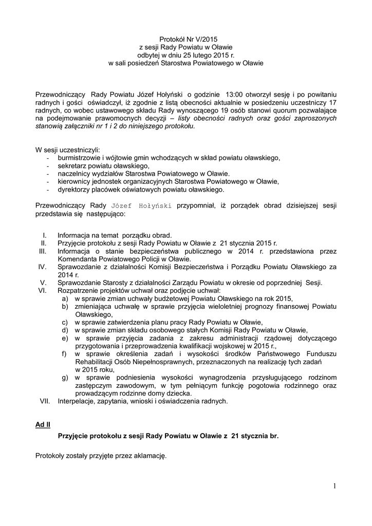 Protokół Nr V/2015 z sesji Rady Powiatu w Oławie odbytej w dniu 25 lutego 2015 r. w sali posiedzeń Starostwa Powiatowego w Oławie Przewodniczący Rady Powiatu Józef Hołyński o godzinie 13:00 otworzył sesję i po powitaniu radnych i gości oświadczył, iż zgodnie z listą obecności aktualnie w posiedzeniu uczestniczy 17 radnych, co wobec ustawowego składu Rady wynoszącego 19 osób stanowi quorum pozwalające na podejmowanie prawomocnych decyzji – listy obecności radnych oraz gości zaproszonych stanowią załączniki nr 1 i 2 do niniejszego protokołu. W sesji uczestniczyli: - burmistrzowie i wójtowie gmin wchodzących w skład powiatu oławskiego, - sekretarz powiatu oławskiego, - naczelnicy wydziałów Starostwa Powiatowego w Oławie. - kierownicy jednostek organizacyjnych Starostwa Powiatowego w Oławie, - dyrektorzy placówek oświatowych powiatu oławskiego. Przewodniczący Rady Józef przedstawia się następująco: I. II. III. IV. V. VI. VII. Hołyński przypomniał, iż porządek obrad dzisiejszej sesji Informacja na temat porządku obrad. Przyjęcie protokołu z sesji Rady Powiatu w Oławie z 21 stycznia 2015 r. Informacja o stanie bezpieczeństwa publicznego w 2014 r. przedstawiona przez Komendanta Powiatowego Policji w Oławie. Sprawozdanie z działalności Komisji Bezpieczeństwa i Porządku Powiatu Oławskiego za 2014 r. Sprawozdanie Starosty z działalności Zarządu Powiatu w okresie od poprzedniej Sesji. Rozpatrzenie projektów uchwał oraz podjęcie uchwał: a) w sprawie zmian uchwały budżetowej Powiatu Oławskiego na rok 2015, b) zmieniająca uchwałę w sprawie przyjęcia wieloletniej prognozy finansowej Powiatu Oławskiego, c) w sprawie zatwierdzenia planu pracy Rady Powiatu w Oławie, d) w sprawie zmian składu osobowego stałych Komisji Rady Powiatu w Oławie, e) w sprawie przyjęcia zadania z zakresu administracji rządowej dotyczącego przygotowania i przeprowadzenia kwalifikacji wojskowej w 2015 r., f) w sprawie określenia zadań i wysokości środków Państwowego Funduszu Rehabilitacji Osób Niepełnosprawnych, przeznaczonych na realizację tych zadań w 2015 roku, g) w sprawie podniesienia wysokości wynagrodzenia przysługującego rodzinom zastępczym zawodowym, w tym pełniącym funkcję pogotowia rodzinnego oraz prowadzącym rodzinne domy dziecka. Interpelacje, zapytania, wnioski i oświadczenia radnych. Ad II Przyjęcie protokołu z sesji Rady Powiatu w Oławie z 21 stycznia br. Protokoły zostały przyjęte przez aklamację. 1 Ad III Informacja o stanie bezpieczeństwa publicznego w 2014 r. przedstawiona przez Komendanta Powiatowego Policji w Oławie. Komendant Powiatowy Policji w Oławie Marek Bugajski przedstawił informację /załącznik nr 3/. Przewodniczący Rady Powiatu Józef Hołyński otworzył dyskusję. O udzielenie głosu poprosił radny Przemysław Pawłowicz, który zapytał o stan realizacji rozbudowy budynku Komendy Powiatowej Policji w Oławie? W odpowiedzi radnemu Komendant Powiatowy Policji Marek Bugajski poinformował, iż odbiór techniczny zaplanowany jest na połowę listopada br. Następnie radna Krystyna Cecko zapytała ilu funkcjonariuszy pracuje w Wydziale Ruchu Drogowego? Ponadto radna zapytała o przyczynę nieobsadzenia wolnych etatów oraz których stanowisk dotyczą? Komendant Marek Bugajski odpowiedział, iż w Wydziale Ruchu Drogowego w Oławie jest 14 etatów, w tym 1 wakat, natomiast jedna osoba przebywa na urlopie wychowawczym. Kontynuując Komendant wypowiedział się na temat przyczyn powstania wolnych stanowisk w Komendzie Powiatowej Policji w Oławie, wskazując przy tym m.in na sprawę stacji, która była przyczyną zwolnienia się z pracy naczelnika Wydziału Prewencji oraz dyżurnego. Dalej poinformował, iż centralny nabór w tym testy psychologiczne i sprawnościowe przeprowadza Wojewódzka Komenda Policji we Wrocławiu, po czym dodał, iż w roku bieżącym w wyniku przeprowadzonego naboru do Komendy Powiatowej Policji w Oławie zostało przydzielonych dwóch funkcjonariuszy.. Radna Krystyna Cecko zapytała o czy Komendant Powiatowy Policji ma bezpośredni wpływ na obsadzenie wakatów? W odpowiedzi radnej Komendant odpowiedział, iż przyjęcia są realizowane w miarę posiadanych środków finansowych na ten cel. Ponadto poinformował, iż problem jest sygnalizowany na każdej z odpraw z udziałem Komendanta Wojewódzkiego. Z uwagi na brak dalszych pytań, przewodniczący przystąpił do dalszej realizacji porządku obrad. Ad IV Sprawozdanie z działalności Oławskiego za 2014 r. Komisji Bezpieczeństwa i Porządku Powiatu Sprawozdanie z działalności Komisji Bezpieczeństwa i Porządku Publicznego za rok 2014 /załącznik nr 4/ przedstawił starosta oławski – Zdzisław Brezdeń. 2 Przewodniczący Rady otworzył dyskusję. Radny Przemysław Pawłowicz mając na uwadze informację o zanieczyszczeniu wody w rzece Oława, które zostało wykryte po kilku dniach od jego wystąpienia, zapytał w jaki sposób zmodyfikowano procedurę powiadamiania i reagowania na tego typu sytuacjach? Starosta odpowiedział, iż prawdopodobną przyczyną opóźnienia wykrycia zanieczyszczenia rzeki Oława była awaria urządzenia, które sygnalizowało zwiększony poziom amoniaku i mętności wody. Dalej starosta poinformował, iż do prowadzonych działań został włączony Państwowy Powiatowy Inspektor Sanitarny. Zdarzenie to pokazało, iż pewien obieg informacji nie działa właściwie, co niewątpliwie skłoniło, aby w przyszłości zostały wzmożone działania weryfikujące ten system. Z uwagi na brak dalszych pytań, przewodniczący Rady zamknął dyskusję, po czym ogłosił dziesięciominutową przerwę. Po przerwie przewodniczący Rady wznowił obrady. Ad V Sprawozdanie Starosty z działalności Zarządu Powiatu w okresie od poprzedniej Sesji. Starosta Oławski Zdzisław Brezdeń przedstawił sprawozdanie /załącznik nr 5/. Przewodniczący Rady Józef Hołyński otworzył dyskusję. O ud