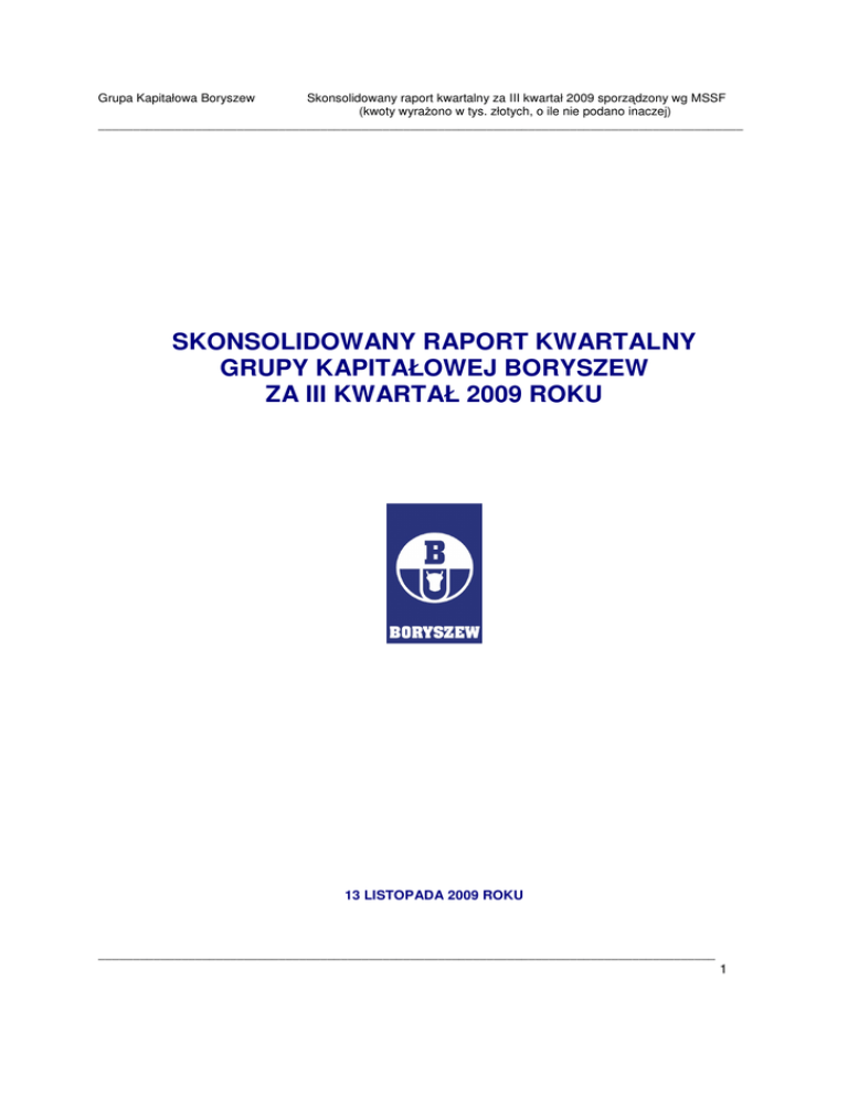 SKRÓCONY RAPORT KWARTALNY BORYSZEW S.A. ZA III KWARTAŁ 2009 ROKU