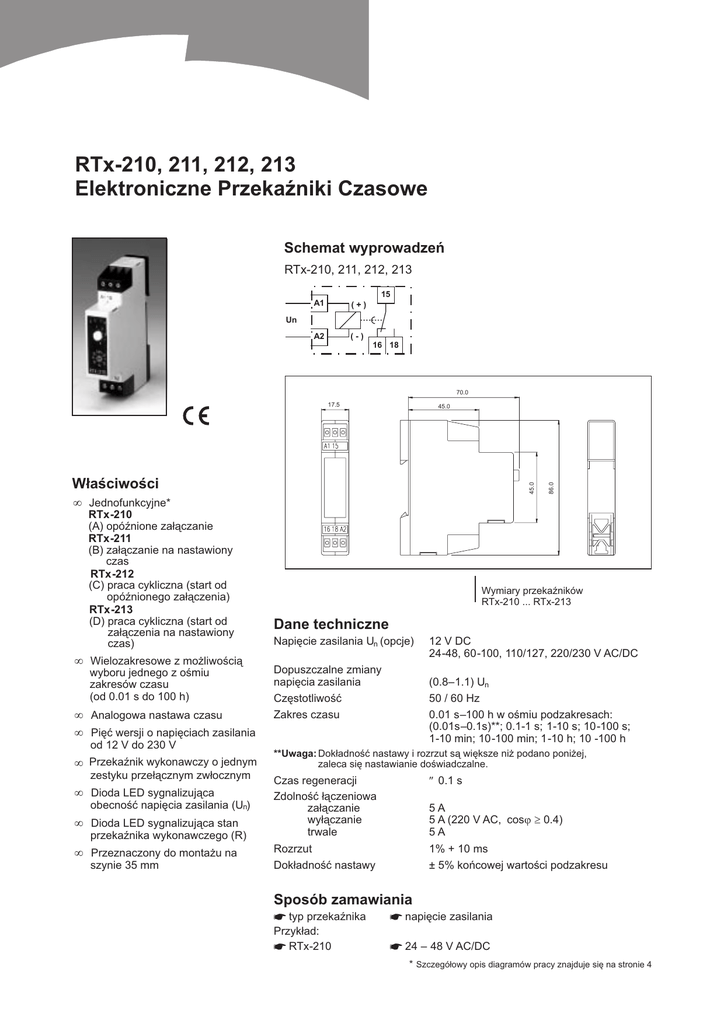 RTx-210, 211, 212, 213 Elektroniczne PrzekaŸniki Czasowe Schemat wyprowadzeñ RTx-210, 211, 212, 213 A1 (+) A2 (-) 15 Un 16 18 70.0 17.5 45.0 W³aœciwoœci 86.0 45.0 • Jednofunkcyjne* RTx-210 (A) opóŸnione za³¹czanie RTx-211 (B) za³¹czanie na nastawiony czas RTx-212 (C) praca cykliczna (start od opóŸnionego za³¹czenia) RTx-213 (D) praca cykliczna (start od za³¹czenia na nastawiony czas) • Wielozakresowe z mo¿liwoœci¹ wyboru jednego z oœmiu zakresów czasu (od 0.01 s do 100 h) • Analogowa nastawa czasu • Piêæ wersji o napiêciach zasilania od 12 V do 230 V • PrzekaŸnik wykonawczy o jednym zestyku prze³¹cznym zw³ocznym • Dioda LED sygnalizuj¹ca obecnoœæ napiêcia zasilania (Un) • Dioda LED sygnalizuj¹ca stan przekaŸnika wykonawczego (R) • Przeznaczony do monta¿u na szynie 35 mm Wymiary przekaŸników RTx-210 ... RTx-213 Dane techniczne Napiêcie zasilania Un (opcje) Dopuszczalne zmiany napiêcia zasilania Czêstotliwoœæ Zakres czasu 12 V DC 24-48, 60-100, 110/127, 220/230 V AC/DC (0.8–1.1) Un 50 / 60 Hz 0.01 s–100 h w oœmiu podzakresach: (0.01s–0.1s)**; 0.1-1 s; 1-10 s; 10-100 s; 1-10 min; 10-100 min; 1-10 h; 10 -100 h **Uwaga: Dok³adnoœæ nastawy i rozrzut s¹ wiêksze ni¿ podano poni¿ej, zaleca siê nastawianie doœwiadczalne. ≤ 0.1 s Czas regeneracji Zdolnoœæ ³¹czeniowa za³¹czanie wy³¹czanie trwale 5A 5 A (220 V AC, cosϕ ≥ 0.4) 5A Rozrzut Dok³adnoœæ nastawy 1% + 10 ms ± 5% koñcowej wartoœci podzakresu Sposób zamawiania * typ przekaŸnika Przyk³ad: * RTx-210 * napiêcie zasilania * 24 – 48 V AC/DC * Szczegó³owy opis diagramów pracy znajduje siê na stronie 4