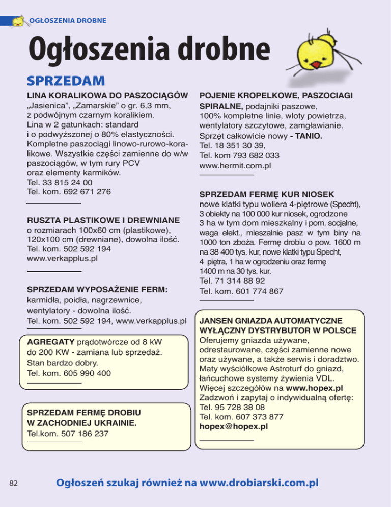 OGŁOSZENIA DROBNE Ogłoszenia drobne SPRZEDAM LINA KORALIKOWA DO PASZOCIĄGÓW „Jasienica”, „Zamarskie” o gr. 6,3 mm, z podwójnym czarnym koralikiem. Lina w 2 gatunkach: standard i o podwyższonej o 80% elastyczności. Kompletne paszociągi linowo-rurowo-koralikowe. Wszystkie części zamienne do w/w paszociągów, w tym rury PCV oraz elementy karmików. Tel. 33 815 24 00 Tel. kom. 692 671 276 RUSZTA PLASTIKOWE I DREWNIANE o rozmiarach 100x60 cm (plastikowe), 120x100 cm (drewniane), dowolna ilość. Tel. kom. 502 592 194 www.verkapplus.pl SPRZEDAM WYPOSAŻENIE FERM: karmidła, poidła, nagrzewnice, wentylatory - dowolna ilość. Tel. kom. 502 592 194, www.verkapplus.pl AGREGATY prądotwórcze od 8 kW do 200 KW - zamiana lub sprzedaż. Stan bardzo dobry. Tel. kom. 605 990 400 SPRZEDAM FERMĘ DROBIU W ZACHODNIEJ UKRAINIE. Tel.kom. 507 186 237 82 POJENIE KROPELKOWE, PASZOCIAGI SPIRALNE, podajniki paszowe, 100% kompletne linie, wloty powietrza, wentylatory szczytowe, zamgławianie. Sprzęt całkowicie nowy - TANIO. Tel. 18 351 30 39, Tel. kom 793 682 033 www.hermit.com.pl SPRZEDAM FERMĘ KUR NIOSEK nowe klatki typu woliera 4-piętrowe (Specht), 3 obiekty na 100 000 kur niosek, ogrodzone 3 ha w tym dom mieszkalny i pom. socjalne, waga elekt., mieszalnie pasz w tym biny na 1000 ton zboża. Fermę drobiu o pow. 1600 m na 38 400 tys. kur, nowe klatki typu Specht, 4 piętra, 1 ha w ogrodzeniu oraz fermę 1400 m na 30 tys. kur. Tel. 71 314 88 92 Tel. kom. 601 774 867 JANSEN GNIAZDA AUTOMATYCZNE WYŁĄCZNY DYSTRYBUTOR W POLSCE Oferujemy gniazda używane, odrestaurowane, części zamienne nowe oraz używane, a także serwis i doradztwo. Maty wyściółkowe Astroturf do gniazd, łańcuchowe systemy żywienia VDL. Więcej szczegółów na www.hopex.pl Zadzwoń i zapytaj o indywidualną ofertę: Tel. 95 728 38 08 Tel. kom. 607 373 877 [email protected] Ogłoszeń szukaj również na www.drobiarski.com.pl OGŁOSZENIA DROBNE SPRZEDAM AGREGATY prądotwórcze od 10 kVA do 2500 kVA - dobór agregatu w obiekcie inwestora - dostawy własnym transporetem - montaż - serwis gwarancyjny i pogwarancyjny Tel. 52 351 62 45 Tel. kom. 601 639 554 www.janaszkiewicz.eu ŁUSKARKI lodu „MAJA” i „HIGEL” od 100 do 6000 kg/dobę. Nowe i używane z gwarancją. Remonty maszyn. Najniższe ceny w kraju. Tel. kom. 602 283 252, Tel./fax. 33 815 61 35, e-mail: [email protected] Zapraszamy na naszą stronę: www.phu-west.pl SPRZEDAM Komory lęgowe D-36 - 3 sztuki Komory klujnikowe Atlas 180 - 2 szt Tace lęgowe( 50-siątki) Tel. kom. 509 223 050 AGOS SILOSY PASZOWE / ZBOŻOWE 5-140 t największy producent silosów Dozownik ziarna 5% - 50% - montowany pod koszem paszociągu lub z zasobnikiem 1200 kg. www.silosypaszowe.pl Tel/fax. 95 741 16 27 AGREGATY PRĄDOTWÓRCZE od 20 KW do 1000 KW, nowe i używane z gwarancją i dowozem na miejsce, naprawy główne i bieżące. Tel. kom. 605 209 828 www.agregaty-pradotworcze-kruszwica.pl MATY DEZYNFEKCYJNE do ferm drobiarskich, wylęgarni, ubojni. Rozmiar standard : 90x60 cm. Firma realizuje również zamówienia wg indywidualnych potrzeb Klienta. V I L S Tel. kom. 698 085 200 SORTOWNICE DO JAJ - naprawy bieżące, remonty kapitalne sortownic do jaj - skup, sprzedaż sortownic do jaj Tomax S.c. Tel. kom. 603 533 506, 603 533 502 www.sortownice.cba.pl KOMORA LĘGOWA Petersime - Digital S504 o pojemności 50 400 szt. jaj - 1 szt. SPRZEDAM Tel. kom. 604 750 281 Ogłoszeń szukaj również na www.drobiarski.com.pl 83 OGŁOSZENIA DROBNE SPRZEDAM SPRZEDAM: 4 rzędy, woliery, „Comfort 2”. Producent Firma Janssen z Barneveld, Holandia. Woliera wraz z 3 rzędami gniazd, w każdym rzędzie 51 gniazd z obsadą: ok. 21.000 kur. Dodatkowe wyposażenie: transporter poprzeczny do zbioru jaj. Urządzenia zostaną zwolnione w miesiącu sierpniu 2015r. Kontakt: Firma SPECHT, pan Hans Theo Ten Elsen, telefon: +49 1738796582 SPRZEDAŻ KUREK RASY ISA BROWN od 9 października 2015, wiek 15 tyg. Program szczepień do wglądu, dodatkowo szczepienia autoszczepionką SG. Ilość ok 45 000 tys. Ferma Drobiu Karniszyn Tel kom. 509 445 272 KARCHER - NOWE I UŻYWANE MYJKI CIŚNIENIOWE. Gwarancja, serwis, osprzęt. AGREGATY PRĄDOTWÓRCZE WOM 16-65 kVa. Największy wybór w Polsce. Gruber młyny do kukurydzy CCM, wysokowydajne gniotowniki walcowe do produkcji pasz. Tel. kom. 606 211 056, 507 158 699 www.karchex.eu 84 SORTOWNICE Sprzedaż - Skup Wydajność od 1600 szt./h do 50.000 szt./h, możliwość wraz z drukarką. Naprawy, remonty kapitalne - wszystkie typy. Tel./fax. 61 286 38 38 Tel. kom. 603 930 803 www.sortownicejuszczak.pl SPRZEDAM KURKI ODCHOWANE, towarowe i ogólnoużytkowe w różnym wieku. Tel. kom. 605 834 710 JAJA KURZE SKUP-SPRZEDAŻ Zakład Pakowania Jaj „KURAK”, Bieżuń, woj. mazowieckie. Tel./fax 23 68 41 718 Tel. kom. 606 334 400 SPRZEDAM FERMĘ DROBIU do 40 tys. kur niosek, chów klatkowy w trakcie produkcji, na działce ok 4 ha, 2 hale po 1800mkw, 1 hala 460 mkw, plus garaże 231mkw, mieszalnia pasz, sortownia jaj, magazyny jaj, biura, kotłownia, strych na zboże oraz 2 silosy po 250t, suszarnia zboża, waga samochodowa, płyta na pomiot, ogrzewanie olejowe, monitoring wraz z alarmem sms,całośc ogrodzona, teren utwardzony , dojazd drogą asfaltową ok 4 km od zjazdu na A4, teren może być wykorzystany jako inwestycyjny woj. opolskie Tel. kom. 608 778 585 Ogłoszeń szukaj również na www.drobiarski.com.pl OGŁOSZENIA DROBNE SPRZEDAM TANIO SPRZEDAM GNIAZDA AUTOMATYCZNE firmy BIG DUTCHMAN o długości 110 m dla kury lekkiej. Stan bardzo dobry. Tel. kom. 604 211 193 KURKI ODCHOWANE ROSA kolorowe w różnym wieku, możliwy dowóz. Sępólno Tel. kom. 600 539 790, 600 500 706 SPRZEDAM GNIAZDA AUTOMATYCZNE VENCOMATIC długość 108 mb, rok prod. 2011, ruszty z obydwóch stron, stan bardzo dobry, atrakcyjna cena. woj. wielkopolskie, Tel. kom. 602 831 199 SPRZEDAM KURKI Novogen i Lohmann brązowy, biały oraz sandy (produkuje kremowe jaja) w ilości 150 tys. sztuk, wstawione 01.