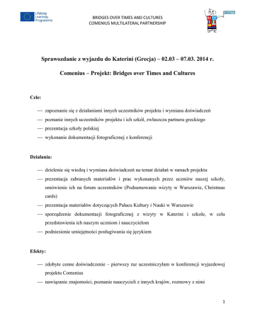 BRIDGES OVER TIMES AND CULTURES COMENIUS MULTILATERAL PARTNERSHIP Sprawozdanie z wyjazdu do Katerini (Grecja) – 02.03 – 07.03. 2014 r. Comenius – Projekt: Bridges over Times and Cultures Cele:  zapoznanie się z działaniami innych uczestników projektu i wymiana doświadczeń  poznanie innych uczestników projektu i ich szkół, zwłaszcza partnera greckiego  prezentacja szkoły polskiej  wykonanie dokumentacji fotograficznej z konferencji Działania:  dzielenie się wiedzą i wymiana doświadczeń na temat działań w ramach projektu  prezentacja zabranych materiałów i prac wykonanych przez uczniów naszej szkoły, omówienie ich na forum uczestników (Podsumowanie wizyty w Warszawie, Christmas cards)  prezentacja materiałów dotyczących Pałacu Kultury i Nauki w Warszawie  sporządzenie dokumentacji fotograficznej z wizyty w Katerini i szkole, w celu przedstawienia ich naszym uczniom i nauczycielom  podniesienie umiejętności posługiwania się językiem Efekty:  zdobyte cenne doświadczenie – pierwszy raz uczestniczyłam w konferencji wyjazdowej projektu Comenius  nawiązanie znajomości, poznanie nauczycieli z innych krajów, rozmowy z nimi 1 BRIDGES OVER TIMES AND CULTURES COMENIUS MULTILATERAL PARTNERSHIP  podniesienie kompetencji językowych i kompetencji związanych z funkcjonowaniem w międzynarodowej grupie  chęć przeniesienia niektórych zaobserwowanych praktyk z greckiej szkoły do mojej placówki, np. sposób popularyzacji informacji o realizowanych przedsięwzięciach w projekcie  zapoznanie rady pedagogicznej z korzyściami dla nauczyciela wynikającymi z udziału w projekcie (nauka języka, kontakty, obserwacja różnic kulturowych, poszerzenie horyzontów (np. mogłam opowiedzieć uczniom o ich młodszych kolegach z greckiej szkoły)  zdobycie doświadczenia koniecznego przy wypracowaniu kryteriów udziału kolejnych nauczycieli w wyjazdach  zapoznanie się z dokumentowaniem działań zespołów z krajów partnerskich  chęć udziału w kolejnych projektach międzynarodowych Wrażenia i przemyślenia: Jestem pod ogromnym wrażeniem przedstawienia przygotowanego dla gości z krajów partnerskich. Uczniowie przedstawili wybrane legendy krajów partnerskich, ich tańce i piosenki. Wykorzystywali język angielski i inne języki. Widać było ogromne zaangażowanie dzieci i dużą pracę nauczycieli. Przedstawienie było dopracowane w każdym szczególe (scenografia, stroje, wykonanie). Przed występami była część oficjalna w czasie, której każdy z uczestników otrzymał z rąk Pani Burmistrz certyfikat i pamiątkową statuetkę, czułam się ważnym gościem. W czasie pobytu w szkole zauważyłam, że uczniowie czują się w niej dobrze. Szkoła jest kolorowa i przyjazna. Uczniowie pracują w małych grupach (klasy 12-14 osobowe). 2 BRIDGES OVER TIMES AND CULTURES COMENIUS MULTILATERAL PARTNERSHIP Zainteresował mnie sposób upowszechniania informacji o pracach w projekcie. Na ścianie korytarza wisiała bardzo duża mapa Europy, na której wyróżnione były kraje partnerskie. Poniżej były informacje o każdym z przedsięwzięć realizowanych w projekcie. Bardzo mi się podoba taki sposób informowania społeczności szkolnej o realizacji poszczególnych zadań, bo każdy uczeń może zobaczyć co zostało zrealizowane, a później ewentualnie dołączyć do pracy w projekcie. To chciałabym zaproponować i zrealizować w mojej szkole. Jestem pod wrażeniem otwartości i wzajemnej współpracy nauczycieli partnerów projektu. Jest to ogromna wartość, taka możliwość kilkudniowego spotkania, rozmów i wymiany doświadczeń z pedagogami z innych krajów. Stwierdzam też, że udział w projekcie wymaga od nauczyciela komunikatywności, kreatywności i profesjonalnej realizacji działań. Wszyscy uczestnicy konferencji byli twórczy, podchodzili ambitnie do swoich zadań, nie byli tylko biernymi słuchaczami. Każdy był ciekawy kraju, który odwiedzał, lecz także informacji o kraju, szkołach, uczniach partnerów projektu. Anna Sętowska-Pasterny Nauczyciel matematyki, wychowawca klasy I The project has been funded by European Commission. This publication reflects the author’s opinions, therefore the European Commission is not responsible for the content of the above work. Projekt został zrealizowany przy wsparciu finansowym Komisji Europejskiej. Publikacja ta odzwierciedla stanowisko autorów, Komisja Europejska nie ponosi odpowiedzialności za jej zawartość merytoryczną. Warszawa, dn. 16 marca 2014 r. 3