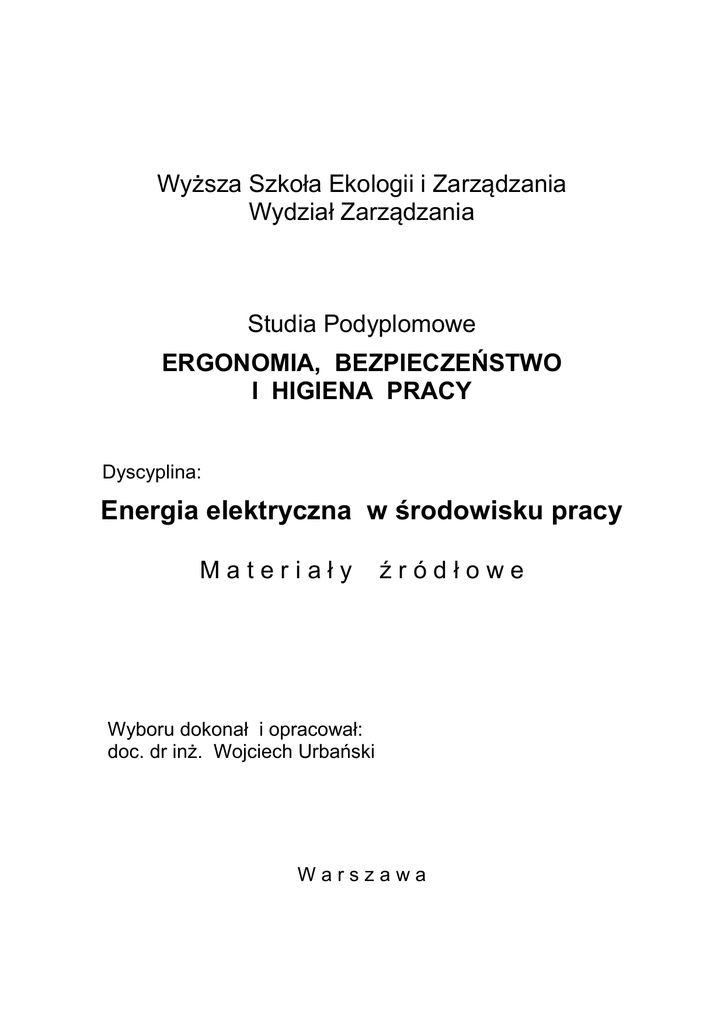 Wyższa Szkoła Ekologii i Zarządzania Wydział Zarządzania Studia Podyplomowe ERGONOMIA, BEZPIECZEŃSTWO I HIGIENA PRACY Dyscyplina: Energia elektryczna w środowisku pracy Materiały źródłowe Wyboru dokonał i opracował: doc. dr inż. Wojciech Urbański Warszawa ERGONOMIA, BEZPIECZEŃSTWO I ZDROWIE W ŚRODOWISKU PRACY Energia elektryczna w środowisku pracy SPIS TREŚCI 1. Piśmiennictwo 2. Zbór terminów dyscypliny 3. Układy sieciowe 4. Ochrona przeciwporażeniowa w urządzeniach i instalacjach 5. Obwody bardzo niskich napięć bezpiecznych 6. Urządzenia ochronne różnicowoprądowe 7. Separacja elektryczna 8. Połączenia wyrównawcze główne oraz dodatkowe (miejscowe) 9. Działanie prądu na organizm ludzki 10. Wytyczne postępowania w przypadku porażenia prądem elektrycznym 11. Postępowanie powypadkowe 1. PIŚMIENNICTWO [1]. Laskowski J.: Poradnik elektroenergetyka przemysłowego. Centralny Ośrodek Szkolenia i Wydawnictw SEP. Warszawa, 2005. [2]. Lenartowicz R., Zdunek W.: Sieci, urządzenia i instalacje elektryczne. Egzamin kwalifikacyjny. Grupa I. Dom Wydawniczy MEDIUM. Warszawa, 2003. [3]. Uczciwek T.: Dozór i eksploatacja instalacji oraz urządzeń elektroenergetycznych w zakładach przemysłowych i innych jednostkach gospodarczych. Centralny Ośrodek Szkolenia i Wydawnictw SEP. Warszawa, 2000. [4]. Uczciwek T.: Bezpieczeństwo i higiena pracy oraz ochrona przeciwpożarowa w elektroenergetyce. Centralny Ośrodek Szkolenia i Wydawnictw SEP. Warszawa, 1998. [5]. PN-IEC 364-4-481:1994. Instalacje elektryczne w obiektach budowlanych. Ochrona zapewniająca bezpieczeństwo. Dobór środków ochrony w zależności od wpływów zewnętrznych. Wybór środków ochrony przeciwporażeniowej w zależności od wpływów zewnętrznych. Polski Komitet Normalizacyjny. Warszawa, grudzień 1994. [6]. PN-IEC 60364-4-41:1999. Instalacje elektryczne w obiektach budowlanych. Ochrona dla zapewnienia bezpieczeństwa. Ochrona przeciwporażeniowa. Polski Komitet Normalizacyjny. Warszawa, luty 2000. [7]. PN-IEC 60364-4-43:1999. Instalacje elektryczne w obiektach budowlanych. Ochrona dla zapewnienia bezpieczeństwa. Ochrona przed prądem przetężeniowym. Polski Komitet Normalizacyjny. Warszawa, wrzesień 1999. [8]. PN-IEC 60364-4-47:1999. Instalacje elektryczne w obiektach budowlanych. Ochrona zapewniająca bezpieczeństwo. Zastosowanie środków ochrony zapewniających bezpieczeństwo. Postanowienia ogólne. Środki ochrony przed porażeniem prądem elektrycznym. Polski Komitet Normalizacyjny. Warszawa, maj 1999. [9]. PN-IEC 60364-5-54:1999. Instalacje elektryczne w obiektach budowlanych. Dobór i montaż wyposażenia elektrycznego. Uziemienia i przewody ochronne. Polski Komitet Normalizacyjny. Warszawa, listopad 1999. [10]. PN-IEC 60364-7-701:1999. Instalacje elektryczne w obiektach budowlanych. Wymagania dotyczące specjalnych instalacji lub lokalizacji. Pomieszczenia wyposażone w wannę lub/i basen kąpielowy. Polski Komitet Normalizacyjny. Warszawa, wrzesień 1999. [11]. PN-IEC 60364-7-701:1999. Instalacje elektryczne w obiektach budowlanych. Wymagania dotyczące specjalnych instalacji lub lokalizacji. Baseny pływackie i inne. Polski Komitet Normalizacyjny. Warszawa, wrzesień 1999. 2. ZBIÓR TERMINÓW DYSCYPLINY 1) część czynna - żyła przewodu lub inna cześć przewodząca prąd elektryczny, znajdująca się w czasie normalnej pracy pod napięciem, w tym także przewód neutralny N, z wyjątkiem przewodu ochronno-neutralnego PEN; 2) części jednocześnie dostępne - części czynne, części przewodzące dostępne, części przewodzące obce, przewody ochronne, wyrównawcze i uziomy, które znajdują się w zasięgu ręki; 3) część przewodząca dostępna - przedmiot przewodzący lub cześć przewodząca urządzenia, znajdująca się w zasięgu ręki, oddzielona od części czynnych jedynie izolacją roboczą, mogąca znaleźć się w warunkach zakłóceniowych pod napięciem, 4) część przewodząca obca - przedmiot przewodzący lub cześć przewodząca, nie będąca częścią urządzenia elektrycznego, mogąca znaleźć się pod napięciem, 5) miejsce dostępne - miejsce, do którego można się dostać bez korzystania z przedmiotów pomocniczych, jak np. drabiny, słupołazy, 6) izolacja ochronna - środek dodatkowej ochrony przeciwporażeniowej z zastosowaniem izolacji ograniczającej możliwość porażenia prądem elektrycznym; do izolacji takiej zalicza się izolację podwójną, izolację wzmocnioną, obudowę izolacyjną; są to izolacje o właściwościach co najmniej równoważnych pod względem elektrycznym i mechanicznym izolacji roboczej, 7) izolacja robocza - izolacja części czynnej, niezbędna do zapewnienia należytej pracy urządzenia elektrycznego, która jednocześnie zapewnia ochronę przeciwporażeniową, 8) izolacja stanowiska - środek ochrony przeciwporażeniowej dodatkowej, polegający na izolowaniu stanowiska od ziemi i wyrównaniu potencjałów obcych części przewodzących a dostępnych z tego stanowiska, 9) napięcie dotykowe - napięcie, które występuje w warunkach normalnych lub może pojawić się w warunkach zakłóceniowych pomiędzy dwiema częściami jednocześnie dostępnymi, nie należącymi do obwodu elektrycznego, 10) ochrona przeciwporażeniowa podstawowa (ochrona przed dotykiem bezpośrednim) - ochrona zapobiegająca niebezpiecznym skutkom dotknięcia części czynnych, 11) ochrona przeciwporażeniowa dodatkowa (ochrona przed dotykiem pośrednim) - ochrona zapobiegająca niebezpiecznym skutkom dotknięcia części przewodzących, dostępnych w przypadku pojawienia się na nich napięcia w warunkach zakłóceniowych, 12) odbiornik ręczny - odbiornik, który w czasie pracy trzymany jest w ręku, np. ręczna wiertarka, szlifierka, suszarka elektryczna, lutownica itp., 13) odbiornik przenośny (ruchomy) - odbiornik, który w czasie użytkowania może być przemieszczany, np. spawarka, betoniarka, pralka domowa, chłodziarka, la