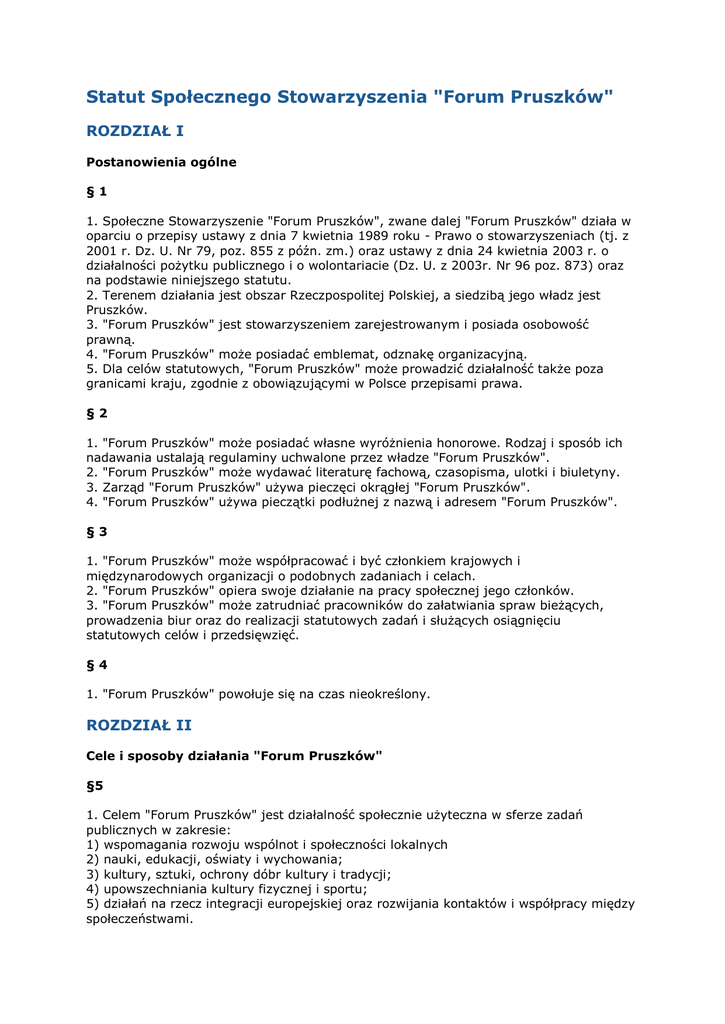 Statut Społecznego Stowarzyszenia "Forum Pruszków" ROZDZIAŁ I Postanowienia ogólne §1 1. Społeczne Stowarzyszenie "Forum Pruszków", zwane dalej "Forum Pruszków" działa w oparciu o przepisy ustawy z dnia 7 kwietnia 1989 roku - Prawo o stowarzyszeniach (tj. z 2001 r. Dz. U. Nr 79, poz. 855 z późn. zm.) oraz ustawy z dnia 24 kwietnia 2003 r. o działalności pożytku publicznego i o wolontariacie (Dz. U. z 2003r. Nr 96 poz. 873) oraz na podstawie niniejszego statutu. 2. Terenem działania jest obszar Rzeczpospolitej Polskiej, a siedzibą jego władz jest Pruszków. 3. "Forum Pruszków" jest stowarzyszeniem zarejestrowanym i posiada osobowość prawną. 4. "Forum Pruszków" może posiadać emblemat, odznakę organizacyjną. 5. Dla celów statutowych, "Forum Pruszków" może prowadzić działalność także poza granicami kraju, zgodnie z obowiązującymi w Polsce przepisami prawa. §2 1. "Forum Pruszków" może posiadać własne wyróżnienia honorowe. Rodzaj i sposób ich nadawania ustalają regulaminy uchwalone przez władze "Forum Pruszków". 2. "Forum Pruszków" może wydawać literaturę fachową, czasopisma, ulotki i biuletyny. 3. Zarząd "Forum Pruszków" używa pieczęci okrągłej "Forum Pruszków". 4. "Forum Pruszków" używa pieczątki podłużnej z nazwą i adresem "Forum Pruszków". §3 1. "Forum Pruszków" może współpracować i być członkiem krajowych i międzynarodowych organizacji o podobnych zadaniach i celach. 2. "Forum Pruszków" opiera swoje działanie na pracy społecznej jego członków. 3. "Forum Pruszków" może zatrudniać pracowników do załatwiania spraw bieżących, prowadzenia biur oraz do realizacji statutowych zadań i służących osiągnięciu statutowych celów i przedsięwzięć. §4 1. "Forum Pruszków" powołuje się na czas nieokreślony. ROZDZIAŁ II Cele i sposoby działania "Forum Pruszków" §5 1. Celem "Forum Pruszków" jest działalność społecznie użyteczna w sferze zadań publicznych w zakresie: 1) wspomagania rozwoju wspólnot i społeczności lokalnych 2) nauki, edukacji, oświaty i wychowania; 3) kultury, sztuki, ochrony dóbr kultury i tradycji; 4) upowszechniania kultury fizycznej i sportu; 5) działań na rzecz integracji europejskiej oraz rozwijania kontaktów i współpracy między społeczeństwami. 2. "Forum Pruszków" realizuje swoje cele poprzez: 1) opracowywanie oraz propagowanie kierunków rozwoju i form pracy "Forum Pruszków"; 2) prowadzenie działalności szkoleniowej; 3) organizowanie wystaw, prelekcji, konkursów, festiwali, przeglądów i zawodów o zasięgu gminnym, regionalnym, krajowym i międzynarodowym; 4) prowadzenie działalności wydawniczej; 5) prowadzenie wymiany doświadczeń oraz wymiany osobowej z zagranicą; 6) wspieranie inicjatyw i aktywności społecznej; 7) współpracę i współdziałanie w zakresie realizacji celów statutowych Stowarzyszenia, w szczególności popularyzacji kultury, sportu i ruchu społecznego w szerokim tego słowa znaczeniu, z organizacjami rządowymi i pozarządowymi, instytucjami i stowarzyszeniami krajowymi, zagranicznymi i międzynarodowymi; 3. "Forum Pruszków" dla zapewnienia środków finansowych na cele statutowe może korzystać z dotacji, darowizn i innych źródeł finansowania zgodnie z obowiązującymi przepisami. ROZDZIAŁ III Członkowie "Forum Pruszków" §6 1. Członkami "Forum Pruszków" mogą być osoby fizyczne i prawne. 2. Osoba prawna może być jedynie członkiem wspierającym "Forum Pruszków". 3. "Forum Pruszków" zrzesza: 1) członków zwyczajnych, 2) członków honorowych, 3) członków wspierających. 4. Członkiem zwyczajnym może być osoba fizyczna, posiadająca obywatelstwo polskie: 1) pełnoletnia, posiadająca pełną zdolność do czynności prawnych, 2) małoletnia, w wieku 16 - 18 lat, posiadająca ograniczoną zdolność do czynności prawnych, 3) małoletnia, poniżej 16 lat - za zgodą przedstawicieli ustawowych. 5. Przyjęcia członka zwyczajnego dokonuje Zarząd, po weryfikacji, na podstawie złożonej deklaracji pisemnej. 6. Członkiem honorowym może zostać osoba pełnoletnia, posiadająca wybitne zasługi dla rozwoju "Forum Pruszków" i jego celów. Godność członka honorowego nadaje Walne Zebranie Członków, na wniosek Zarządu. 7. Członkiem wspierającym może być osoba prawna lub osoba fizyczna, pragnący, swoją działalnością na rzecz "Forum Pruszków", wspierać jego działania. Przyjęcia na wniosek zainteresowanego dokonuje Zarząd. §7 1. Członek "Forum Pruszków" ma prawa: 1) członek zwyczajny i honorowy - wybierać i być wybieranym do wszystkich władz "Forum Pruszków", 2) małoletni poniżej 16 lat członek zwyczajny ma wszystkie prawa członka zwyczajnego, oprócz czynnego i biernego prawa wyborczego, 3) członek zwyczajny i wspierający - uczestniczenia w pracach "Forum Pruszków", szkoleniach i innych formach działania wynikających z realizacji celów statutowych, 4) członek zwyczajny, wspierający i honorowy - otrzymywania wyróżnień honorowych i innych świadczeń, 5) członek zwyczajny - zgłaszania opinii, wniosków i postulatów, a w zakresie spraw członkowskich zaskarżania uchwał organów "Forum Pruszków", 6) członek zwyczajny i honorowy - posiadania legitymacji członkowskiej oraz odznaki "Forum Pruszków" 7) członek zwyczajny, wspierający i honorowy - przynależności do innych stowarzyszeń krajowych, zagranicznych i międzynarodowych o podobnym profilu. 2. Członek zwyczajny zobowiązany jest do: 1) przestrzegania postanowień statutu "Forum Pruszków" i uchwał władz, 2) aktywnego uczestniczenia w pracach "Forum Pruszków", 3) etycznego i koleżeńskiego postępowania wobec innych członków, 4) terminowego opłacania składek członkowskich. 3. Członkostwo ustaje w przypadku: 1) wystąpienia pisemnego ze "Forum Pruszków" po uprzednim opłaceniu zaległych składek i zwrotu wypożyczonego składnika majątkowego "Forum Pruszków", 2) skreślenia przez Zarząd, w przypadk
