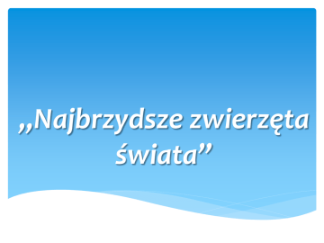 „Najbrzydsze zwierzęta świata” Wprowadzenie! „ Towarzystwo Ochrony Brzydkich Zwierząt” opracowało listę najbrzydszych zwierząt. Wybraliśmy 10. Naszym celem jest udowodnienie, że wyróżniają się niezwykłymi cechami, są pożyteczne i potrzebne. Spis treści! Woda: Blobfish- ryba – kleks. Mitsukurina. Latimeria. Ląd: Kot Sfinks Żaba Purpurowa Palczak Madagaskarski Nosacz Spis treści! Powietrze: Kondor Kalifornijski Pod Ziemią: Golec Gwiazdonos Blobfish-ryba – kleks. Ciekawostki o zwierzęciu! Blobfish żyje w głębokich wodach u wybrzeży południowej Australii i Tasmanii Ryby te żyją na głębokościach od 600 do 1200m Dorosłe osobniki dorastają do 30 cm długości Blobfish jest najbrzydszym i najsmutniejszym zwierzęciem na świecie Cechy charakterystyczne! Opływowe ciało do pokonania oporu wody Głowa łączy się z tułowiem nieruchomo , nie występuje odcinek szyjny Otwór gębowy zaopatrzony w ruchome szczęki Płetwy brzuszne Skóra nie jest pokryta łuskami lecz licznymi gruczołami śluzowymi U tej ryby występuje pęcherz pławny Mitsukurina! Występowanie! Mitsukurina owstoni występuje w głębinach morskich, poniżej głębokości 200 m. Zasięg występowania obejmuje Pacyfik od Australii po Zatokę Meksykańską Oceanu Atlantyckiego, jednak najlepiej znany jest z rejonu Japonii, gdzie został odkryty dla nauki w 1898 roku. Cechy charakterystyczne! Mitsukurina owstoni – gatunek głębinowego rekina. Charakterystyczną cechą tego gatunku jest nietypowy kształt głowy, z długim, przypominającym kielnię dziobem (rostrum). Ponadto, mitsukurina wyróżnia się różowym kolorem całego ciała i wysuwalnymi szczękami. Latimeria! Występowanie! Latimerie przebywają na głębokościach 150–700 m, nad skalistym dnem i w jaskiniach pochodzenia wulkanicznego. Cechy charakterystyczne! Charakterystyczne cechy latimerii to płetwy umieszczone w ruchomych mięsistych trzonach, o szkielecie zbliżonym budową do pięciopalczastej kończyny, skostniały pęcherz pławny, obecność struny grzbietowej z zaczątkami kręgów o chrzęstnej budowie, ruchome połączenie głowy z tułowiem umożliwiające jej unoszenie w trakcie żerowania. Ciało latimerii pokrywają duże, okrągłe łuski o ciemnym stalowoniebieskim ubarwieniu, niekiedy białym, tworzącym cętkowanie po bokach ciała. Kot Sfinks! Występowanie! wygląda na bezwłosego, w dotyku gorący i delikatny ma bardzo krótkie owłosienie na nosie, uszach i ogonie uszy duże, odstające oczy (kształtu cytryny) skośne do góry w kierunku uszu głowa smukła, dłuższa niż szersza nos i kości policzkowe mocno zarysowane dobrze zbudowane ciało, średniej budowy, z szerszą klatką piersiową sfinks ma długie łapy i ogon w porównaniu do innych ras Cechy charakterystyczne! Sfinks (kanadyjski bezwłosy) – rasa kota. Przeważnie sfinksy występują w Ameryce i Europie pochodzą od kanadyjskiego kota domowego, któremu w 1962 w wyniku samoistnej mutacji urodziły się dwa łyse młode. Żaba purpurowa! Występowanie! Żaba purpurowa – gatunek płaza. Występuje w Ghatach Zachodnich w południowych Indiach. Najczęściej używane nazwy dla tego gatunku to żaba purpurowa lub żaba świnionosa. Odkryta została we wrześniu 2003 roku. Cechy charakterystyczne! Żaba purpurowa ma wygląd typowej żaby. Ma przysadziste ciało, nieco bardziej bułczaste w porównaniu do innych żab o spłaszczonym ciele. Jego ramiona i nogi rozszerzają się na zewnątrz, ich kształt ciała jest podobny, jak u innych żab. Ma małą głowę i raczej dziwny, spiczasty ryj. Osobniki dorosłe są zazwyczaj ciemno-fioletowe. Okaz, na podstawie którego gatunek początkowo został opisany był długi na siedem centymetrów – od czubka pyska po czubki palców. Palczak Madagaskarski! Występowanie! Występuje tylko na wschodnim i północno-zachodnim wybrzeżu Madagaskaru. Życie spędza na drzewach w lasach deszczowych. Palczak Madagaskarski ma ciało wielkości kota, z dużą głową i krótkim pyskiem, duże uszy, chwytne palce u rąk i nóg. Ubarwienie czarno-brązowe, na twarzy i okolicach piersi jaśniejsze. Oczy zielono-żółte, duże uszy, futro puszyste z miękkim włosem. Duży, puszysty ogon. Tubylcy wierzą, że skierowanie przez palczaka najdłuższego palca w kierunku człowieka zwiastuje szybką i nagłą śmierć tej osoby. Cechy charakterystyczne! Jego charakterystyczną cechą jest to, że posiada cienki, długi palec środkowy, zakończony hakowatym pazurem. Palec ten służy mu do opukiwania pni drzew głównie bambusa, a następnie wyciągania owadów i ich larw przez szczeliny, które wygryza swoimi długimi siekaczami. Obecnie jest uważany za gatunek dość szeroko rozprzestrzeniony, ale nadal narażony na wyginięcie. Żywi się owadami, kokosami, owocami, bambusem oraz trzciną cukrową. Nosacz! Występowanie! Żyje na Borneo w przybrzeżnych lasach namorzynowych i w lasach deszczowych wzdłuż rzek. Nosacze sundajskie prowadzą dzienny, głównie nadrzewny tryb życia. Największą aktywność wykazują od późnego popołudnia do zmroku. Żywią się liśćmi, owocami i nasionami. Zjadają również drobne bezkręgowce. Cechy charakterystyczne! Samiec ma wydatny, rozszerzony na końcu nos w kształcie ogórka, u starych samców nos wydłuża się do 10 cm i zwisa. Nos samicy jest mniejszy i zadarty ku górze. Ubarwienie grzbietu i ramion od różowego, czerwonego do brązowego. Kończyny i ogon są szare. Kondor Kalifornijski! Występowanie! Kondor kalifornijski– gatunek dużego ptaka padlinożernego z rodziny kondorowatych. Zamieszkuje góry północnej Kalifornii, a niegdyś całe Góry Skaliste. Cechy charakterystyczne! Długość ciała 60-140 cm Rozpiętość skrzydeł do 340 cm Upierzenie – ciemne [ poza kondorem królewskim] Żywi się padliną dużych ssaków Głowa nie posiada upierzenia, często ma różnorodne wytwory skórne Kondory składają od 1 do 3 jaj Wysiadywanie 