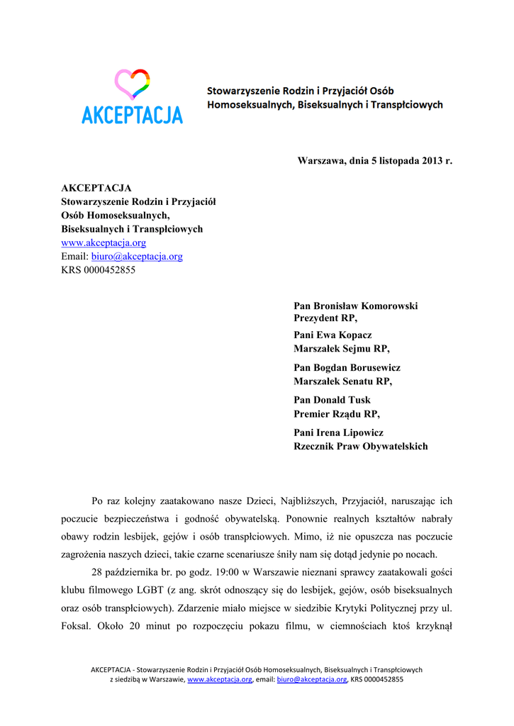 Warszawa, dnia 5 listopada 2013 r. AKCEPTACJA Stowarzyszenie Rodzin i Przyjaciół Osób Homoseksualnych, Biseksualnych i Transpłciowych www.akceptacja.org Email: [email protected] KRS 0000452855 Pan Bronisław Komorowski Prezydent RP, Pani Ewa Kopacz Marszałek Sejmu RP, Pan Bogdan Borusewicz Marszałek Senatu RP, Pan Donald Tusk Premier Rządu RP, Pani Irena Lipowicz Rzecznik Praw Obywatelskich Po raz kolejny zaatakowano nasze Dzieci, Najbliższych, Przyjaciół, naruszając ich poczucie bezpieczeństwa i godność obywatelską. Ponownie realnych kształtów nabrały obawy rodzin lesbijek, gejów i osób transpłciowych. Mimo, iż nie opuszcza nas poczucie zagrożenia naszych dzieci, takie czarne scenariusze śniły nam się dotąd jedynie po nocach. 28 października br. po godz. 19:00 w Warszawie nieznani sprawcy zaatakowali gości klubu filmowego LGBT (z ang. skrót odnoszący się do lesbijek, gejów, osób biseksualnych oraz osób transpłciowych). Zdarzenie miało miejsce w siedzibie Krytyki Politycznej przy ul. Foksal. Około 20 minut po rozpoczęciu pokazu filmu, w ciemnościach ktoś krzyknął AKCEPTACJA - Stowarzyszenie Rodzin i Przyjaciół Osób Homoseksualnych, Biseksualnych i Transpłciowych z siedzibą w Warszawie, www.akceptacja.org, email: [email protected], KRS 0000452855 „bomba!”, nastąpił błysk, huk i salę zaczął wypełniać gryzący dym. Na sali znajdowało się około 60 osób. Wybuchła panika. To cud, że nikomu nic się nie stało, ale pozostały nerwy, strach, rozgoryczenie. Dwa dni później Kampania Przeciw Homofobii (KPH) otrzymała wiadomość, że w jej biurze, w którym przebywało wiele osób, podłożono bombę. Policja przeszukała pomieszczenia biura KPH, na szczęście nic nie znaleziono. Ale znów poczucie bezpieczeństwa osób nieheteroseksualnych zostało naruszone. Przytoczone wyżej zdarzenia wpisują się w ciąg wielu incydentów motywowanych nienawiścią do osób LGBT, które miały miejsce w ostatnim czasie. Zarówno my, rodzice, jak i nasze nieheteroseksualne dzieci jesteśmy pełnoprawnymi obywatelami Rzeczypospolitej Polskiej, sumiennie wywiązujemy się z naszych obywatelskich powinności. Zatem oczekujemy, że państwo polskie będzie chroniło wszystkich obywateli, w tym również osoby LGBT. Zwracamy uwagę na brak w Kodeksie karnym odpowiednich przepisów, które uwzględniałyby motywację homofobiczną jako równoważną innym motywacjom na tle uprzedzeń, jak np. rasizmowi czy antysemityzmowi. I to mimo, iż nienawiść wobec osób homoseksualnych jest w Polsce zjawiskiem powszechnym. Dlatego też domagamy się dostosowania prawa do istniejącej rzeczywistości społecznej i zapewnienia osobom homoseksualnym i transpłciowym równej ochrony w przypadku przestępstw popełnionych z nienawiści. My, członkowie Stowarzyszenia AKCEPTACJA, w imieniu rodziców, bliskich i przyjaciół osób homoseksualnych, biseksualnych i transpłciowach protestujemy przeciwko aktom nienawiści skierowanym przeciwko społeczności LGBT oraz stanowczo domagamy się od władz państwowych podjęcia niezwłocznych kroków zapobiegających rozlewaniu się po kraju fali przemocy wynikającej z nienawiści wobec mniejszości seksualnych. Ze swojej strony deklarujemy gotowość dialogu i współpracy w wypracowaniu skutecznych metod walki z homofobią i transfobią. Z wyrazami szacunku, Elżbieta Szczęsna Prezeska Stowarzyszenia AKCEPTACJA AKCEPTACJA - Stowarzyszenie Rodzin i Przyjaciół Osób Homoseksualnych, Biseksualnych i Transpłciowych z siedzibą w Warszawie, www.akceptacja.org, email: [email protected], KRS 0000452855