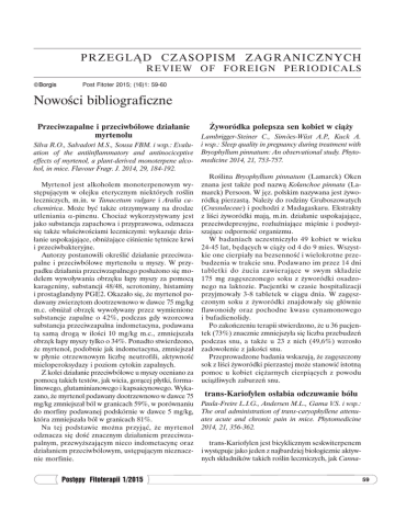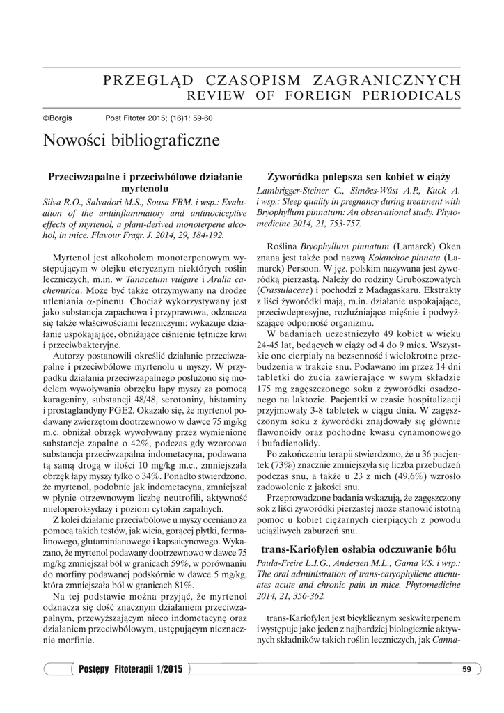 p rzegląd cz a so p i sm z a g r a n i c z n y c h r e v i e w o f fo re ig n pe rio dic als Borgis Post Fitoter 2015; (16)1: 59-60 Nowości bibliograficzne Przeciwzapalne i przeciwbólowe działanie myrtenolu Silva R.O., Salvadori M.S., Sousa FBM. i wsp.: Evaluation of the antiinflammatory and antinociceptive effects of myrtenol, a plant-derived monoterpene alcohol, in mice. Flavour Fragr. J. 2014, 29, 184-192. Myrtenol jest alkoholem monoterpenowym występującym w olejku eterycznym niektórych roślin leczniczych, m.in. w Tanacetum vulgare i Aralia cachemirica. Może być także otrzymywany na drodze utleniania α-pinenu. Chociaż wykorzystywany jest jako substancja zapachowa i przyprawowa, odznacza się także właściwościami leczniczymi: wykazuje działanie uspokajające, obniżające ciśnienie tętnicze krwi i przeciwbakteryjne. Autorzy postanowili określić działanie przeciwzapalne i przeciwbólowe myrtenolu u myszy. W przypadku działania przeciwzapalnego posłużono się modelem wywoływania obrzęku łapy myszy za pomocą karageniny, substancji 48/48, serotoniny, histaminy i prostaglandyny PGE2. Okazało się, że myrtenol podawany zwierzętom dootrzewnowo w dawce 75 mg/kg m.c. obniżał obrzęk wywoływany przez wymienione substancje zapalne o 42%, podczas gdy wzorcowa substancja przeciwzapalna indometacyna, podawana tą samą drogą w ilości 10 mg/kg m.c., zmniejszała obrzęk łapy myszy tylko o 34%. Ponadto stwierdzono, że myrtenol, podobnie jak indometacyna, zmniejszał w płynie otrzewnowym liczbę neutrofili, aktywność mieloperoksydazy i poziom cytokin zapalnych. Z kolei działanie przeciwbólowe u myszy oceniano za pomocą takich testów, jak wicia, gorącej płytki, formalinowego, glutaminianowego i kapsaicynowego. Wykazano, że myrtenol podawany dootrzewnowo w dawce 75 mg/kg zmniejszał ból w granicach 59%, w porównaniu do morfiny podawanej podskórnie w dawce 5 mg/kg, która zmniejszała ból w granicach 81%. Na tej podstawie można przyjąć, że myrtenol odznacza się dość znacznym działaniem przeciwzapalnym, przewyższającym nieco indometacynę oraz działaniem przeciwbólowym, ustępującym nieznacznie morfinie. Postępy Fitoterapii 1/2015 Żyworódka polepsza sen kobiet w ciąży Lambrigger-Steiner C., Simões-Wűst A.P., Kuck A. i wsp.: Sleep quality in pregnancy during treatment with Bryophyllum pinnatum: An observational study. Phytomedicine 2014, 21, 753-757. Roślina Bryophyllum pinnatum (Lamarck) Oken znana jest także pod nazwą Kolanchoe pinnata (Lamarck) Persoon. W jęz. polskim nazywana jest żyworódką pierzastą. Należy do rodziny Gruboszowatych (Crassulaceae) i pochodzi z Madagaskaru. Ekstrakty z liści żyworódki mają, m.in. działanie uspokajające, przeciwdepresyjne, rozluźniające mięśnie i podwyższające odporność organizmu. W badaniach uczestniczyło 49 kobiet w wieku 24-45 lat, będących w ciąży od 4 do 9 mies. Wszystkie one cierpiały na bezsenność i wielokrotne przebudzenia w trakcie snu. Podawano im przez 14 dni tabletki do żucia zawierające w swym składzie 175 mg zagęszczonego soku z żyworódki osadzonego na laktozie. Pacjentki w czasie hospitalizacji przyjmowały 3-8 tabletek w ciągu dnia. W zagęszczonym soku z żyworódki znajdowały się głównie flawonoidy oraz pochodne kwasu cynamonowego i bufadienolidy. Po zakończeniu terapii stwierdzono, że u 36 pacjentek (73%) znacznie zmniejszyła się liczba przebudzeń podczas snu, a także u 23 z nich (49,6%) wzrosło zadowolenie z jakości snu. Przeprowadzone badania wskazują, że zagęszczony sok z liści żyworódki pierzastej może stanowić istotną pomoc u kobiet ciężarnych cierpiących z powodu uciążliwych zaburzeń snu. trans-Kariofylen osłabia odczuwanie bólu Paula-Freire L.I.G., Andersen M.L., Gama V.S. i wsp.: The oral administration of trans-caryophyllene attenuates acute and chronic pain in mice. Phytomedicine 2014, 21, 356-362. trans-Kariofylen jest bicyklicznym seskwiterpenem i występuje jako jeden z najbardziej biologicznie aktywnych składników takich roślin leczniczych, jak Canna59 Bogdan Kędzia bis sativa, Ocimum gratissimum i Cordia verbanaceae. Wchodzi w skład wielu mieszanek przyprawowych, produktów spożywczych oraz mydeł i detergentów. Dotychczasowe badania wykazały, że trans-kariofylen odznacza się działaniem przeciwutleniającym, przeciwbakteryjnym, ochraniającym układ pokarmowy, przeciwlękowym, przeciwzapalnym i miejscowo znieczulającym. Badania prowadzono na myszach. W celu wykazania działania przeciwbólowego przy bólu ostrym wykorzystano test gorącej płytki, natomiast przy bólu przewlekłym test formalinowy. trans-Kariofylen podawano myszom drogą doustną w oleju kukurydzianym w dawce 10 mg/kg m.c., natomiast standardowy lek przeciwbólowy, jakim była morfi- na, podawano zwierzętom dootrzewnowo w dawce 5 mg/kg m.c. Stwierdzono, że w teście gorącej płytki myszy reagowały na ból po 17 s, po podaniu morfiny po 29 s, a po podaniu trans-kariofylenu po 27 s. W przypadku testu formalinowego ból ustępował u myszy kontrolnych po 245 s, po podaniu morfiny po 8 s, a po podaniu trans-kariofylenu po 75 s. Przedstawione powyżej wyniki wskazują, że trans-kariofylen podany doustnie przy bólu ostrym działa podobnie jak morfina, natomiast przy bólu przewlekłym działa tylko nieco słabiej od morfiny. Stwarza to możliwość wykorzystania tej substancji do celów medycznych w sytuacjach, kiedy podawanie morfiny chorym jest niemożliwe. Wybór i opracowanie Prof. dr hab. Bogdan Kędzia 60 Postępy Fitoterapii 1/2015