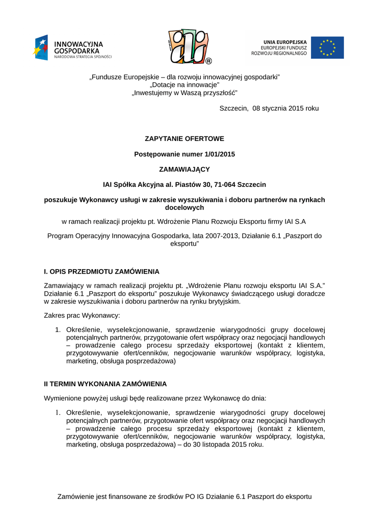 „Fundusze Europejskie – dla rozwoju innowacyjnej gospodarki” „Dotacje na innowacje” „Inwestujemy w Waszą przyszłość” Szczecin, 08 stycznia 2015 roku ZAPYTANIE OFERTOWE Postępowanie numer 1/01/2015 ZAMAWIAJĄCY IAI Spółka Akcyjna al. Piastów 30, 71-064 Szczecin poszukuje Wykonawcy usługi w zakresie wyszukiwania i doboru partnerów na rynkach docelowych w ramach realizacji projektu pt. Wdrożenie Planu Rozwoju Eksportu firmy IAI S.A Program Operacyjny Innowacyjna Gospodarka, lata 2007-2013, Działanie 6.1 „Paszport do eksportu” I. OPIS PRZEDMIOTU ZAMÓWIENIA Zamawiający w ramach realizacji projektu pt. „Wdrożenie Planu rozwoju eksportu IAI S.A.” Działanie 6.1 „Paszport do eksportu” poszukuje Wykonawcy świadczącego usługi doradcze w zakresie wyszukiwania i doboru partnerów na rynku brytyjskim. Zakres prac Wykonawcy: 1. Określenie, wyselekcjonowanie, sprawdzenie wiarygodności grupy docelowej potencjalnych partnerów, przygotowanie ofert współpracy oraz negocjacji handlowych – prowadzenie całego procesu sprzedaży eksportowej (kontakt z klientem, przygotowywanie ofert/cenników, negocjowanie warunków współpracy, logistyka, marketing, obsługa posprzedażowa) II TERMIN WYKONANIA ZAMÓWIENIA Wymienione powyżej usługi będę realizowane przez Wykonawcę do dnia: 1. Określenie, wyselekcjonowanie, sprawdzenie wiarygodności grupy docelowej potencjalnych partnerów, przygotowanie ofert współpracy oraz negocjacji handlowych – prowadzenie całego procesu sprzedaży eksportowej (kontakt z klientem, przygotowywanie ofert/cenników, negocjowanie warunków współpracy, logistyka, marketing, obsługa posprzedażowa) – do 30 listopada 2015 roku. Zamówienie jest finansowane ze środków PO IG Działanie 6.1 Paszport do eksportu „Fundusze Europejskie – dla rozwoju innowacyjnej gospodarki” „Dotacje na innowacje” „Inwestujemy w Waszą przyszłość” III WARUNKI UDZIAŁU W POSTĘPOWANIU 1. Wykonawcy ubiegający się o zamówienie muszą posiadać niezbędną wiedzę i doświadczenie oraz dysponować potencjałem technicznym i osobami zdolnymi do wykonania zamówienia, w szczególności muszą albo sami spełniać poniższe warunki (w przypadku osoby fizycznej składającej ofertę samodzielnie) albo wskazać do realizacji zamówienia osoby którymi dysponują i które spełniają poniższe warunki: - posiadanie wiedzy i możliwości do realizacji przedmiotu zapytania ofertowego - doświadczenie oraz dysponowanie potencjałem technicznym oraz osobami zdolnymi do realizacji przedmiotu zapytania - bycie dostawcą usług o podobnym zakresie - wskazanie doświadczenia, w tym przede wszystkim znajomości i specyfiki działania usługi oferowanej przez Zleceniodawcę oraz doświadczenie w sprzedaży usług e-commerce 2. Wykonawca nie może być powiązany osobowo lub kapitałowo z Zamawiającym. Przez powiązania osobowe lub kapitałowe rozumie się wzajemne powiązania pomiędzy Zamawiającym lub osobami upoważnionymi do zaciągania zobowiązań w imieniu Zamawiającego lub osobami wykonującymi w imieniu Zamawiającego czynności związane z przygotowaniem i przeprowadzeniem procedury wyboru Wykonawcy a Wykonawcą, polegające w szczególności na: a) uczestniczeniu w spółce jako wspólnik spółki cywilnej lub spółki osobowej; b) posiadaniu co najmniej 5% udziałów lub akcji; c) pełnieniu funkcji członka organu nadzorczego lub zarządzającego, prokurenta, pełnomocnika; d) pozostawaniu w związku małżeńskim, w stosunku pokrewieństwa lub powinowactwa w linii prostej (rodzice, dzieci, wnuki, teściowie, zięć, synowa), w stosunku pokrewieństwa lub powinowactwa w linii bocznej do drugiego stopnia (rodzeństwo, krewni małżonka/i) lub pozostawania w stosunku przysposobienia, opieki lub kurateli. W sytuacji wystąpienia powiązania Wykonawca będzie podlegał odrzuceniu z postępowania. 3. Ocena spełniania przedstawionych powyżej warunków zostanie dokonana wg formuły: „spełnia – nie spełnia”. Wykonawca, który nie spełni któregokolwiek z warunków zostanie odrzucony w postępowaniu. 4. Zamawiający zastrzega sobie możliwość unieważnienia postępowania bez podania przyczyny. Zamówienie jest finansowane ze środków PO IG Działanie 6.1 Paszport do eksportu „Fundusze Europejskie – dla rozwoju innowacyjnej gospodarki” „Dotacje na innowacje” „Inwestujemy w Waszą przyszłość” 5. Zamawiający zastrzega sobie możliwość zmiany lub uzupełnienia treści Zapytania Ofertowego przed upływem terminu na składanie ofert. Informacja o wprowadzeniu zmiany lub uzupełnieniu treści Zapytania Ofertowego zostanie przekazana Wykonawcom niezwłocznie w formie pisemnej (e-mail,), jak również zostanie opublikowana na stronie internatowej Zamawiającego. Jeżeli wprowadzone zmiany lub uzupełnienia treści Zapytania Ofertowego będą wymagały zmiany treści ofert, Zamawiający przedłuży termin składania ofert o czas potrzebny na dokonanie zmian w ofercie. 6. Zamawiający zawrze umowę z Wykonawcą, którego oferta zostanie uznana za ofertę najkorzystniejszą oraz który spełni wymogi określone w Zapytaniu Ofertowym. O terminie zawarcia umowy Zamawiający powiadomi Wykonawcę drogą e-mailową wraz z informacją o wynikach postępowania. 7. Wykonawca zostanie odrzucony z niniejszego postępowania: 1. w przypadku niespełniania warunków udziału w postępowaniu; 2. w przypadku niezgodności oferty z niniejszym zapytaniem; 3. w przypadku przedstawienie przez Wykonawcę informacji nieprawdziwych. IV. OPIS SPOSOBU PRZYGOTOWANIA OFERTY 1. Wymagania podstawowe 1) Każdy Wykonawca może złożyć tylko jedną ofertę. 2) Oferta oraz wszelkie załączniki muszą być podpisane przez osoby upoważnione do reprezentowania Wykonawcy. 3) Upoważnienie osób podpisujących ofertę do jej podpisania musi bezpośrednio wynikać z dokumentów dołączonych do oferty. Oznacza to, że jeżeli upoważnienie takie nie wynik