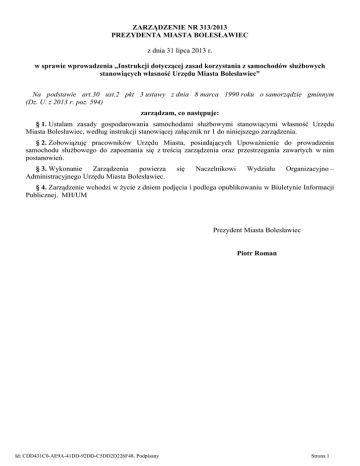 ZARZĄDZENIE NR 313/2013 PREZYDENTA MIASTA BOLESŁAWIEC z dnia 31 lipca 2013 r. w sprawie wprowadzenia „Instrukcji dotyczącej zasad korzystania z samochodów służbowych stanowiących własność Urzędu Miasta Bolesławiec” Na podstawie art.30 ust.2 pkt 3 ustawy z dnia 8 marca 1990 roku o samorządzie gminnym (Dz. U. z 2013 r. poz. 594) zarządzam, co następuje: § 1. Ustalam zasady gospodarowania samochodami służbowymi stanowiącymi własność Urzędu Miasta Bolesławiec, według instrukcji stanowiącej załącznik nr 1 do niniejszego zarządzenia. § 2. Zobowiązuję pracowników Urzędu Miasta, posiadających Upoważnienie do prowadzenia samochodu służbowego do zapoznania się z treścią zarządzenia oraz przestrzegania zawartych w nim postanowień. § 3. Wykonanie Zarządzenia powierza Administracyjnego Urzędu Miasta Bolesławiec. się Naczelnikowi Wydziału Organizacyjno – § 4. Zarządzenie wchodzi w życie z dniem podjęcia i podlega opublikowaniu w Biuletynie Informacji Publicznej. MH/UM Prezydent Miasta Bolesławiec Piotr Roman Id: CDD431C0-AE9A-41DD-92DD-C5DD2D226F48. Podpisany Strona 1 Załącznik Nr 1 do Zarządzenia Nr 313/2013 Prezydenta Miasta Bolesławiec z dnia 31 lipca 2013 r. Instrukcja dotycząca zasad korzystania z samochodów służbowych stanowiących własność Urzędu Miasta Bolesławiec Rozdział I Zasady korzystania z samochodów służbowych przez pracowników Urzędu Miasta Bolesławiec 1. Samochody służbowe używane są przez pracowników Urzędu Miasta Bolesławiec wyłącznie w celach służbowych. 2. Kierować samochodem służbowym mogą tylko pracownicy posiadający Upoważnienie do prowadzenia samochodu służbowego, stanowiące załącznik nr 1 do niniejszej instrukcji, wydane przez Prezydenta Miasta lub z jego upoważnienia przez Sekretarza Miasta, oraz ważne zaświadczenie lekarskie wydane przez lekarza medycyny pracy, uprawnionego do badań osób kierujących pojazdami, stwierdzające brak przeciwwskazań do kierowania samochodem. 3. Rejestr w/w upoważnień jest prowadzony na stanowisku ds. osobowych. 4. Pracownicy korzystający z samochodów zobligowani są do kierowania się zasadą racjonalności i oszczędności. 5. W przypadku potrzeby skorzystania z samochodu służbowego upoważnieni pracownicy rezerwują go za pośrednictwem systemu el-Dok. 6. Tankowanie samochodów służbowych odbywa się na stacji paliw, z którą Urząd Miasta Bolesławiec ma podpisaną umowę. 7. Przed wyjazdem służbowym poza Bolesławiec należy sprawdzić poziom paliwa, aby uniknąć konieczności tankowania na stacji, z którą Urząd Miasta nie ma podpisanej umowy. 8. W szczególnych przypadkach, gdy odległość do miejsca będącego celem wyjazdu służbowego determinuje konieczność uzupełnienia paliwa w trakcie podróży, dopuszcza się tankowanie na innych stacjach. 9. Po zatankowaniu samochodu służbowego należy przedłożyć kartę drogową pracownikowi stacji paliw, w celu potwierdzenia przez niego ilości zatankowanego paliwa 10. Po zakończeniu pracy samochody służbowe powinny być przechowywane w garażach Rozdział II Zakres obowiązków i odpowiedzialności pracowników uprawnionych do kierowania samochodami służbowymi Urzędu Miasta Bolesławiec 1. W przypadku powierzenia samochodu służbowego komórce organizacayjnej, osobą odpowiedzialną za eksploatację samochodu jest kierownik komórki organizaacyjnej. 2. Pracownik korzystający z samochodu służbowego zobowiązany jest do: 1) korzystania z samochodu służbowego zgodnie z jego przeznaczeniem, 2) wypełniania zaleceń producenta zawartych w instrukcji obsługi w zakresie utrzymania sprawności technicznej, bezpieczeńtwa oraz obowiązkowego wyposażenia, 3) dbałości o estetykę i czystość powierzonego samochodu, Id: CDD431C0-AE9A-41DD-92DD-C5DD2D226F48. Podpisany Strona 1 4) zgłaszania Naczelnikowi Wydziału Organizacyjno - Administracyjnego stwierdzonych usterek oraz potrzeb dokonania remontu lub naprawy, 5) odnotowania w karcie drogowej każdorazowego korzystania z samochodu służbowego z uwzględnieniem daty wyjazdu, punktu docelowego, stanu początkowego, stanu końcowego i ilości przejechanych kilometrów, 6) postępowania zgodnie z przepisami ruchu drogowego, 7) postępowania zgodnie z zaleceniami ubezpieczyciela samochodu w przypadku kolizji, wypadku lub innego zdarzenia powodującgo uszkodzenie samochodu; 3. Pracownicy, którzy zostali upoważnieni przez Prezydenta Miasta do kierowania samochodami służbowymi, przejmują pełną odpowiedzialność materialną za powierzony pojazd wraz z wyposażeniem, na czas jego używania. Pracownicy Ci podpisują Deklarację odpowiedzialności materialnej stanowiącą załącznik nr 2 do niniejszej instrukcji, którą dołącza się do akt osobowych. 4. W każdym samochodzie służbowym znajduje się indywidualny „Wykaz wyposażenia ruchomego”. Pracownik korzystający z samochodu służbowego jest zobowiązany każdorazowo sprawdzić kompletność wyposażenia. W przypadku stwierdzenia różnic, należy zgłosić ten fakt Naczelnikowi Wydziału Organizacyjno – Administracyjnemu. 5. Wyznaczony pracownik Wydziału Organizacyjno-Administracyjnego prowadzi rejestr i dba o terminowość przeprowadzania obowiązkowych okresowych przeglądów technicznych. Prezydent Miasta Bolesławiec Piotr Roman Id: CDD431C0-AE9A-41DD-92DD-C5DD2D226F48. Podpisany Strona 2 Załącznik nr 1 do Instrukcji korzystania z samochodów służbowych stanowiących własność Urzędu Miasta Bolesławiec Bolesławiec, dnia ………………. UPOWAŻNIENIE Upoważnia się Pana/Panią …………………………………, zatrudnion-ego/-ą w Urzędzie Miasta Bolesławiec na stanowisku ……………………………………… ………………..legitymując-ego/-ą się dowodem osobistym serii …… nr …………., do prowadzenia niżej wymienion-ego/-ych samochod-u/-ów służbow-ego/-ych: 1) …………………….. nr re
