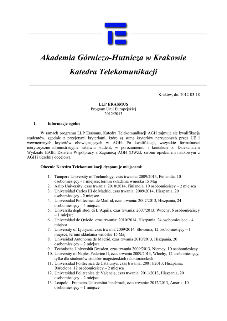 Akademia Górniczo-Hutnicza w Krakowie Katedra Telekomunikacji Kraków, dn. 2012-03-18 LLP ERASMUS Program Unii Europejskiej 2012/2013 I. Informacje ogólne W ramach programu LLP Erasmus, Katedra Telekomunikacji AGH zajmuje się kwalifikacją studentów, zgodnie z przyjętymi kryteriami, które są sumą kryteriów narzuconych przez UE i wewnętrznych kryteriów obowiązujących w AGH. Po kwalifikacji, wszystkie formalności merytoryczno-administracyjne załatwia student, w porozumieniu i kontakcie z: Dziekanatem Wydziału EAIE, Działem Współpracy z Zagranicą AGH (DWZ), swoim opiekunem naukowym z AGH i uczelnią docelową. Obecnie Katedra Telekomunikacji dysponuje miejscami: 1. Tampere University of Technology, czas trwania: 2009/2013, Finlandia, 10 osobomiesięcy - 1 miejsce, termin składania wniosku 15 Maj 2. Aalto University, czas trwania: 2010/2014, Finlandia, 10 osobomiesięcy – 2 miejsca 3. Universidad Carlos III de Madrid, czas trwania: 2009/2014, Hiszpania, 20 osobomiesięcy - 2 miejsce 4. Universidad Politecnica de Madrid, czas trwania: 2007/2013, Hiszpania, 24 osobomiesięcy – 4 miejsca 5. Universita degli studi di L’Aquila, czas trwania: 2007/2013, Włochy, 6 osobomiesięcy – 1 miejsce 6. Universidad de Oviedo, czas trwania: 2010/2014, Hiszpania, 24 osobomiesiące – 4 miejsca 7. University of Ljubjana, czas trwania 2009/2014, Słowenia, 12 osobomiesięcy – 1 miejsce, termin składania wniosku 15 Maj 8. Univrsidad Autonoma de Madrid, czas trwania 2010/2013, Hiszpania, 20 osobomiesięcy – 2 miejsca 9. Technische Universität Dresden, czas trwania 2009/2013, Niemcy, 10 osobomiesięcy 10. University of Naples Federico II, czas trwania 2009/2013, Włochy, 12 osobomiesięcy, tylko dla studentów studiów magisterskich i doktoranckich 11. Universidad Politecnica de Catalunya, czas trwania: 20011/2013, Hiszpania, Barcelona, 12 osobomiesięcy – 2 miejsca 12. Universidad Politecnica de Valencia, czas trwania: 2011/2013, Hiszpania, 20 osobomiesięcy – 2 miejsca 13. Leopold - Franzens-Universitat Innsbruck, czas trwania: 2012/2013, Austria, 10 osobomiesięcy – 1 miejsce 14. Technische Universitat Berlin, czas trwania: 2011/2013, Niemcy, 12 osobomiesięcy – 2 miejsca II. Formalne kryteria pozwalające uzyskać status studenta programu LLP Erasmus (opracowano na podstawie informacji na stronie WWW DWZ AGH: www.dwz.agh.edu.pl ) 1. Pomyślne zaliczenie co najmniej pierwszego roku studiów; zdecydowanie preferowani są jednak studenci lat dyplomowych, doktoranci oraz studenci indywidualni. 2. Średnia ocen ze wszystkich lat co najmniej 3,80. 3. Znajomość języka obcego w stopniu umożliwiającym czynne uczestniczenie w procesie studiowania na uczelni wyższej; musi być to język narodowy kraju uczelni przyjmującej lub język w którym prowadzone są tam zajęcia. Szczegółowa hierarchia wymagań podana jest na stronie WWW DWZ AGH. 4. Ustalony z opiekunem naukowym w AGH i/lub w uczelni przyjmującej program studiów, zapewniający studentowi zaliczenie w AGH bez opóźnień okresu studiów zagranicznych. 5. Okres pobytu studenta nie powinien wykraczać poza termin przewidywanej obrony pracy dyplomowej. III. Szczegółowe zasady kwalifikacji studentów do programu LLP Erasmus w Katedrze Telekomunikacji AGH 1. Preferowani są studenci najstarszych lat studiów o specjalności Telekomunikacja 2. Udokumentowana znajomość języka wymaganego przez stronę przyjmującą. Hierarchia ważności dokumentów potwierdzających znajomość języka podana jest przez DWZ AGH (strona WWW DWZ). 3. Średnia ocen ze wszystkich lat co najmniej 3,80. 4. Specjalność zgodna ze specjalnością życzoną przez stronę przyjmującą. 5. Wypełniona ANKIETA INFORMACYJNA KANDYDATA (dla celów rekrutacji) wraz z załącznikami – formatka na stronie WWW DWZ. (PROSZĘ uważnie PRZECZYTAĆ „uwagi końcowe” pkt. 2) 6. Rozmowa kwalifikacyjna w Katedrze Telekomunikacji IV. Uwagi organizacyjne Wszelkie informacje o programie LLP Erasmus, a w szczególności zasady organizacji wyjazdu umieszczone są na stronie WWW Działu Współpracy z Zagranicą AGH (stronę tę polecamy szczególnie!): www.dwz.agh.edu.pl oraz na stronie WWW Katedry Telekomunikacji, a informacje ogólne na stronie www.erasmus.org.pl (dawniej: www.socrates.org.pl/erasmus). Katedra Telekomunikacji oddaje do Dziekanatu proponowaną listę studentów. Dziekan i strona przyjmująca mają decydujące zdanie w akceptacji kandydata. Na miesiąc przed wyjazdem student wypełnia „Learning Agreement”, gdzie istotny jest program studiów utworzony wraz z opiekunem naukowym studenta. Przy tworzeniu programu studiów należy wziąć pod uwagę przedmioty wykładane na uczelni docelowej, tak aby były zgodne (na ile to możliwe) z przedmiotami obowiązującymi studenta w AGH i tematem jego pracy. Wyjazd traktowany jest m.in. jako zbieranie materiałów do pracy (zajęć) studenta, która została zdefiniowana na uczelni macierzystej. Okres studiów zagranicznych zostaje zaliczony studentowi jako okres studiów na uczelni macierzystej i dlatego Dziekan Wydziału zwraca szczególną uwagę na zgodność przedmiotów wybranych przez studenta w uczelni zagranicznej z przedmiotami obowiązującymi na kierunku w uczelni macierzystej. Nie przewiduje się pobrania tematu pracy dyplomowej przez studenta w uczelni zagranicznej i jej wykonanie w czasie wyjazdu. Student może się natomiast ubiegać o odbycie praktyki, lecz musi ona zostać potwierdzona przez Uczelnię osobnym trybem. Po wypełnieniu „Learning Agreemet” student powinien uzyskać od uczelni przyjmującej tzw. „Letter of Acceptance”, który nie ma sformalizowanej postaci. Istotne jest, aby w treści wystąpił Program LLP Erasmus i dokładny termin pobytu. Po uzyskaniu LoA student podpisuje z AGH umowę. Wizę i ubezpieczenie student załatwia sobie samodzielnie, zgodnie z obowiązującymi procedurami dotyczącymi kraju pobytu. Po powrocie student przedstawia zaświadcz