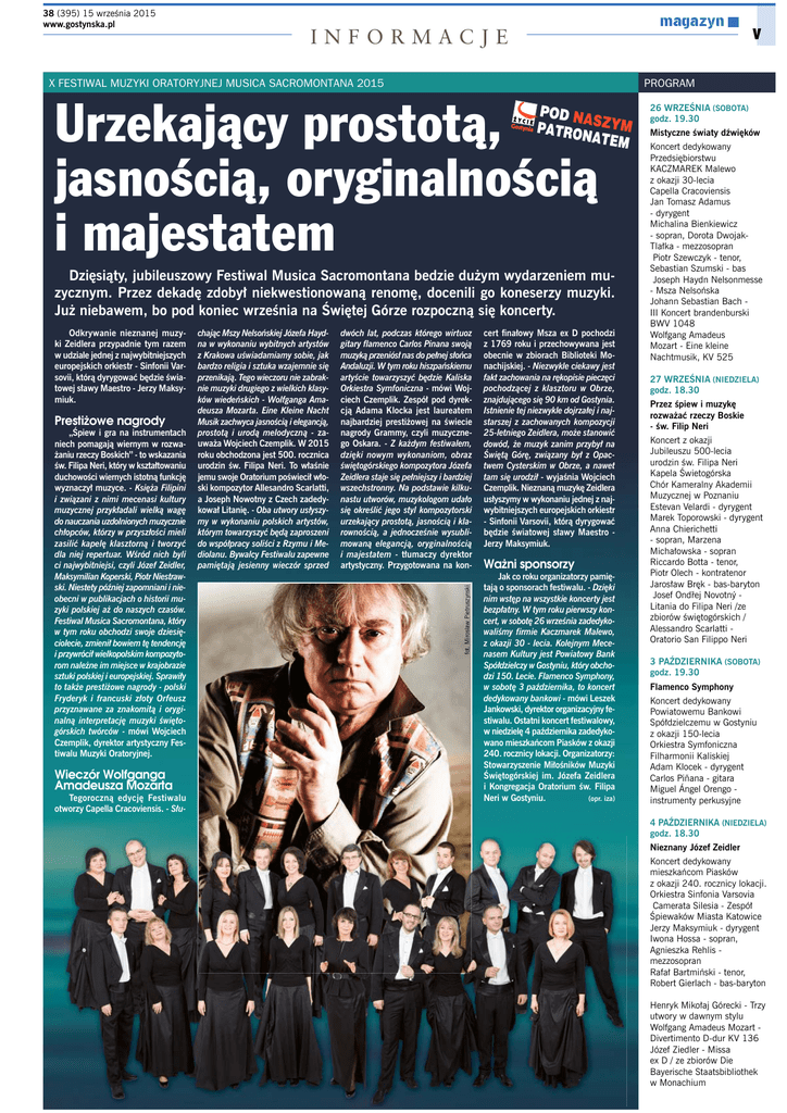 38 (395) 15 września 2015 www.gostynska.pl INFORMACJE X FESTIWAL MUZYKI ORATORYJNEJ MUSICA SACROMONTANA 2015 Urzekający prostotą, jasnością, oryginalnością i majestatem Dzięsiąty, jubileuszowy Festiwal Musica Sacromontana bedzie dużym wydarzeniem muzycznym. Przez dekadę zdobył niekwestionowaną renomę, docenili go koneserzy muzyki. Już niebawem, bo pod koniec września na Świętej Górze rozpoczną się koncerty. Prestiżowe nagrody „Śpiew i gra na instrumentach niech pomagają wiernym w rozważaniu rzeczy Boskich” - to wskazania św. Filipa Neri, który w kształtowaniu duchowości wiernych istotną funkcję wyznaczył muzyce. - Księża Filipini i związani z nimi mecenasi kultury muzycznej przykładali wielką wagę do nauczania uzdolnionych muzycznie chłopców, którzy w przyszłości mieli zasilić kapelę klasztorną i tworzyć dla niej repertuar. Wśród nich byli ci najwybitniejsi, czyli Józef Zeidler, Maksymilian Koperski, Piotr Niestrawski. Niestety później zapomniani i nieobecni w publikacjach o historii muzyki polskiej aż do naszych czasów. Festiwal Musica Sacromontana, który w tym roku obchodzi swoje dziesięciolecie, zmienił bowiem tę tendencję i przywrócił wielkopolskim kompozytorom należne im miejsce w krajobrazie sztuki polskiej i europejskiej. Sprawiły to także prestiżowe nagrody - polski Fryderyk i francuski złoty Orfeusz przyznawane za znakomitą i oryginalną interpretację muzyki świętogórskich twórców - mówi Wojciech Czemplik, dyrektor artystyczny Festiwalu Muzyki Oratoryjnej. Wieczór Wolfganga Amadeusza Mozarta Tegoroczną edycję Festiwalu otworzy Capella Cracoviensis. - Słu- chając Mszy Nelsońskiej Józefa Haydna w wykonaniu wybitnych artystów z Krakowa uświadamiamy sobie, jak bardzo religia i sztuka wzajemnie się przenikają. Tego wieczoru nie zabraknie muzyki drugiego z wielkich klasyków wiedeńskich - Wolfganga Amadeusza Mozarta. Eine Kleine Nacht Musik zachwyca jasnością i elegancją, prostotą i urodą melodyczną - zauważa Wojciech Czemplik. W 2015 roku obchodzona jest 500. rocznica urodzin św. Filipa Neri. To właśnie jemu swoje Oratorium poświecił włoski kompozytor Allesandro Scarlatti, a Joseph Nowotny z Czech zadedykował Litanię. - Oba utwory usłyszymy w wykonaniu polskich artystów, którym towarzyszyć będą zaproszeni do współpracy soliści z Rzymu i Mediolanu. Bywalcy Festiwalu zapewne pamiętają jesienny wieczór sprzed dwóch lat, podczas którego wirtuoz gitary flamenco Carlos Pinana swoją muzyką przeniósł nas do pełnej słońca Andaluzji. W tym roku hiszpańskiemu artyście towarzyszyć będzie Kaliska Orkiestra Symfoniczna - mówi Wojciech Czemplik. Zespół pod dyrekcją Adama Klocka jest laureatem najbardziej prestiżowej na świecie nagrody Grammy, czyli muzycznego Oskara. - Z każdym festiwalem, dzięki nowym wykonaniom, obraz świętogórskiego kompozytora Józefa Zeidlera staje się pełniejszy i bardziej wszechstronny. Na podstawie kilkunastu utworów, muzykologom udało się określić jego styl kompozytorski urzekający prostotą, jasnością i klarownością, a jednocześnie wysublimowaną elegancją, oryginalnością i majestatem - tłumaczy dyrektor artystyczny. Przygotowana na konfot. Miroslaw Pietruszynski Odkrywanie nieznanej muzyki Zeidlera przypadnie tym razem w udziale jednej z najwybitniejszych europejskich orkiestr - Sinfonii Varsovii, którą dyrygować będzie światowej sławy Maestro - Jerzy Maksymiuk. cert finałowy Msza ex D pochodzi z 1769 roku i przechowywana jest obecnie w zbiorach Biblioteki Monachijskiej. - Niezwykle ciekawy jest fakt zachowania na rękopisie pieczęci pochodzącej z klasztoru w Obrze, znajdującego się 90 km od Gostynia. Istnienie tej niezwykle dojrzałej i najstarszej z zachowanych kompozycji 25-letniego Zeidlera, może stanowić dowód, że muzyk zanim przybył na Świętą Górę, związany był z Opactwem Cysterskim w Obrze, a nawet tam się urodził - wyjaśnia Wojciech Czemplik. Nieznaną muzykę Zeidlera usłyszymy w wykonaniu jednej z najwybitniejszych europejskich orkiestr - Sinfonii Varsovii, którą dyrygować będzie światowej sławy Maestro Jerzy Maksymiuk. Ważni sponsorzy Jak co roku organizatorzy pamiętają o sponsorach festiwalu. - Dzięki nim wstęp na wszystkie koncerty jest bezpłatny. W tym roku pierwszy koncert, w sobotę 26 września zadedykowaliśmy firmie Kaczmarek Malewo, z okazji 30 - lecia. Kolejnym Mecenasem Kultury jest Powiatowy Bank Spółdzielczy w Gostyniu, który obchodzi 150. Lecie. Flamenco Symphony, w sobotę 3 października, to koncert dedykowany bankowi - mówi Leszek Jankowski, dyrektor organizacyjny festiwalu. Ostatni koncert festiwalowy, w niedzielę 4 października zadedykowano mieszkańcom Piasków z okazji 240. rocznicy lokacji. Organizatorzy: Stowarzyszenie Miłośników Muzyki Świętogórskiej im. Józefa Zeidlera i Kongregacja Oratorium św. Filipa Neri w Gostyniu. (opr. iza) V PROGRAM 26 WRZEŚNIA (SOBOTA) godz. 19.30 Mistyczne światy dźwięków Koncert dedykowany Przedsiębiorstwu KACZMAREK Malewo z okazji 30-lecia Capella Cracoviensis Jan Tomasz Adamus - dyrygent Michalina Bienkiewicz - sopran, Dorota DwojakTlałka - mezzosopran Piotr Szewczyk - tenor, Sebastian Szumski - bas Joseph Haydn Nelsonmesse - Msza Nelsońska Johann Sebastian Bach III Koncert brandenburski BWV 1048 Wolfgang Amadeus Mozart - Eine kleine Nachtmusik, KV 525 27 WRZEŚNIA (NIEDZIELA) godz. 18.30 Przez śpiew i muzykę rozważać rzeczy Boskie - św. Filip Neri Koncert z okazji Jubileuszu 500-lecia urodzin św. Filipa Neri Kapela Świetogórska Chór Kameralny Akademii Muzycznej w Poznaniu Estevan Velardi - dyrygent Marek Toporowski - dyrygent Anna Chierichetti - sopran, Marzena Michałowska - sopran Riccardo Botta - tenor, Piotr Olech - kontratenor Jarosław Bręk - bas-baryton Josef Ondřej Novotný Litania do Filipa Neri /ze zbiorów świętogórskich / Alessandro Scarlatti Oratorio San Filippo N