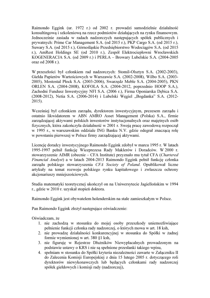 Raimondo Eggink (ur. 1972 r.) od 2002 r. prowadzi samodzielnie działalność konsultingową i szkoleniową na rzecz podmiotów działających na rynku finansowym. Jednocześnie zasiada w radach nadzorczych następujących spółek publicznych i prywatnych: Prime Car Management S.A. (od 2015 r.), PKP Cargo S.A. (od 2015 r.), Suwary S.A. (od 2015 r.), Górnośląskie Przedsiębiorstwo Wodociągów S.A. (od 2015 r.), AmRest Holdings SE (od 2010 r.), Zespół Elektrociepłowni Wrocławskich KOGENERACJA S.A. (od 2009 r.) i PERŁA – Browary Lubelskie S.A. (2004-2005 oraz od 2008 r.). W przeszłości był członkiem rad nadzorczych: Stomil-Olsztyn S.A. (2002-2003), Giełda Papierów Wartościowych w Warszawie S.A. (2002-2008), Wilbo S.A. (20032005), Mostostal Płock S.A. (2003-2006), Swarzędz Meble S.A. (2004-2005), PKN ORLEN S.A. (2004-2008), KOFOLA S.A. (2004-2012, poprzednio HOOP S.A.), Zachodni Fundusz Inwestycyjny NFI S.A. (2006 r.), Firma Oponiarska Dębica S.A. (2008-2012), Netia S.A. (2006-2014) i Lubelski Węgiel „Bogdanka” S.A. (20122015). Wcześniej był członkiem zarządu, dyrektorem inwestycyjnym, prezesem zarządu i ostatnio likwidatorem w ABN AMRO Asset Management (Polska) S.A., firmie zarządzającej aktywami polskich inwestorów instytucjonalnych oraz majętnych osób fizycznych, która zakończyła działalność w 2001 r. Swoją pracę zawodową rozpoczął w 1995 r., w warszawskim oddziale ING Banku N.V. gdzie odegrał znaczącą rolę w powstaniu pierwszej w Polsce firmy zarządzającej aktywami. Licencję doradcy inwestycyjnego Raimondo Eggink zdobył w marcu 1995 r. W latach 1995-1997 pełnił funkcję Wiceprezesa Rady Maklerów i Doradców. W 2000 r. stowarzyszenie AIMR (obecnie – CFA Institute) przyznało mu tytuł CFA (Chartered Financial Analyst) a w latach 2004-2013 Raimondo Eggink pełnił funkcję członka zarządu polskiego stowarzyszenia CFA Society of Poland. Opublikował liczne artykuły na temat rozwoju polskiego rynku kapitałowego i zwłaszcza ochrony akcjonariuszy mniejszościowych. Studia matematyki teoretycznej ukończył on na Uniwersytecie Jagiellońskim w 1994 r., gdzie w 2010 r. uzyskał stopień doktora. Raimondo Eggink jest obywatelem holenderskim na stałe zamieszkałym w Polsce. Pan Raimondo Eggink złożył następujące oświadczenie: Oświadczam, że 1. nie zachodzą w stosunku do mojej osoby przeszkody uniemożliwiające pełnienie funkcji członka rady nadzorczej, o których mowa w art. 18 ksh, 2. nie prowadzę działalności konkurencyjnej w stosunku do Spółki w żadnej formie wymienionej w art. 380 §1 ksh, 3. nie figuruję w Rejestrze Dłużników Niewypłacalnych prowadzonym na podstawie ustawy o KRS i nie są spełnione przesłanki takiego wpisu, 4. spełniam w stosunku do Spółki kryteria niezależności zawarte w Załączniku II do Zalecenia Komisji Europejskiej z dnia 15 lutego 2005 r. dotyczącego roli dyrektorów niewykonawczych lub będących członkami rady nadzorczej spółek giełdowych i komisji rady (nadzorczej), 5. spełniam kryteria Członka Niezależnego Rady Nadzorczej zawarte w §16 ust. 5 statutu Spółki, 6. bezpośrednio nie posiadam żadnych akcji Spółki, natomiast podmiot zależny ode mnie posiada 21.683 akcje Spółki.