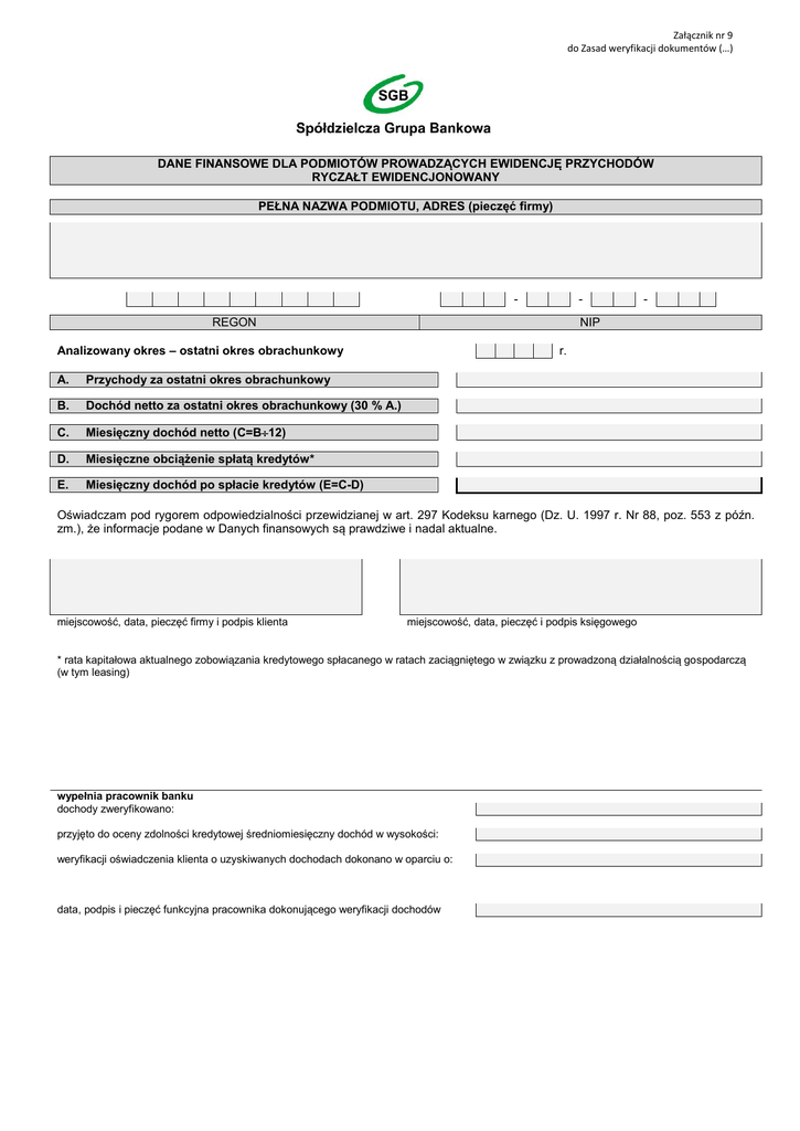 Załącznik nr 9 do Zasad weryfikacji dokumentów (…) DANE FINANSOWE DLA PODMIOTÓW PROWADZĄCYCH EWIDENCJĘ PRZYCHODÓW RYCZAŁT EWIDENCJONOWANY PEŁNA NAZWA PODMIOTU, ADRES (pieczęć firmy) - - REGON NIP Analizowany okres – ostatni okres obrachunkowy A. Przychody za ostatni okres obrachunkowy B. Dochód netto za ostatni okres obrachunkowy (30 % A.) C. Miesięczny dochód netto (C=B12) D. Miesięczne obciążenie spłatą kredytów* E. Miesięczny dochód po spłacie kredytów (E=C-D) - r. Oświadczam pod rygorem odpowiedzialności przewidzianej w art. 297 Kodeksu karnego (Dz. U. 1997 r. Nr 88, poz. 553 z późn. zm.), że informacje podane w Danych finansowych są prawdziwe i nadal aktualne. miejscowość, data, pieczęć firmy i podpis klienta miejscowość, data, pieczęć i podpis księgowego * rata kapitałowa aktualnego zobowiązania kredytowego spłacanego w ratach zaciągniętego w związku z prowadzoną działalnością gospodarczą (w tym leasing) wypełnia pracownik banku dochody zweryfikowano: przyjęto do oceny zdolności kredytowej średniomiesięczny dochód w wysokości: weryfikacji oświadczenia klienta o uzyskiwanych dochodach dokonano w oparciu o: data, podpis i pieczęć funkcyjna pracownika dokonującego weryfikacji dochodów