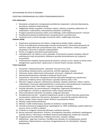 WYCHOWANIE DO ŻYCIA W RODZINIE PODSTAWA PROGRAMOWA DLA SZKÓŁ PONADGIMNAZJALNYCH Cele edukacyjne 1. Rozwijanie umiejętności rozwiązywania problemów związanych z okresem dojrzewania, dorastania i wyborem drogi życiowej. 2. Pogłębianie wiedzy związanej z funkcjami rodziny, miłością, przyjaźnią, pełnieniem ról małżeńskich i rodzicielskich, seksualnością człowieka i prokreacją. 3. Przyjęcie pozytywnej postawy wobec życia ludzkiego, osób niepełnosprawnych i chorych. 4. Kształtowanie postaw prozdrowotnych, prospołecznych i prorodzinnych. 5. Uzyskanie przez uczniów lepszego rozumienia siebie i najbliższego otoczenia. Zadania szkoły 1. Wspieranie wychowawczej roli rodziny. Integrowanie działań szkoły i rodziców. 2. Pomoc w kształtowaniu pozytywnego stosunku do płciowości. Odniesienie płciowości do wartości i pojęć takich jak: poszanowanie życia, miłość, małżeństwo, rodzina, przyjaźń, akceptacja i szacunek w relacjach międzyludzkich. 3. Pomoc w osiąganiu dojrzałości psychoseksualnej. 4. Uświadomienie roli rodziny w życiu człowieka. Promowanie trwałych związków, których podstawą jest więź emocjonalna, efektywne sposoby komunikowania się, wzajemne zrozumienie. 5. Przekazywanie rzetelnej, dostosowanej do poziomu rozwoju ucznia, wiedzy na temat zmian biologicznych, psychicznych i społecznych w różnych fazach rozwoju człowieka. Treści nauczania 1. 2. 3. 4. 5. 6. 7. 8. 9. 10. 11. 12. 13. 14. 15. 16. 17. Tożsamość i wielowymiarowość człowieka. Poczucie sensu życia. Komunikacja interpersonalna, asertywność, techniki negocjacji, empatia. Tolerancja wobec odmienności kulturowych, etnicznych, religijnych, seksualnych. Rozwój psychoseksualny człowieka w kolejnych fazach życia. Dojrzewanie: rozumienie i akceptacja kryteriów dojrzałości biologicznej, psychicznej i społecznej. Problemy okresu dojrzewania i sposoby radzenia sobie z nimi. Wartości i pojęcia związane z płciowością człowieka: męskość, kobiecość, miłość, rodzina, rodzicielstwo. Znaczenie odpowiedzialności w przeżywaniu własnej płciowości i budowaniu emocjonalnych więzi. Role kobiet i mężczyzn a panujące stereotypy. Inicjacja seksualna, jej uwarunkowania i następstwa. Argumenty biomedyczne, psychologiczne i moralne za opóźnianiem wieku inicjacji seksualnej. Istota seksualności człowieka i jej aspekty. Integracja seksualna. Komplementarność płci – wzajemne dopełnianie się płci w sferach fizycznej, psychicznej, emocjonalnej i społecznej. Rozumienie, akceptacja i szacunek dla osób płci odmiennej. Istota, rodzaje i etapy rozwoju miłości. Różnice w przeżywaniu miłości. Metody rozpoznawania płodności. Metody i środki antykoncepcji. Sposoby ich działania i zasady doboru. Choroby przenoszone drogą płciową i zapobieganie im. AIDS: profilaktyka, aspekt społeczny i etyczny, chory na AIDS w rodzinie. Trudności w osiąganiu tożsamości płciowej, możliwości pomocy. Normy zachowań seksualnych. Przemoc i przestępstwa seksualne; możliwości zapobiegania, sposoby obrony. Informacja o ośrodkach pomocy psychologicznej, medycznej i prawnej. Przygotowanie do małżeństwa. Problemy wierności, zaufania i dialogu. Małżeństwo ‐ jego fazy; trudności i konflikty oraz sposoby ich rozwiązywania; wartość małżeństwa. Macierzyństwo i ojcostwo. Przygotowanie do ról rodzicielskich. Adopcja. Bezdzietność. 18. Przebieg i higiena ciąży. Rozwój prenatalny dziecka. Szkoła rodzenia, poród i naturalne karmienie. Rola rodziców w okresie oczekiwania na narodziny dziecka, w czasie porodu i po narodzinach. 19. Funkcje rodziny, ze szczególnym uwzględnieniem wychowania dzieci w rodzinie. Znaczenie prawidłowych postaw rodzicielskich dla rozwoju dziecka. Samotne rodzicielstwo. 20. Nieplanowana ciąża; sposoby szukania pomocy w sytuacjach trudnych. 21. Aborcja jako zagrożenie dla zdrowia psychicznego i fizycznego ‐ aspekty: prawny, medyczny i etyczny. 22. Konflikty w rodzinie i ich przyczyny. Sposoby rozwiązywania konfliktów. 23. Przemoc w rodzinie. Wykorzystywanie seksualne. Profilaktyka. Możliwości uzyskiwania pomocy. 24. Zagrożenia życia społecznego: alkoholizm, narkomania, agresja, sekty, pornografia. 25. Prawodawstwo dotyczące rodziny. Zawarcie małżeństwa, separacja , rozwód. Prawa i obowiązki małżonków i rodziców, prawa dziecka. Obowiązki państwa wobec rodziny. 26. Człowiek wobec niepełnosprawności, starości, choroby, umierania i śmierci, w tym w aspekcie życia rodzinnego. 27. Poradnictwo młodzieżowe i rodzinne w Polsce. Osiągnięcia 1. Umiejętność podejmowania odpowiedzialnych decyzji dotyczących wyboru drogi życiowej, małżeństwa i rodziny. 2. Umiejętność świadomego kreowania własnej osobowości. 3. Przygotowanie, na podstawie wiedzy i wykształconych umiejętności, do poszanowania godności życia ludzkiego i dojrzałego funkcjonowania w rodzinie. 4. Znajomość podstawowych zasad postępowania w sferze ludzkiej płciowości i płodności. 5. Umiejętność poszukiwania i udzielania odpowiedzi na pytania: Kim jest człowiek? Jakie są jego cele i zadania życiowe? Jaki jest sens życia?
