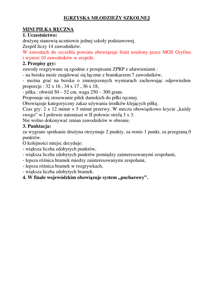 IGRZYSKA MŁODZIEŻY SZKOLNEJ MINI PIŁKA RĘCZNA 1. Uczestnictwo: drużynę stanowią uczniowie jednej szkoły podstawowej. Zespół liczy 14 zawodników. W zawodach do szczebla powiatu obowiązuje limit ustalony przez MOS Gryfino i wynosi 10 zawodników w zespole. 2. Przepisy gry: zawody rozgrywane są zgodnie z przepisami ZPRP z ułatwieniami : - na boisku może znajdować się łącznie z bramkarzem 7 zawodników, - można grać na boisku o zmniejszonych wymiarach zachowując odpowiednie proporcje : 32 x 16 , 34 x 17 , 36 x 18, - piłka : obwód 50 – 52 cm, waga 250 – 300 gram. Proponuje się stosowanie piłek damskich do piłki ręcznej. Obowiązuje kategoryczny zakaz używania środków klejących piłkę. Czas gry: 2 x 12 minut + 5 minut przerwy. W meczu obowiązkowo krycie „każdy swego” w I połowie natomiast w II połowie strefą 3 x 3. Nie wolno dokonywać zmian zawodników w obronie. 3. Punktacja: za wygrane spotkanie drużyna otrzymuje 2 punkty, za remis 1 punkt, za przegraną 0 punktów. O kolejności miejsc decyduje: - większa liczba zdobytych punktów, - większa liczba zdobytych punktów pomiędzy zainteresowanymi zespołami, - lepsza różnica bramek miedzy zainteresowanymi zespołami, - lepsza różnica bramek w rozgrywkach, - większa liczba zdobytych bramek. 4. W finale wojewódzkim obowiązuje system „pucharowy”.
