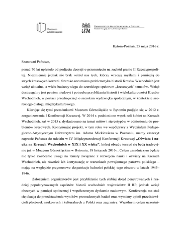 Bytom-Poznań, 25 maja 2016 r. Szanowni Państwo, ponad 70 lat upłynęło od podjęcia decyzji o przesunięciu na zachód granic II Rzeczypospolitej. Niezmiennie jednak nie brak wśród nas tych, którzy wracają myślami i pamięcią do swych kresowych korzeni. Szeroko rozumiana problematyka historii Kresów Wschodnich jest wciąż aktualna, a wielu badaczy sięga do szerokiego spektrum „kresowych” tematów. Wciąż dostrzegalny jest pewien niedosyt i potrzeba przybliżania historii i wielokulturowości Kresów Wschodnich, w postaci przedsięwzięć o szerokim wydźwięku społecznym, w kontekście szerokiego dialogu międzykulturowego. Kierując się tymi przesłankami Muzeum Górnośląskie w Bytomiu podjęło się w 2012 r. zorganizowania I Konferencji Kresowej. W 2014 r. podniesiono wątek roli kobiet na Kresach Wschodnich, zaś w 2015 r. dyskutowano na temat mitów i stereotypów w odniesieniu do problemów kresowych. Kontynuując projekt, w tym roku we współpracy z Wydziałem Pedagogiczno-Artystycznym Uniwersytetu im. Adama Mickiewicza w Poznaniu, mamy zaszczyt zaprosić Państwa do udziału w IV Międzynarodowej Konferencji Kresowej „Oświata i nauka na Kresach Wschodnich w XIX i XX wieku”, której obrady toczyć się będą tradycyjnie już w Muzeum Górnośląskim w Bytomiu, 18 listopada 2016 r. Celem zasadniczym będzie nie tylko zwrócenie uwagi na tematy związane z rozwojem nauki i oświaty na Kresach Wschodnich, ale również ich kontynuację w warunkach powojennego państwa polskiego – mając na względzie przymusowe ekspatriacje ludności polskiej tego obszaru w latach 1945– 1946. Założeniem organizatorów jest przybliżenie tych słabiej dotąd penetrowanych i rzadziej popularyzowanych aspektów historii wschodnich województw II RP, jednak wciąż obecnych w pamięci społecznej i współczesnym dyskursie naukowym. Konferencja ma stać się okazją do przedstawienia wyników prowadzonych badań oraz wymiany opinii przedstawicieli placówek naukowych i kulturalnych z Polski oraz zagranicy. Wspólnym celem uczestni- ków będzie refleksja nad koniecznością nie tylko przekazywania wiedzy na temat historii dawnych Kresów Rzeczypospolitej, ale też zachowania ich obrazu w pamięci pokoleń. Serdecznie zapraszamy do udziału w konferencji. W załączeniu przesyłamy formularz zgłoszeniowy, który należy przesłać na adres organizatorów do 30 czerwca 2016 r. Organizatorzy przewidują opłatę konferencyjną w wysokości 200 zł, która przeznaczona zostanie na pokrycie kosztów posiłków i materiały konferencyjne, a którą należy uiścić do 15 września 2016 r. Ostateczny program konferencji zostanie przesłany do Państwa w drugiej połowie września. Planowane jest, jak co roku, wydanie recenzowanej publikacji pokonferencyjnej. Teksty oraz materiały ikonograficzne, w formacie edytowalnym – Microsoft Word 95–2000, XP lub Vista, należy przesłać drogą mailową na adres organizatorów do 15 grudnia 2016 r. Z wyrazami szacunku, w nadziei na Państwa obecność Dr hab. Mirosław J. Śmiałek, prof. UAM Dziekan Wydziału Pedagogiczno-Artystycznego Uniwersytetu im. Adama Mickiewicza w Poznaniu Leszek Jodliński Dyrektor Muzeum Górnośląskiego w Bytomiu Komitet naukowy konferencji: Dr hab. Piotr Gołdyn, prof. UAM (Uniwersytet im. Adama Mickiewicza w Poznaniu) Ks. prof. dr hab. Jan Kopiec (Uniwersytet Opolski) Dr Joanna Lusek (Muzeum Górnośląskie w Bytomiu) Dr hab. Mirosław J. Śmiałek, prof. UAM (Uniwersytet im. Adama Mickiewicza w Poznaniu) Prof. dr hab. Stefania Walasek (Uniwersytet Wrocławski) Zgłoszenia oraz pytania prosimy kierować do sekretariatu konferencji: Dr hab. Piotr Gołdyn, prof. UAM Wydział Pedagogiczno-Artystyczny Uniwersytet im. Adama Mickiewicza w Poznaniu ul. Nowy Świat 28–30 62-800 Kalisz [email protected] Dr Joanna Lusek Muzeum Górnośląskie w Bytomiu ul. Wojciecha Korfantego 34 41-902 Bytom [email protected] KARTA ZGŁOSZENIA IV MIĘDZYNARODOWA KONFERENCJA KRESOWA „OŚWIATA I NAUKA NA KRESACH WSCHODNICH NA PRZEŁOMIE W XIX I XX WIEKU” BYTOM, 18 listopada 2016 r. ORGANIZATORZY PROSZĄ O PRZYSŁANIE ZGŁOSZENIA DO 30 CZERWCA 2016 R. WŁĄCZNIE Tytuł naukowy, imię i nazwisko: …………………………………………………..……………………….…………………………………………….………………………………………………….. Instytucja: …………………………………………………..……………………….…………………………………………………………………………………….…………… Temat wystąpienia (referat [ok. 20 min.]/komunikat [ok. 10 min.]): …………………………………………………..……………………….…………………………..…………………………………………………………………….. Do zgłoszenia prosimy dołączyć streszczenie wystąpienia (5–7 zdań) Adres do korespondencji: Ulica/nr: …………………………………………………..……………………….…………………………….………………………………………………………………… Miejscowość oraz kod pocztowy: ……………………………………………….…………..……………………….…………………..…………………………………………………………………. Telefon / fax / e-mail: …………………………………………………..……………………….…………………………………………………...…………………………………………. Proszę o wystawienie faktury za udział w konferencji: Nazwa instytucji: …………………………………………………..……………………….………………………………………………………………………………………………… Adres: ………………………………………