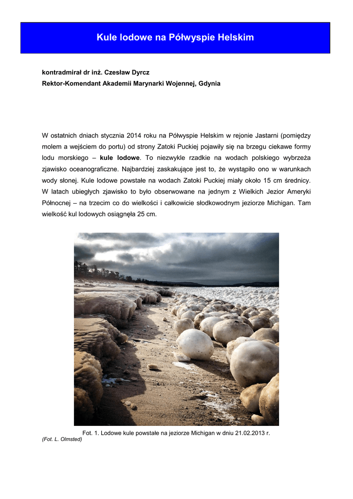 Kule lodowe na Półwyspie Helskim kontradmirał dr inż. Czesław Dyrcz Rektor-Komendant Akademii Marynarki Wojennej, Gdynia W ostatnich dniach stycznia 2014 roku na Półwyspie Helskim w rejonie Jastarni (pomiędzy molem a wejściem do portu) od strony Zatoki Puckiej pojawiły się na brzegu ciekawe formy lodu morskiego – kule lodowe. To niezwykle rzadkie na wodach polskiego wybrzeża zjawisko oceanograficzne. Najbardziej zaskakujące jest to, że wystąpiło ono w warunkach wody słonej. Kule lodowe powstałe na wodach Zatoki Puckiej miały około 15 cm średnicy. W latach ubiegłych zjawisko to było obserwowane na jednym z Wielkich Jezior Ameryki Północnej – na trzecim co do wielkości i całkowicie słodkowodnym jeziorze Michigan. Tam wielkość kul lodowych osiągnęła 25 cm. Fot. 1. Lodowe kule powstałe na jeziorze Michigan w dniu 21.02.2013 r. (Fot. L. Olmsted) Kule lodowe na Półwyspie Helskim Powstanie kul lodowych na akwenie słonowodnej Zatoki Puckiej jest oceniane jako wyjątkowe, rzadkie i bardzo interesujące zjawisko oceanograficzne związane z tworzeniem form lodu morskiego. Na powstanie kul lodowych na wybrzeżu Półwyspu Helskiego w okolicy Jastarni wpłynęło wiele warunków, które wystąpiły jednocześnie podczas ostatnich dni stycznia bieżącego roku. Należy do nich zaliczyć: ▪ długotrwały wiatr o kierunku południowym i południowo-wschodnim o sile 4–6 ºB powstały ze względu na umiejscowienie wyżu barycznego rozbudowanego nad Finlandią i północno-zachodnią Rosją; ▪ wysoką falę morską wygenerowaną na styku Zatoki Puckiej i Półwyspu Helskiego oraz wydłużoną drogę jej spływu w strefie styku z lądem; ▪ niską temperaturę powietrza sprzyjającą oddawaniu do atmosfery ciepła przez wodę morską i powstawaniu lodu morskiego; ▪ ochłodzenie mas wody do temperatury zamarzania wody o danym zasoleniu; ▪ konfigurację głębokości morza (dna morskiego) w strefie przybrzeżnej oraz powiększoną strefę spływu fali toczącej formy lodowe ze względu na obniżenie poziomu morza w związku z długotrwałym oddziaływaniem układu wysokiego ciśnienia. Fot. 2. Kule lodowe rozmieszczone na wschód od mola w Jastarni (01.02.2014 r.) (Fot. C. Dyrcz, 01.02.2014 r.) 2 Kule lodowe na Półwyspie Helskim ok. 15 cm Fot. 3. Rozmiar kul lodowych obserwowanych w Jastarni (01.02.2014 r.) (Fot. C. Dyrcz, 01.02.2014 r.) Fot. 4. Kule lodowe w Jastarni z widocznym niskim stanem wysokości morza w dniu obserwacji 01.02.2014 r. (Fot. C. Dyrcz, 01.02.2014 r.) 3 Kule lodowe na Półwyspie Helskim Na Zatoce Puckiej poddanej długotrwałemu działaniu wiatru i wygenerowanej fali wystąpiło intensywne wiatrowe mieszanie wód powierzchniowych, które doprowadziło do ich oziębienia w całej masie. W rezultacie oziębienia wody do temperatury zamarzania kryształy lodu powstawały nie tylko na powierzchni, ale także wewnątrz wychłodzonych mas wody Zatoki Puckiej, szczególnie w strefie brzegowej i w obszarze styku z krawędzią pływającego lodu. Typowym zjawiskiem dla takich warunków jest powstawanie śryżu, a następnie lepy lodowej i krążków lodowych. Nałożenie się warunków sprzyjających powstaniu kul lodowych doprowadziło w efekcie do procesu, w którym lód znajdujący się w strefie spływu marznącej wody morskiej rozbity został na drobną krę, a fala toczyła ją po piasku, tworząc regularne, gładko wyszlifowane bryły lodu. Określania i opisu form lodowych dokonuje się przede wszystkim podczas obserwacji wzrokowych. Kule lodowe są regionalną osobliwością procesów lodowych poznanych na brzegach jeziora Michigan i obecnie na wybrzeżu Zatoki Puckiej w pobliżu Jastarni. 4