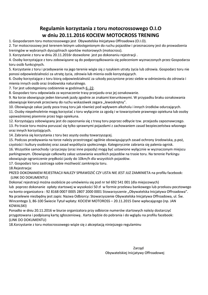 Regulamin korzystania z toru motocrossowego O.I.O w dniu 20.11.2016 KOCIEW MOTOCROSS TRENING 1. Gospodarzem toru motocrossowego jest Obywatelska Inicjatywa Offroadowa (O.I.O). 2. Tor motocrossowy jest terenem leśnym udostępnionym do ruchu pojazdów i przeznaczony jest do prowadzenia treningów w wybranych dyscyplinach sportów motorowych (motocross). 3. Korzystanie z toru w dniu 20.11.2016r dozwolone jest po dokonaniu rejestracji . 4. Osoby korzystające z toru zobowiązane są do podporządkowania się poleceniom wyznaczonych przez Gospodarza toru osób funkcyjnych. 5. Korzystanie z toru i przebywanie na jego terenie wiąże się z ryzykiem utraty życia lub zdrowia. Gospodarz toru nie ponosi odpowiedzialności za utratę życia, zdrowia lub mienia osób korzystających. 6. Osoby korzystające z toru biorą odpowiedzialność za szkody poczynione przez siebie w odniesieniu do zdrowia i mienia innych osób oraz środowiska naturalnego. 7. Tor jest udostępniony codziennie w godzinach 6 -22. 8. Gospodarz toru odpowiada za wyznaczenie trasy przejazdu oraz jej oznakowanie. 9. Na torze obowiązuje jeden kierunek jazdy zgodnie ze znakami kierunkowymi. W przypadku braku oznakowania obowiązuje kierunek przeciwny do ruchu wskazówek zegara „lewoskrętny”. 10. Obowiązuje zakaz jazdy poza trasą toru jak również pod wpływem alkoholu i innych środków odurzających. 11. Osoby niepełnoletnie mogą korzystać z toru wyłącznie za zgodą i w towarzystwie prawnego opiekuna lub osoby upoważnionej pisemnie przez tego opiekuna. 12. Korzystający zobowiązany jest do zapoznania się z trasą toru poprzez odbycie tzw. przejazdu zapoznawczego. 13. Po trasie toru można poruszać się tylko sprawnymi pojazdami z zachowaniem zasad bezpieczeństwa własnego oraz innych korzystających. 14. Zabrania się korzystania z toru bez asysty osoby towarzyszącej. 15. Podczas przebywania na torze należy przestrzegać ogólnie obowiązujących zasad ochrony środowiska, p.poż, czystości i kultury osobistej oraz zasad współżycia społecznego. Kategorycznie zabrania się palenia ognisk. 16. Wszystkie samochody i przyczepy (oraz inne pojazdy) mogą być ustawione wyłącznie w wyznaczonym miejscu parkingowym. Obowiązuje całkowity zakaz ustawiania wszelkich pojazdów na trasie toru. Na terenie Parkingu obowiązuje ograniczenie prędkości jazdy do 10km/h dla wszystkich pojazdów. 17. Gospodarz toru zastrzega sobie możliwość zamknięcia toru. 18.Rejestracja: PRZED DOKONANIEM REJESTRACJI NALEZY SPRAWDZIĆ CZY LISTA NIE JEST JUZ ZAMKNIETA na profilu facebook: (LINK DO DOKUMENTU) Dokonać rejestracji można osobiście po umówieniu się pod nr tel 692 541 001 (dla miejscowych) lub poprzez dokonanie opłaty startowej w wysokości 50 zł w formie przelewu bankowego lub przekazu pocztowego na konto organizatora : 92 8168 0007 0005 2807 2000 0001 Stowarzyszenie „Obywatelska Inicjatywa Offroadowa”. Na przelewie niezbędny jest zapis: Nazwa Odbiorcy: Stowarzyszenie Obywatelska Inicjatywa Offroadowa, ul. Św. Wincentego 3, 86-100 Świecie Tytuł wpłaty: KOCIEW MOTOROSS – 20.11.2015 Dane wpłacającego (np. JAN KOWALSKI) Ponadto w dniu 20.11.2016 w biurze organizatora przy odbiorze numerów startowych należy dostarczyć przygotowana i podpisaną kartę zgłoszeniową . Karta będzie do pobrania i do wglądu na profilu facebook: (LINK DO DOKUMENTU) 18.Korzystanie z toru motocrossowego wiąże się z akceptacją niniejszego regulaminu Zarząd Obywatelskiej Inicjatywy Offroadowej