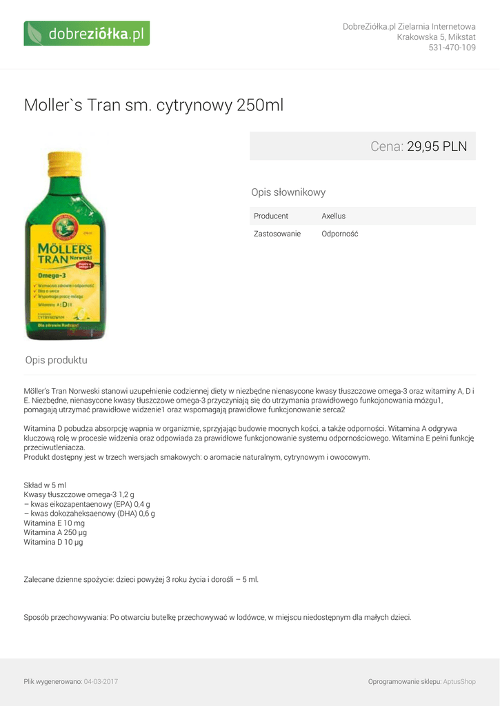 DobreZiółka.pl Zielarnia Internetowa Krakowska 5, Mikstat 531-470-109 Moller`s Tran sm. cytrynowy 250ml Cena: 29,95 PLN Opis słownikowy Producent Axellus Zastosowanie Odporność Opis produktu Möller’s Tran Norweski stanowi uzupełnienie codziennej diety w niezbędne nienasycone kwasy tłuszczowe omega-3 oraz witaminy A, D i E. Niezbędne, nienasycone kwasy tłuszczowe omega-3 przyczyniają się do utrzymania prawidłowego funkcjonowania mózgu1, pomagają utrzymać prawidłowe widzenie1 oraz wspomagają prawidłowe funkcjonowanie serca2 Witamina D pobudza absorpcję wapnia w organizmie, sprzyjając budowie mocnych kości, a także odporności. Witamina A odgrywa kluczową rolę w procesie widzenia oraz odpowiada za prawidłowe funkcjonowanie systemu odpornościowego. Witamina E pełni funkcję przeciwutleniacza. Produkt dostępny jest w trzech wersjach smakowych: o aromacie naturalnym, cytrynowym i owocowym. Skład w 5 ml Kwasy tłuszczowe omega-3 1,2 g – kwas eikozapentaenowy (EPA) 0,4 g – kwas dokozaheksaenowy (DHA) 0,6 g Witamina E 10 mg Witamina A 250 μg Witamina D 10 μg Zalecane dzienne spożycie: dzieci powyżej 3 roku życia i dorośli – 5 ml. Sposób przechowywania: Po otwarciu butelkę przechowywać w lodówce, w miejscu niedostępnym dla małych dzieci. Plik wygenerowano: 04-03-2017 Oprogramowanie sklepu: AptusShop DobreZiółka.pl Zielarnia Internetowa Krakowska 5, Mikstat 531-470-109 Stosowanie oleju z wątroby dorsza, zgodnie z zaleceniami producenta, jest bezpieczne podczas ciąży i karmienia piersią. Jednoczesne przyjmowanie tranu oraz innych preparatów zawierających witaminy A i D przez kobiety w ciąży i dzieci, powinno być konsultowane z lekarzem. Plik wygenerowano: 04-03-2017 Powered by TCPDF (www.tcpdf.org) Oprogramowanie sklepu: AptusShop