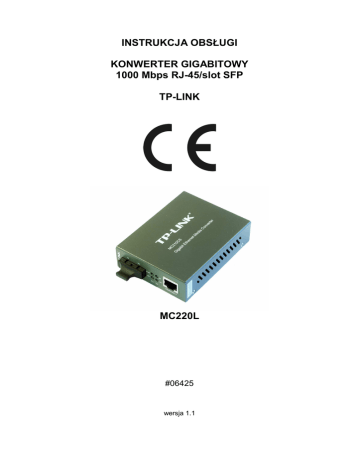 INSTRUKCJA OBSŁUGI KONWERTER GIGABITOWY 1000 Mbps RJ-45/slot SFP TP-LINK MC220L #06425 wersja 1.1 Wstęp Gigabitowe konwertery MC220L firmy TP-LINK umoŜliwiają zmianę medium przewodzącego strumień danych ze standardowej skrętki STP/UTP na światłowód. Urządzenia pozwalają na łączenie segmentów wykonanych kablem miedzianym z segmentami wykonanymi kablem światłowodowym - konwertery mediują pomiędzy segmentami 1000Base-TX a 1000Base-FX. Są zaprojektowane dla duŜych grup roboczych o odpowiednim paśmie i prędkości, których wymagają sieci Gigabit Ethernet. Konwertery gigabitowe są zgodne ze standardami IEEE 802.3/ab/z. Posiadają jedno złącze UTP oraz jeden slot SFP. Dzięki przełącznikowi moŜliwa jest konfiguracja urządzeń do pracy na porcie FX w trybach pełnego dupleksu lub pół-dupleksu. Atutami konwerterów są: automatyczna detekcja trybu transmisji, praca w pół lub całym dupleksie, automatyczna negocjacja szybkości transmisji oraz automatyczne MDI/MDIX (wykrywanie uplinku, czyli połączeń kaskadowych dla 100Base-TX). Urządzenia są ponadto wyposaŜone w dobrze widoczne wskaźniki LED, umoŜliwiające łatwą kontrolę i monitoring działania. Całość zasilana jest poprzez zewnętrzny zasilacz, 5V DC 2A, ~230V AC 50Hz. OstrzeŜenie NaleŜy zapewnić bezpieczne warunki pracy urządzenia. Dokonanie przez uŜytkownika jakichkolwiek własnych zmian w urządzeniu moŜe spowodować jego nieprawidłowe funkcjonowanie i utratę gwarancji. Bezpieczeństwo uŜytkowania Urządzenie zostało zaprojektowane i wyprodukowane z najwyŜszą starannością o bezpieczeństwo osób instalujących i uŜytkujących. Dla zapewnienia bezpieczeństwa pracy, naleŜy stosować się do wszelkich wskazań zawartych w tej instrukcji jak i instrukcjach obsługi urządzeń towarzyszących (np. komputera PC). 1. Zawartość opakowania - konwerter MC220L, - zasilacz zewnętrzny AC/DC, - instrukcja obsługi w języku angielskim, - niniejsza instrukcja obsługi. Podczas dostawy naleŜy upewnić się, Ŝe opakowanie nie jest uszkodzone. W przypadku stwierdzonych uszkodzeń naleŜy niezwłocznie skontaktować się z dostawcą. Prosimy równieŜ o sprawdzenie zgodności zawartości opakowania z powyŜej zamieszczoną listą. 2. Zawartość instrukcji Instrukcja ta zawiera opis konwerter MC220L z odpowiednimi procedurami instalacji, konfiguracji i uŜytkowania. Przed przystąpieniem do instalacji konwertera naleŜy dokładnie przeczytać całość tej instrukcji, w szczególności zaś punkty poświęcone bezpieczeństwu. 3. Zasady bezpieczeństwa Konwerter MC220L jest zgodny z przepisami w zakresie bezpieczeństwa uŜytkowania urządzeń elektrycznych. NaleŜy stosować się do poniŜszych zaleceń: - gniazdo sieciowe musi być uziemione zgodnie z obowiązującymi przepisami, - przed przeniesieniem lub wykonywaniem innych operacji technicznych urządzenie naleŜy odłączyć od zasilania, - nie stosować uszkodzonych lub zuŜytych przewodów zasilania, gdyŜ powodują one znaczne zagroŜenie dla bezpieczeństwa uŜytkownika, - prace instalacyjne muszą być wykonywane przez odpowiednio przeszkolony personel techniczny, - nie stosować urządzenia w miejscach występowania substancji łatwopalnych, - zabezpieczyć urządzenie przed dostępem dzieci lub osób niepowołanych, 2 - upewnić się, Ŝe urządzenie zostało odpowiednio ustawione/zamocowane, - urządzenie traktowane jest jako wyłączone dopiero po odłączeniu przewodów zasilania oraz przewodów łączących je z innymi urządzeniami, - jeśli urządzenie zostanie przeniesione z miejsca chłodnego do ciepłego, w jego wnętrzu moŜe skroplić się para wodna uniemoŜliwiając prawidłowe funkcjonowanie. NaleŜy wówczas odczekać, aŜ wilgoć odparuje. Uwaga: Nie naleŜy dotykać styków gniazd znajdujących się na obudowie urządzenia. Wyładowanie elektrostatyczne moŜe spowodować trwałe uszkodzenie urządzenia. 4. Budowa urządzenia Panel przedni Panel tylni Na przednim panelu urządzenia znajdują się: - slot SFP - złącze 1000BASE-T, - diody LED informujące o stanie jego pracy: PRW FX TX Włączona Podłączone zasilanie Wyłączona Odłączone zasilanie FDX/Col Włączona LINK Włączona Poprawne połączenie na porcie FX Poprawne połączenie na porcie TP RX Włączona Transmisja danych na porcie TP Na tylnym panelu znajdują się: - gniazdo zasilania DC 5V/2A, - przełącznik DIP: Znaczenie ustawień przełącznika: FORCE AUTO – port FX działa w trybie FORCE (wymuszonej prędkości połączenia); – port FX działa w trybie automatycznej negocjacji połączenia. Dwa podłączone są w tym samym czasie 2 konwertery gigabitowe – oba muszą mieć ustawiony tryb FORCE. Gdy podłączone są inne urządzenia, np. przełącznik gigabitowy – wówczas konwerter musi być ustawiony w trybie AUTO. 3 5. Instalacja 5.1 Połączenie urządzeń 1000BASE-TX Uwaga: NaleŜy uŜyć jednego konwertera MC200CM i jednego MC210CS. W przeciwnym wypadku wystąpi błąd. Długość skrętki nie moŜe przekroczyć 100 metrów. 5.2 Połączenie urządzenia 100Base-TX z urządzeniem 100BASE-FX Uwaga: Długość skrętki nie moŜe przekroczyć 100 metrów. 4 6. Środowisko pracy Konwerter MC220L został zaprojektowany do pracy w warunkach domowych i biurowych. NaleŜy zadbać, aby urządzenie umieszczone było w sposób zapewniający dobry przepływ powietrza i łatwy dostęp do portów. Powietrze powinno być wolne od zanieczyszczeń, a urządzenie nie powinno znajdować się w bezpośredniej bliskości źródeł ciepła (piece, grzejniki, bezpośrednie nasłonecznienie) bądź urządzeń generujących zakłócenia elektromagnetyczne (silniki, telewizory, itp.). 7. Zasilanie Konwerter zasilany jest zewnętrznym zasilaczem, który naleŜy podłączyć do sieci 230 V. Wymagana jest instalacja zasilająca z obwodem ochronnym. 8. Konserwacja Konwerter MC220L nie wymaga Ŝadnych szczególnych czynności konserwacyjnych. Zalecamy umiesz