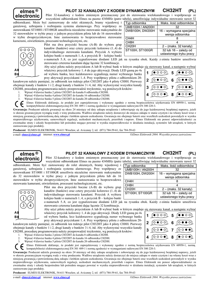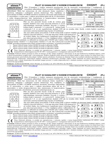 elmes electronic PILOT 32 KANAŁOWY Z KODEM DYNAMICZNYM CH32HT (PL) Pilot 32-kanałowy z kodem zmiennym przeznaczony jest do sterowania wielokanałowego i współpracuje ze wszystkimi odbiornikami Elmes na pasmo 434MHz (patrz tabela), umożliwiając indywidualne sterowanie nawet 32 odbiornikami. Może być zastosowany do rolet okiennych, bramy wjazdowej i Typ odbiornika Maks. ilość odbiorników garażowej, uzbrajania i rozbrajania systemu alarmowego. Przy współpracy ze UMB100H / AN200H 32 sterownikami ST100H i ST100GR umożliwia niezależne sterowanie maksymalnie do DWB100H, DW200H 16 – wymagana specjalna 32 sterowników w trybie pracy z jednym przyciskiem pilota lub do 16 sterowników wersja odbiornika w trybie dwuprzyciskowym. Inne zastosowania to bezprzewodowe sterowanie CH4H 8 kamerami, oświetleniem, procesami technologicznymi, etc. CH8H 4 Pilot ma dwa przyciski boczne (A-B) do wyboru grup CH20H 2 – (maks. 32 kanały) kanałów (banków) oraz cztery przyciski kolorowe (1..4) do ST100H, ST100GR 32 lub 16 – zależy od indywidualnego sterowania kanałami. Przycisk A wybiera ustawionego trybu pracy kolejno banki o numerach 1..4, a przycisk B – kolejno banki 1 2 o numerach 5..8, co jest sygnalizowane diodami LED jak na rysunku obok. Każdy z ośmiu banków umożliwia sterowanie czterema kanałami dając łącznie 32 kombinacje. 3 4 Aby użyć pilota należy przyciskiem A lub B wybrać bank w którym znajduje się sterowany kanał, a następnie wybrać A właściwy przycisk kolorowy 1..4 do jego aktywacji. Diody LED gasną po 4s 5 od wyboru banku, lecz każdorazowo sygnalizują numer wybranego banku 1 B przy aktywacji przyciskami 1..4. Przy współpracy pilota z odbiornikiem 206 kanałowym należy pamiętać, że odbiornik ten traktuje pilot CH32HT jako 4 piloty CH8H. Pierwszy 2 obejmuje kanały z banków 1 i 2, drugi kanały z banków 3 i 4, itd. Aby wykorzystać wszystkie kanały 3 7 CH20H, procedurę programowania należy przeprowadzić trzykrotnie, wg poniższych kroków: 1. 2. 3. Wpisać 4 klawisz banku 2 pilota CH32HT do kanału 8 odbiornika CH20H. 4 8 Wpisać 4 klawisz banku 4 pilota CH32HT do kanału 16 odbiornika CH20H. Wpisać 4 klawisz banku 5 pilota CH32HT do kanału 20 odbiornika CH20H. Elmes Elektronik deklaruje, że produkt jest zaprojektowany i wykonany zgodnie z normą bezpieczeństwa użytkowania EN 60950-1, normą kompatybilności elektromagnetycznej EN 301 489-1 i normą zgodności w wymaganiami radiowymi EN 300 220-3. Gwarancja: Producent udziela gwarancji na okres 24 miesięcy od daty zakupu urządzenia i zobowiązuje się do jego każdorazowej bezpłatnej naprawy, jeżeli w okresie gwarancyjnym wystąpią wady z winy producenta. Wadliwe urządzenie należy dostarczyć do miejsca zakupu w stanie czystym i na własny koszt wraz z niniejszą gwarancją z potwierdzoną datą zakupu i krótkim opisem uszkodzenia. Gwarancja nie obejmuje baterii oraz wszelkich uszkodzeń powstałych w wyniku nieprawidłowego użytkowania, samowolnych regulacji, uszkodzeń mechanicznych, przeróbek i napraw. Elmes Elektronik nie ponosi odpowiedzialności za ewentualne straty i szkody bezpośrednie lub pośrednie mogące powstać w wyniku nieprawidłowości w działaniu instalacji, systemów lub urządzeń, w których zastosowano jego produkty. Producent: ELMES ELEKTRONIK, 54-611 Wrocław, ul. Avicenny 2, tel. (071) 784-59-61, fax 784-59-63 e-mail: [email protected] internet: www.elmes.pl elmes electronic Elmes Elektronik 2004. Wszystkie prawa zastrzeżone. PILOT 32 KANAŁOWY Z KODEM DYNAMICZNYM CH32HT (PL) Pilot 32-kanałowy z kodem zmiennym przeznaczony jest do sterowania wielokanałowego i współpracuje ze wszystkimi odbiornikami Elmes na pasmo 434MHz (patrz tabela), umożliwiając indywidualne sterowanie nawet 32 odbiornikami. Może być zastosowany do rolet okiennych, bramy wjazdowej i Typ odbiornika Maks. ilość odbiorników garażowej, uzbrajania i rozbrajania systemu alarmowego. Przy współpracy ze UMB100H / AN200H 32 sterownikami ST100H i ST100GR umożliwia niezależne sterowanie maksymalnie DWB100H, DW200H 16 – wymagana specjalna do 32 sterowników w trybie pracy z jednym przyciskiem pilota lub do 16 wersja odbiornika sterowników w trybie dwuprzyciskowym. Inne zastosowania to bezprzewodowe CH4H 8 sterowanie kamerami, oświetleniem, procesami technologicznymi, etc. CH8H 4 Pilot ma dwa przyciski boczne (A-B) do wyboru grup CH20H 2 – (maks. 32 kanały) kanałów (banków) oraz cztery przyciski kolorowe (1..4) do 32 lub 16 – zależy od indywidualnego sterowania kanałami. Przycisk A wybiera ST100H, ST100GR ustawionego trybu pracy kolejno banki o numerach 1..4, a przycisk B – kolejno banki 1 2 o numerach 5..8, co jest sygnalizowane diodami LED jak na rysunku obok. Każdy z ośmiu banków umożliwia sterowanie czterema kanałami dając łącznie 32 kombinacje. 3 4 Aby użyć pilota należy przyciskiem A lub B wybrać bank w którym znajduje się sterowany kanał, a następnie wybrać A właściwy przycisk kolorowy 1..4 do jego aktywacji. Diody LED gasną po 4s 5 od wyboru banku, lecz każdorazowo sygnalizują numer wybranego banku 1 B przy aktywacji przyciskami 1..4. Przy współpracy pilota z odbiornikiem 206 kanałowym należy pamiętać, że odbiornik ten traktuje pilot CH32HT jako 4 piloty CH8H. Pierwszy 2 obejmuje kanały z banków 1 i 2, drugi kanały z banków 3 i 4, itd. Aby wykorzystać wszystkie kanały 3 7 CH20H, procedurę programowania należy przeprowadzić trzykrotnie, wg poniższych kroków: 1. 2. 3. Wpisać 4 klawisz banku 2 pilota CH32HT do kanału 8 odbiornika CH20H. 4 8 Wpisać 4 klawisz banku 4 pilota CH32HT do kanału 16 odbiornika CH20H. Wpisać 4 klawisz banku 5 pilota CH32HT do kanału 20 odbiornika CH20H. Elmes Elektronik deklaruje, że produkt jest zaprojektowany i wykonany zgodnie z normą bezpieczeństwa użytkowania EN 60950-1, normą kompatybilności elektromagnetycznej EN 301 489-1 i normą zgodności w wymaganiami radiowymi EN 300 