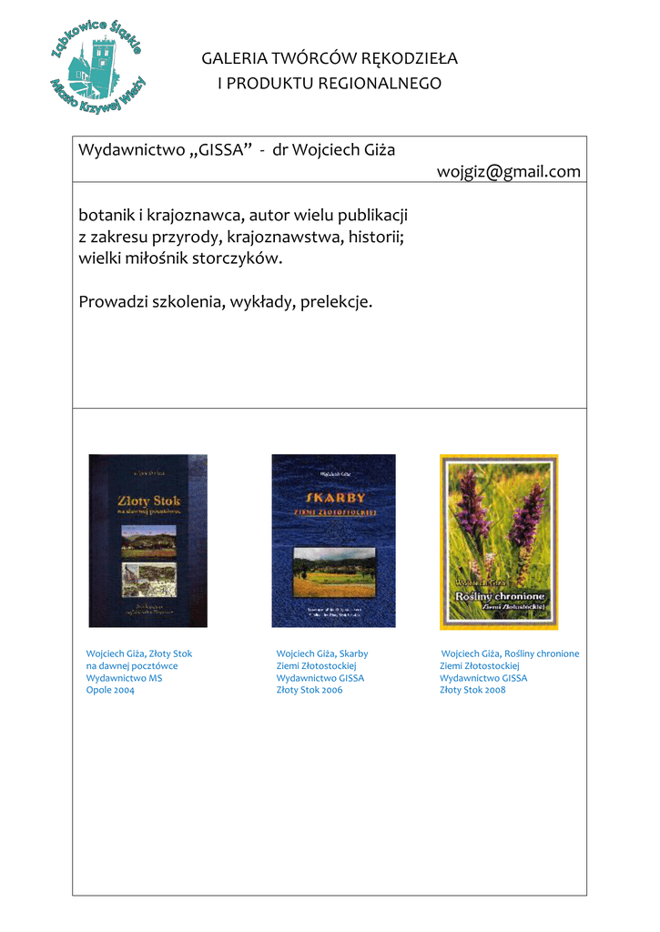 GALERIA TWÓRCÓW RĘKODZIEŁA I PRODUKTU REGIONALNEGO Wydawnictwo „GISSA” - dr Wojciech Giża [email protected] botanik i krajoznawca, autor wielu publikacji z zakresu przyrody, krajoznawstwa, historii; wielki miłośnik storczyków. Prowadzi szkolenia, wykłady, prelekcje. Wojciech Giża, Złoty Stok na dawnej pocztówce Wydawnictwo MS Opole 2004 Wojciech Giża, Skarby Ziemi Złotostockiej Wydawnictwo GISSA Złoty Stok 2006 Wojciech Giża, Rośliny chronione Ziemi Złotostockiej Wydawnictwo GISSA Złoty Stok 2008