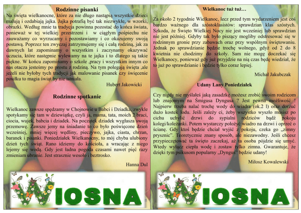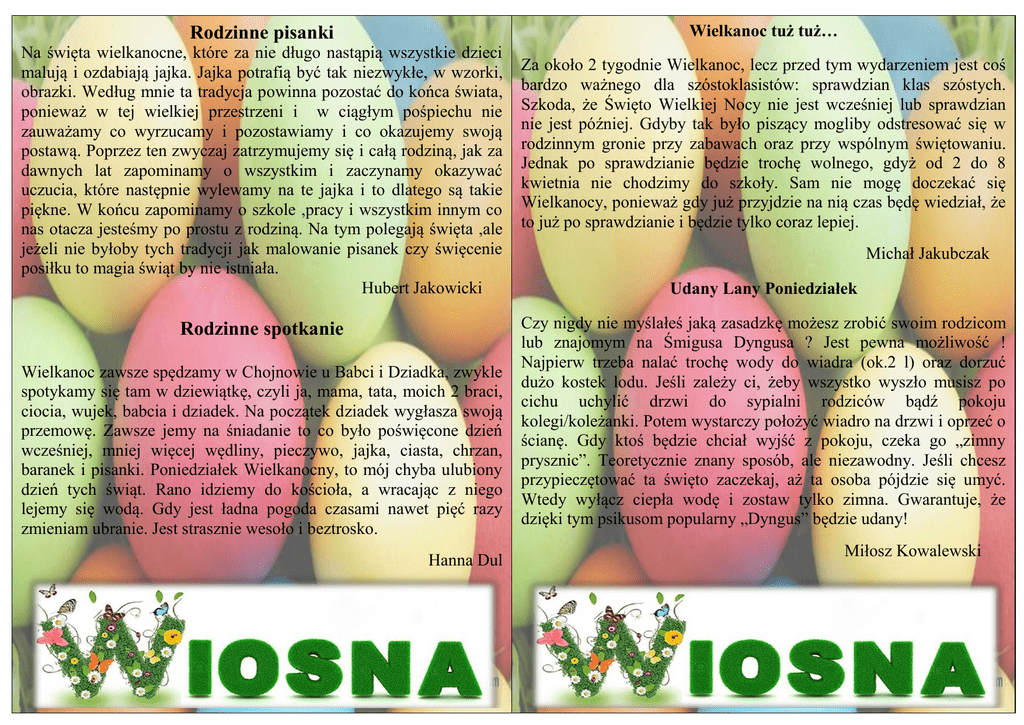 Wielkanoc tuż tuż… Rodzinne pisanki Na święta wielkanocne, które za nie długo nastąpią wszystkie dzieci malują i ozdabiają jajka. Jajka potrafią być tak niezwykłe, w wzorki, obrazki. Według mnie ta tradycja powinna pozostać do końca świata, ponieważ w tej wielkiej przestrzeni i w ciągłym pośpiechu nie zauważamy co wyrzucamy i pozostawiamy i co okazujemy swoją postawą. Poprzez ten zwyczaj zatrzymujemy się i całą rodziną, jak za dawnych lat zapominamy o wszystkim i zaczynamy okazywać uczucia, które następnie wylewamy na te jajka i to dlatego są takie piękne. W końcu zapominamy o szkole ,pracy i wszystkim innym co nas otacza jesteśmy po prostu z rodziną. Na tym polegają święta ,ale jeżeli nie byłoby tych tradycji jak malowanie pisanek czy święcenie posiłku to magia świąt by nie istniała. Hubert Jakowicki Rodzinne spotkanie Wielkanoc zawsze spędzamy w Chojnowie u Babci i Dziadka, zwykle spotykamy się tam w dziewiątkę, czyli ja, mama, tata, moich 2 braci, ciocia, wujek, babcia i dziadek. Na początek dziadek wygłasza swoją przemowę. Zawsze jemy na śniadanie to co było poświęcone dzień wcześniej, mniej więcej wędliny, pieczywo, jajka, ciasta, chrzan, baranek i pisanki. Poniedziałek Wielkanocny, to mój chyba ulubiony dzień tych świąt. Rano idziemy do kościoła, a wracając z niego lejemy się wodą. Gdy jest ładna pogoda czasami nawet pięć razy zmieniam ubranie. Jest strasznie wesoło i beztrosko. Hanna Dul Za około 2 tygodnie Wielkanoc, lecz przed tym wydarzeniem jest coś bardzo ważnego dla szóstoklasistów: sprawdzian klas szóstych. Szkoda, że Święto Wielkiej Nocy nie jest wcześniej lub sprawdzian nie jest później. Gdyby tak było piszący mogliby odstresować się w rodzinnym gronie przy zabawach oraz przy wspólnym świętowaniu. Jednak po sprawdzianie będzie trochę wolnego, gdyż od 2 do 8 kwietnia nie chodzimy do szkoły. Sam nie mogę doczekać się Wielkanocy, ponieważ gdy już przyjdzie na nią czas będę wiedział, że to już po sprawdzianie i będzie tylko coraz lepiej. Michał Jakubczak Udany Lany Poniedziałek Czy nigdy nie myślałeś jaką zasadzkę możesz zrobić swoim rodzicom lub znajomym na Śmigusa Dyngusa ? Jest pewna możliwość ! Najpierw trzeba nalać trochę wody do wiadra (ok.2 l) oraz dorzuć dużo kostek lodu. Jeśli zależy ci, żeby wszystko wyszło musisz po cichu uchylić drzwi do sypialni rodziców bądź pokoju kolegi/koleżanki. Potem wystarczy położyć wiadro na drzwi i oprzeć o ścianę. Gdy ktoś będzie chciał wyjść z pokoju, czeka go „zimny prysznic”. Teoretycznie znany sposób, ale niezawodny. Jeśli chcesz przypieczętować ta święto zaczekaj, aż ta osoba pójdzie się umyć. Wtedy wyłącz ciepła wodę i zostaw tylko zimna. Gwarantuje, że dzięki tym psikusom popularny „Dyngus” będzie udany! Miłosz Kowalewski