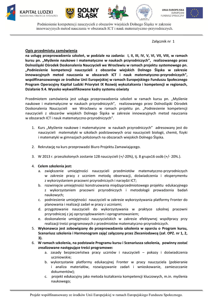 Załącznik nr 1 Opis przedmiotu zamówienia na usługę przeprowadzenia szkoleń, w podziale na zadania: I, II, III, IV, V, VI, VII, VIII, w ramach kursu pn. „Myślenie naukowe i matematyczne w naukach przyrodniczych”, realizowanego przez Dolnośląski Ośrodek Doskonalenia Nauczycieli we Wrocławiu w ramach projektu systemowego pn. „Podniesienie kompetencji nauczycieli z obszarów wiejskich Dolnego Śląska w zakresie innowacyjnych metod nauczania w obszarach ICT i nauk matematyczno-przyrodniczych”, współfinansowanego ze środków Unii Europejskiej w ramach Europejskiego Funduszu Społecznego Program Operacyjny Kapitał Ludzki Priorytet IX Rozwój wykształcenia i kompetencji w regionach, Działanie 9.4. Wysoko wykwalifikowane kadry systemu oświaty Przedmiotem zamówienia jest usługa przeprowadzenia szkoleń w ramach kursu pn. „Myślenie naukowe i matematyczne w naukach przyrodniczych”, realizowanego przez Dolnośląski Ośrodek Doskonalenia Nauczycieli we Wrocławiu w ramach projektu pn. „Podniesienie kompetencji nauczycieli z obszarów wiejskich Dolnego Śląska w zakresie innowacyjnych metod nauczania w obszarach ICT i nauk matematyczno-przyrodniczych”. 1. Kurs „Myślenie naukowe i matematyczne w naukach przyrodniczych” adresowany jest do nauczycieli matematyki w szkołach podstawowych oraz nauczycieli biologii, chemii, fizyki i matematyki w gimnazjach położonych na obszarach wiejskich Dolnego Śląska. 2. Rekrutację na kurs przeprowadzi Biuro Projektu Zamawiającego. 3. W 2013 r. przeszkolonych zostanie 128 nauczycieli (+/-20%), tj. 8 grupx16 osób (+/- 20%.). 4. Celem szkolenia jest: a. zwiększenie umiejętności nauczycieli przedmiotów matematyczno-przyrodniczych w zakresie pracy z uczniem metodą obserwacji, doświadczenia i eksperymentu z wykorzystaniem pracowni przyrodniczych i narzędzi ICT; b. rozwinięcie umiejętności konstruowania międzyprzedmiotowego projektu edukacyjnego z wykorzystaniem pracowni przyrodniczych i metodologii prowadzenia badań naukowych; c. podniesienie umiejętności nauczycieli w zakresie wykorzystywania platformy Fronter do planowania i realizacji zadań w pracy z uczniami; d. przygotowanie nauczycieli do wykorzystywania w praktyce szkolnej pracowni przyrodniczej z jej oprzyrządowaniem i oprogramowaniem; e. doskonalenie umiejętności nauczycielskich w zakresie efektywnej współpracy przy realizacji treści programowych z przedmiotów matematyczno-przyrodniczych. 5. Wykonawca jest zobowiązany do przeprowadzenia szkolenia w oparciu o Program kursu, Scenariusz szkolenia i Harmonogram zajęć załączony przez Zleceniodawcę (zał. OPZ. nr 1, 2, 3). 6. W ramach szkolenia, na podstawie Programu kursu i Scenariusza szkolenia, powinny zostać zrealizowane następujące treści programowe: a. zasady bezpieczeństwa pracy uczniów i nauczycieli – pokazy i doświadczenia uczniowskie; b. wykorzystanie platformy edukacyjnej Fronter w pracy nauczyciela (pobieranie i analiza materiałów, rozwiązywanie zadań i wnioskowanie, zamieszczanie dokumentów); c. projekt edukacyjny jako metoda kształcenia kompetencji kluczowych, m.in. myślenia naukowego; Projekt współfinansowany ze środków Unii Europejskiej w ramach Europejskiego Funduszu Społecznego. d. holistyczne programy edukacyjne jako sposób efektywnego integrowania treści matematyczno-przyrodniczych; e. metodologia prowadzenia doświadczeń i eksperymentów; f. efektywne wykorzystanie oprzyrządowania i oprogramowania pracowni przyrodniczej w celu podniesienia efektów kształcenia z zakresu przedmiotów matematyczno-przyrodniczych. g. współpraca nauczycieli przy realizacji holistycznych projektów edukacyjnych. 7. Szkolenie będzie prowadzone w formie zajęć stacjonarnych w pracowni przyrodniczej wskazanej przez Zamawiającego oraz w formie zajęć on-line prowadzonych na platformie edukacyjnej Fronter udostępnionej przez Zamawiającego. 8. Łączny wymiar szkolenia w ramach kursu to 44 godz. dydaktyczne (1 godz. dydaktyczna = 45 min.), w tym: a. w ramach zajęć stacjonarnych w pracowni przyrodniczej powinno zostać zrealizowane 32 godziny dydaktyczne w ciągu 4 dni szkoleniowych; b. w ramach szkolenia on-line powinno zostać zrealizowanych 12 godzin dydaktycznych. 9. Szkolenie powinno być realizowane z wykorzystaniem następujących metod: a. wykład – 3 godz. dydaktyczne, b. warsztaty – 5 godz. dydaktycznych, c. samodzielne ćwiczenia, ćwiczenia laboratoryjne (eksperyment, doświadczenie) – 16 godz. dydaktycznych, d. projektowanie – 8 godz. dydaktycznych e. on-line część szkolenia – 12 godz. dydaktycznych 10. W ramach części on-line szkolenia Wykonawca w szczególności: a. zamieszcza zadania i materiały edukacyjne na platformie edukacyjnej w odpowiednich salach – przy wsparciu administratora platformy edukacyjnej; b. sprawdza zadania wykonane przez uczestników kursu; c. opracowuje i zamieszcza komentarze dla uczestników kursu dotyczące wykonanych zadań. 11. Szkolenie on-line na platformie Fronter powinno być realizowane rytmicznie, w każdym tygodniu między terminami zajęć stacjonarnych w pracowni przyrodniczej, do ostatniego dnia zajęć stacjonarnych w pracowni przyrodniczej. 12. Wykonawca powinien opracować i przekazać do Biura Projektu Harmonogram realizacji szkolenia w formie zajęć on-line uwzględniający wskazówki Zamawiającego zawarte w opisie przedmiotu zamówienia. Harmonogram podlega weryfikacji i zatwierdzeniu przez Zamawiającego. 13. Termin zakończenia szkolenia przypada na ostatni dzień szkolenia stacjonarnego w pracowni przyrodniczej. 14. Miejsce szkolenia - szkolenia będą odbywać się zgodnie z podanym Harmonogramem szkoleń, w pracowniach przyrodniczych zlokalizowanych w: a. siedzibie DODN we Wrocławiu przy ul. Komuny Paryskiej 19a b. siedzibie DODN Filia w Legnicy przy ul. Skarbowej 5 c. na platformie edukacyjnej Fronter (część on-line) 15. Szkolenia w pracowni przyrodniczej realizowane będą w god