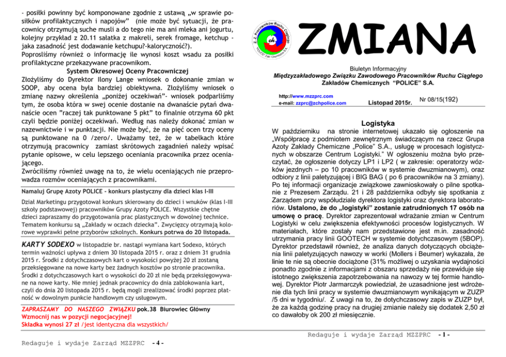 - posiłki powinny być komponowane zgodnie z ustawą „w sprawie po- siłków profilaktycznych i napojów” (nie może być sytuacji, że pracownicy otrzymują suche musli a do tego nie ma ani mleka ani jogurtu, kolejny przykład z 20.11 sałatka z makreli, serek fromage, ketchup jaka zasadność jest dodawanie ketchupu?-kaloryczność?). Poprosliśmy również o informację ile wynosi koszt wsadu za posiłki profilaktyczne przekazywane pracownikom. System Okresowej Oceny Pracowniczej Złożyliśmy do Dyrektor Ilony Lange wniosek o dokonanie zmian w SOOP, aby ocena była bardziej obiektywna. Złożyliśmy wniosek o zmianę nazwy określenia „poniżej oczekiwań”- wniosek podparliśmy tym, że osoba która w swej ocenie dostanie na dwanaście pytań dwanaście ocen ”raczej tak punktowane 5 pkt” to finalnie otrzyma 60 pkt czyli będzie poniżej oczekiwań. Według nas należy dokonać zmian w nazewnictwie i w punktacji. Nie może być, że na pięć ocen trzy oceny są punktowane na 0 /zero/. Uważamy też, że w tabelkach które otrzymują pracownicy zamiast skrótowych zagadnień należy wpisać pytanie opisowe, w celu lepszego oceniania pracownika przez oceniającego. Zwróciliśmy również uwagę na to, że wielu oceniających nie przeprowadza rozmów oceniających z pracownikami. Namaluj Grupę Azoty POLICE - konkurs plastyczny dla dzieci klas I-III Dział Marketingu przygotował konkurs skierowany do dzieci i wnuków (klas I-III szkoły podstawowej) pracowników Grupy Azoty POLICE. Wszystkie chętne dzieci zapraszamy do przygotowania prac plastycznych w dowolnej technice. Tematem konkursu są „Zakłady w oczach dziecka”. Zwycięzcy otrzymają kolorowe wyprawki pełne przyborów szkolnych. Konkurs potrwa do 20 listopada. KARTY SODEXO w listopadzie br. nastąpi wymiana kart Sodexo, których termin ważności upływa z dniem 30 listopada 2015 r. oraz z dniem 31 grudnia 2015 r. Środki z dotychczasowych kart o wysokości powyżej 20 zł zostaną przeksięgowane na nowe karty bez żadnych kosztów po stronie pracownika. Środki z dotychczasowych kart o wysokości do 20 zł nie będą przeksięgowywane na nowe karty. Nie mniej jednak pracownicy do dnia zablokowania kart, czyli do dnia 20 listopada 2015 r. będą mogli zrealizować środki poprzez płatność w dowolnym punkcie handlowym czy usługowym. ZAPRASZAMY DO NASZEGO ZWIĄZKU pok.38 Biurowiec Główny Wzmocnij nas w pozycji negocjacyjnej! Składka wynosi 27 zł /jest identyczna dla wszystkich/ Od ZMIANA Biuletyn Informacyjny Międzyzakładowego Związku Zawodowego Pracowników Ruchu Ciągłego Zakładów Chemicznych “POLICE” S.A. http://www.mzzprc.com e-mail: [email protected] Listopad 2015r. Nr 08/15(192) Logistyka W październiku na stronie internetowej ukazało się ogłoszenie na „Współpracę z podmiotem zewnętrznym świadczącym na rzecz Grupa Azoty Zakłady Chemiczne „Police” S.A., usługę w procesach logistycznych w obszarze Centrum Logistyki.” W ogłoszeniu można było przeczytać, że ogłoszenie dotyczy LP1 i LP2 ( w zakresie: operatorzy wózków jezdnych – po 10 pracowników w systemie dwuzmianowym), oraz odbiory z linii paletyzującej i BIG BAG ( po 6 pracowników na 3 zmiany). Po tej informacji organizacje związkowe zawnioskowały o pilne spotkanie z Prezesem Zarządu. 21 i 28 października odbyły się spotkania z Zarządem przy współudziale dyrektora logistyki oraz dyrektora laboratoriów. Ustalono, że do „logistyki” zostanie zatrudnionych 17 osób na umowę o pracę. Dyrektor zaprezentował wdrażanie zmian w Centrum Logistyki w celu zwiększenia efektywności procesów logistycznych. W materiałach, które zostały nam przedstawione jest m.in. zasadność utrzymania pracy linii GOOTECH w systemie dotychczasowym (5BOP). Dyrektor przedstawił również, że analiza danych dotyczących obciążenia linii paletyzujących nawozy w worki (Mollers i Beumer) wykazała, że linie te nie są obecnie dociążone (31% możliwej o uzyskania wydajności ponadto zgodnie z informacjami z obszaru sprzedaży nie przewiduje się istotnego zwiększenia zapotrzebowania na nawozy w tej formie handlowej. Dyrektor Piotr Jarmarczyk powiedział, że uzasadnione jest wdrożenie dla tych linii pracy w systemie dwuzmianowym wynikającym w ZUZP /5 dni w tygodniu/. Z uwagi na to, że dotychczasowy zapis w ZUZP był, że za każdą godzinę pracy na drugiej zmianie należy się dodatek 2,50 zł co dawałoby ok 200 zł miesięcznie. Redaguje i wydaje Zarząd MZZPRC Redaguje i wydaje Zarząd MZZPRC -4- -1- Wynegocjowaliśmy z Zarządem, że dodatek za pracę na 2BOP będzie wynosił 300 zł a wynagrodzenie zasadnicze pracowników przenoszonych z 5BOP na 2BOP wzrośnie o 400 zł. Związki zawodowe zgłosiły do Przedstawiciela Załogi w Zarządzie Pana Rafała, aby Dyrektor Logistyki Pan Piotr Jarmarczyk zorganizował spotkania z pracownikami Logistyki i aby spotkania te odbyły się z udziałem związków zawodowych. Laboratoria Dyrektor Laboratoriów Pani Beata Wawrzyniak zaprezentowała „Optymalizację pracy w laboratoriach”. Poinformowała, zmniejsza uciążliwość pracy kobiet w Centrum poprzez: -uruchomienie od lipca 2016 inwestycji „Monitoring parametrów fizykochemicznych cieczy przy instalacjach produkcyjnych JB Nitro, JB Nawozy, Centrum Energetyki –Opomiarowanie on-line”, - przeniesienie części zadań na pracowników produkcyjnych JB Nawozy (IQ 2016r.), -poprzez docelową zmianę systemu pracy zmianowej z 5BOP na 2BOP w Laboratorium Ochrony Środowiska. -zmniejszenie ilości analiz, -usprawnienie systemu logistyki próbek, -implementację systemu klasy LIMS, -zakup sprzętu laboratoryjnego (m.in. chromatograf gazowy, wielkokanałowy analizator do badania składu nawozów, aparat do badania twardości nawozów, dyfraktometr rentgenowski, ASA)-co wiąże się z zamianą klasycznych analiz na instrumentalne. Optymalizacja pracy ma się opierać o: -fizyczną konsolidację laboratoriów, -
