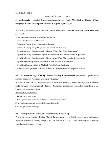 O. 0012.3.14.2012 PROTOKÓŁ NR 14/2012 z posiedzenia Komisji Społeczno-Gospodarczej Rady Miejskiej w Książu Wlkp. odbytego w dniu 22 listopada 2012 roku w godz. 9,00 – 13,20. W Komisji uczestniczyło 8 radnych - lista obecności, stanowi załącznik do niniejszego protokołu. Ponadto w posiedzeniu Komisji uczestniczyli: - Burmistrz Pan Teofil Marciniak, - Sekretarz Gminy Pani Mirela Grześkowiak, - Przewodniczący Rady Miejskiej Pan Paweł Walkowiak, - Dyrektor Szkoły Podstawowej w Książu Wlkp. Pan Piotr Radwański - Dyrektor Szkoły Podstawowej w Chwałkowie Kośc. Pani Elżbieta Kapcińska - Dyrektor Szkoły Podstawowej w Konarzycach Pani Małgorzata Krzeszewska - Dyrektor Gimnazjum w Książu Wlkp. Pan Wojciech Świdurski - Dyrektor Zespołu Szkół w Mchach Pani Barbara Kapturek - Prezes Stowarzyszenia na Rzecz Szkoły w Chrząstowie Pan Zbigniew Szozda ad.1. Przewodniczący Komisji Radny Maciej Lewandowski otwierając posiedzenie powitał członków Komisji i zaproszonych gości. Stwierdził, że na sali są obecni wszyscy członkowie Komisji, zatem Komisja jest władna do podejmowania prawomocnych decyzji. Następnie przedstawił porządek posiedzenie, do którego nie wniesiono uwag. Porządek posiedzenia: 1.Otwarcie posiedzenia. 2.Funkcjonowanie oświaty na terenie Gminy Książ Wlkp. 3.Przyjęcie protokołu z poprzedniego posiedzenia. 4.Wolne głosy i informacje. ad.2. Funkcjonowanie oświaty na terenie Gminy Książ Wlkp. Przewodniczący Komisji Radny Maciej Lewandowski – w 2008 roku została uchwalona Polityka oświatowa Gminy Książ Wlkp. na lata 2008 – 2013. Dziś omówimy co z założeń zostało zrealizowane a co nie. 1 Przewodniczący Komisji omówił analizę SWOT, która przedstawiała się następująco: Mocne strony: 1. Wykwalifikowana kadra pedagogiczna, nastawiona na stałe podnoszenie wiedzy; 2. Zaangażowanie nauczycieli w pracę dydaktyczno-wychowawczą skutkujące sukcesami wychowanków w różnych dziedzinach życia; 3. Dobre wyniki sprawdzianu w klasach VI i egzaminów gimnazjalnych; 4. Znajomość przez nauczycieli uczniów i ich środowiska; 5. Wysoki stopień poczucia bezpieczeństwa w placówkach; 6. Funkcjonowanie klas specjalnych oraz realizacja nauczania indywidualnego i prowadzenie zajęć rewalidacyjnych; 7. Objęcie wszystkich uczniów opieką pedagoga i psychologa, prowadzenie zajęć logopedycznych (począwszy od przedszkola); 8.Objęcie opieką (w ramach świetlic opiekuńczo-wychowawczych)ze środowisk najuboższych i rodzin patologicznych; 9.Dobrze wyposażone pracownie informatyczne ze stałym łączem do Internetu; 10.Dobrze wyposażone sale lekcyjne w pomoce dydaktyczne; 11.Stosunkowo dobre wyposażenie istniejących sal gimnastycznych w sprzęt; 12.Funkcjonowanie bibliotek szkolnych w każdej placówce; 13.Zaangażowanie społeczności szkolnych w realizowaniu programów ekologicznych o zasięgu ogólnopolskim, np. „Sprzątanie Świata, Dni Ziemi”; 14.Dobra współpraca szkół z rodzicami i instytucjami lokalnymi ( organem prowadzącym, sołtysami i radami sołeckimi, OSP, Policją, Centrum Kultury); 15.Organizowanie imprez integrujących społeczność szkolną i lokalną; 16.Prawidłowo zorganizowana pomoc socjalna; 17.Objęcie dożywianiem dzieci z najuboższych rodzin. Słabe strony: 1. Brak zracjonalizowanej sieci szkół; 2. Istnienie klas łączonych; 3. Brak racjonalnej polityki dokształcania nauczycieli w stosunku do potrzeb szkół; 4. Brak wykwalifikowanych nauczycieli do nauki języków obcych; 5. Niedostateczna ilość kółek zainteresowań; 6.Brak pełnowymiarowych sal gimnastycznych i niedostateczna oferta zajęć sportowych; 7 Brak dobrze wyposażonych pracowni do nauki języków obcych; 2 8. Niewystarczająca liczba toalet w szkołach; 9.Brak szatni i przebieralni; 10.Istnienie barier architektonicznych; 11.Brak monitoringu na zewnątrz i wewnątrz szkół; 12.Wymagający prac remontowo-renowacyjnych stan techniczny obiektów szkolnych (stolarka okienna, pokrycia dachowe, ocieplenie budynków, malowanie izb lekcyjnych), 13. Konieczność dowożenia dzieci do szkół tzw. przyczepami szkolnymi; 14. Brak zaangażowania szkół w pozyskiwanie środków z funduszy pozagminnych; Następnie omówiono jakie były potrzeby inwestycyjne na lata 2008-2013 oraz co zrealizowano. W Szkole Podstawowej im. Wiosny Ludów w Książu Wielkopolskim i Gimnazjum im. Dr. Maksymiliana Krybusa w Książu Wielkopolskim potrzeby inwestycyjne były następujące: - ocieplenie dachu, - dokończenie wymiany stolarki okiennej, - wymiana drzwi wejściowych do budynku, - wymiana wykładzin w izbach lekcyjnych, - generalny remont szatni przy Sali gimnastycznej, - adaptacja pomieszczeń na dodatkowe toalety dla uczniów i nauczycieli, - malowanie korytarzy i dostosowanie ich wystroju do współczesnych standardów, - malowanie izb lekcyjnych, - adaptacja pomieszczeń na potrzeby internetowego centrum multimedialnego, - adaptacja pomieszczeń po byłej kotłowni na salę lekcyjną, - budowa utwardzonego parkingu przy szkole, - założenie systemu monitoringu na terenie szkoły oraz w jej otoczeniu. Dyrektor Szkoły Pan Piotr Radwański poinformował, że z w/w zadań nie zrealizowano następujących zadań: - nie wymieniono we wszystkich izbach lekcyjnych wykładzin, - malowanie korytarzy i dostosowanie ich wystroju do współczesnych standardów zrealizowano częściowo, - malowanie izb lekcyjnych trwa cały czas. Dyrektor poinformował, że jest potrzeba wymiany instalacji elektrycznej. W tym roku zmniejszyły się dwa oddziały i odeszły z pracy dwie Panie, zaoszczędzone środki finansowe 3 przeznaczone będą na sprawy elektryczne i na salę komputerową. Zakupione będą 24 laptopy dla dzieci najmłodszych. Muszą być wykonane pomiary odgromowe i elektryczne oraz zwiększona moc prądu. Inne potrzeby szkoły, to w 2014 roku do szkoły trafią trzy dodatkowe oddziały, a nie ma dla nich miejsca, prawdopodobnie dzieci te będą musia